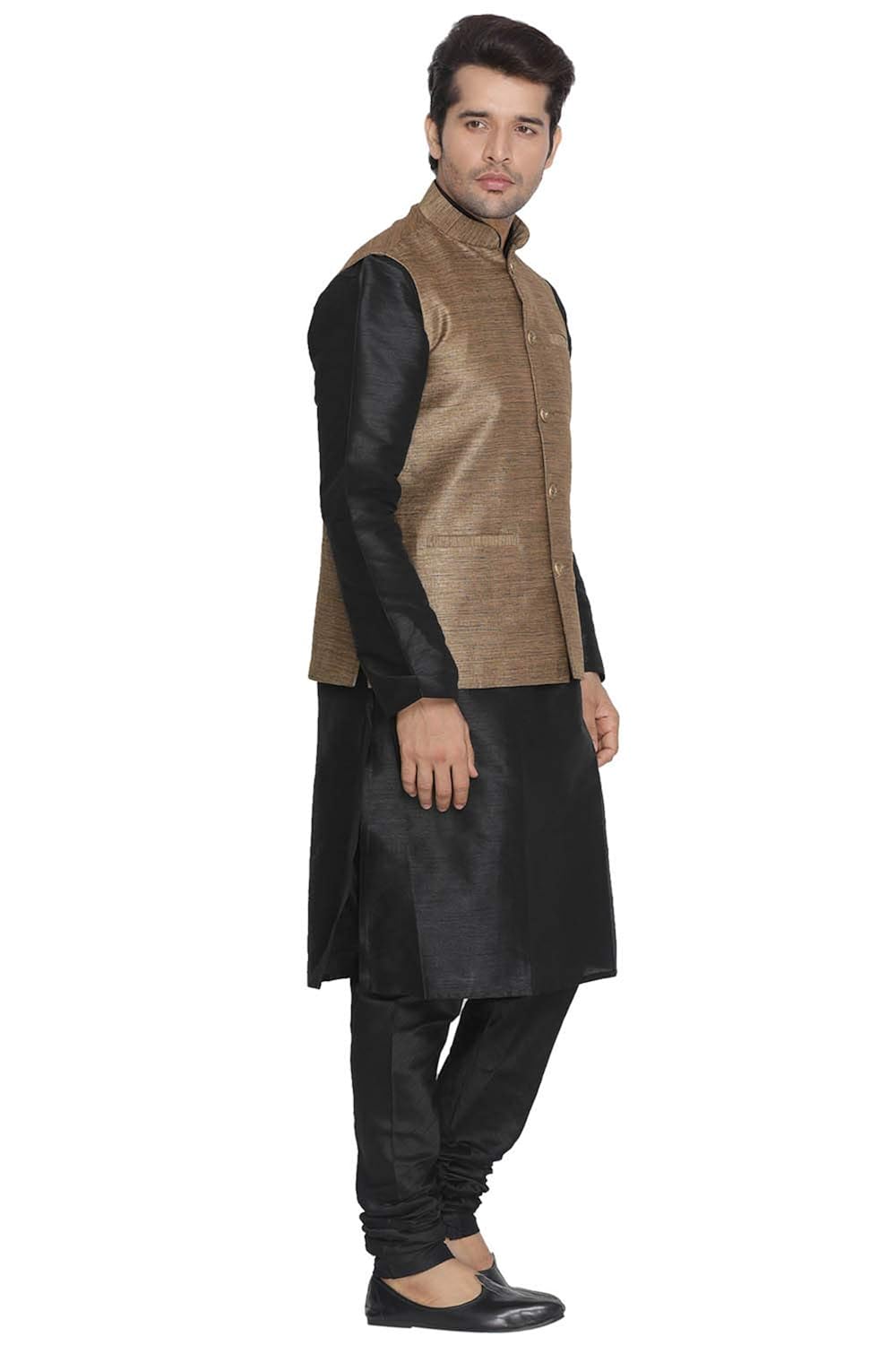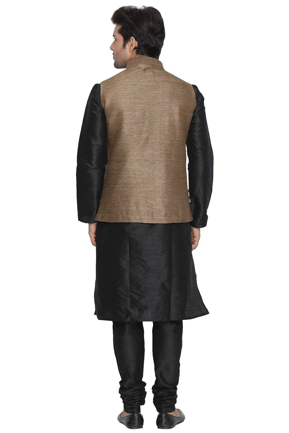 Vastramay brings to you this Stylish yet Comfortable Men Coffee and Black Modi Jacket with Detachable Cowl Style Stole With Kurta and Churidar Pyjama Set. Adorn it for a perfect Classy & Trendy look. Pair it with a juti or a mojari for the Royal feel. |
