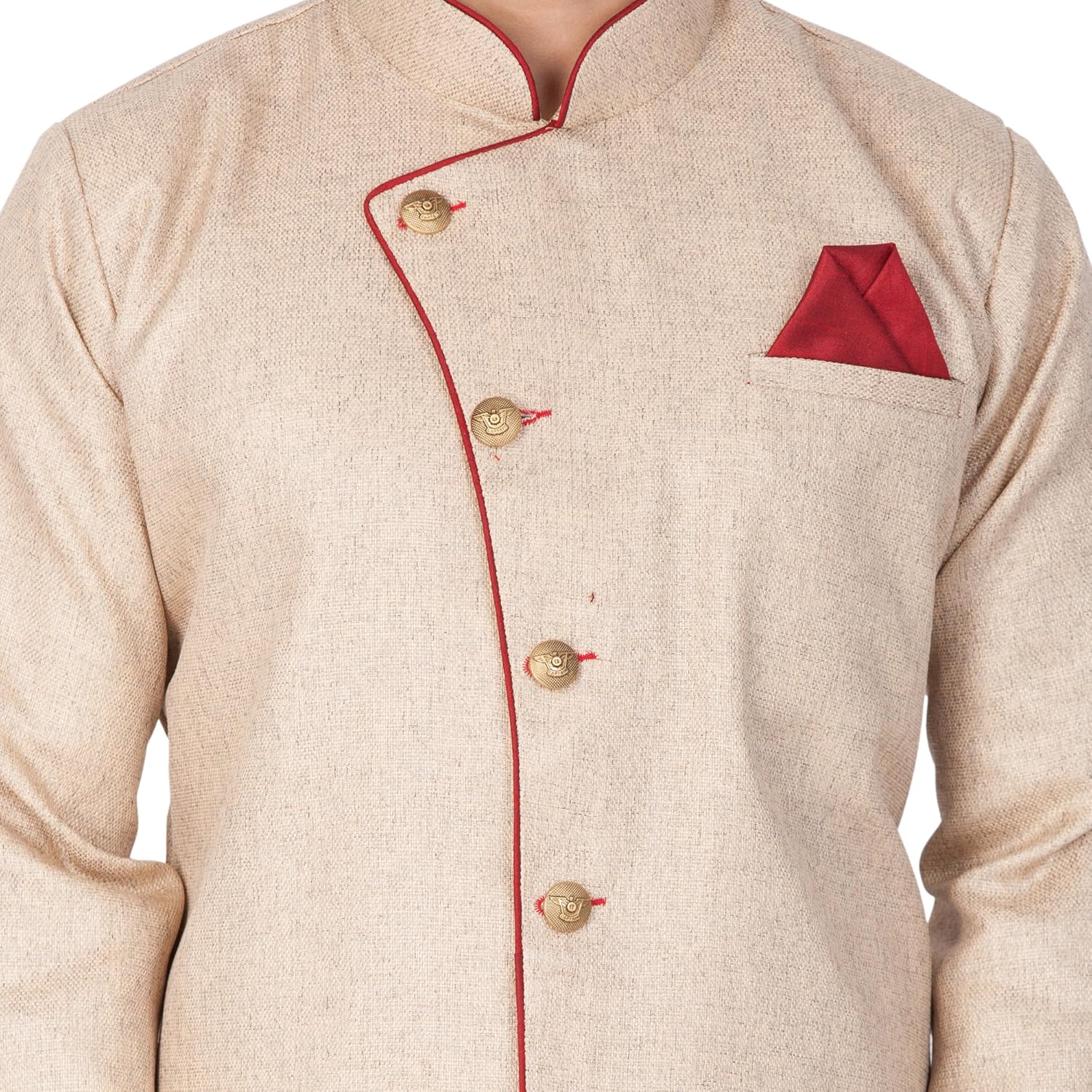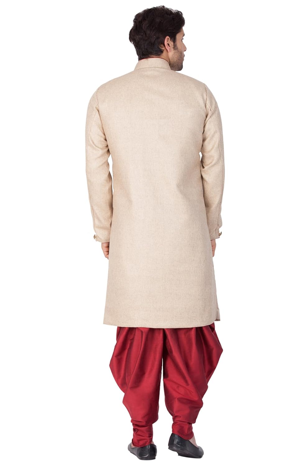 Vastramay brings to you this Stylish yet Comfortable Men Biscuit Men Beige Jute Feel Indowestern Angrakha Style Sherwani With Cowl Style Patiala Dhoti Pant Set. Adorn it for a perfect Classy & Trendy look. Pair it with a juti or a mojari for the Royal look. |