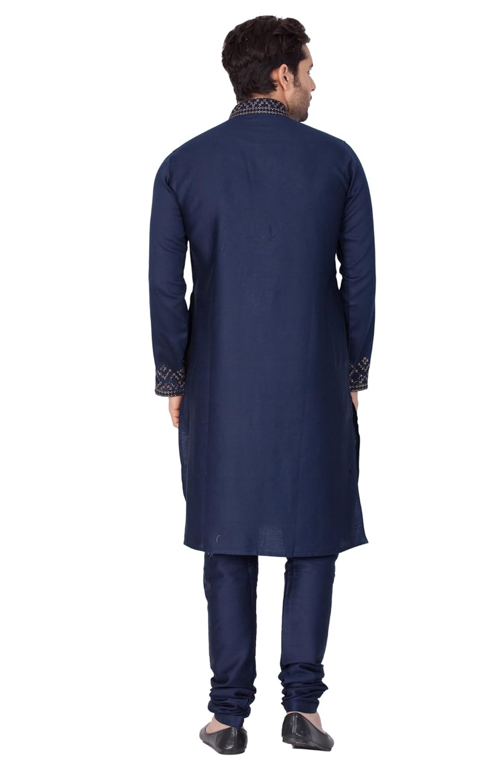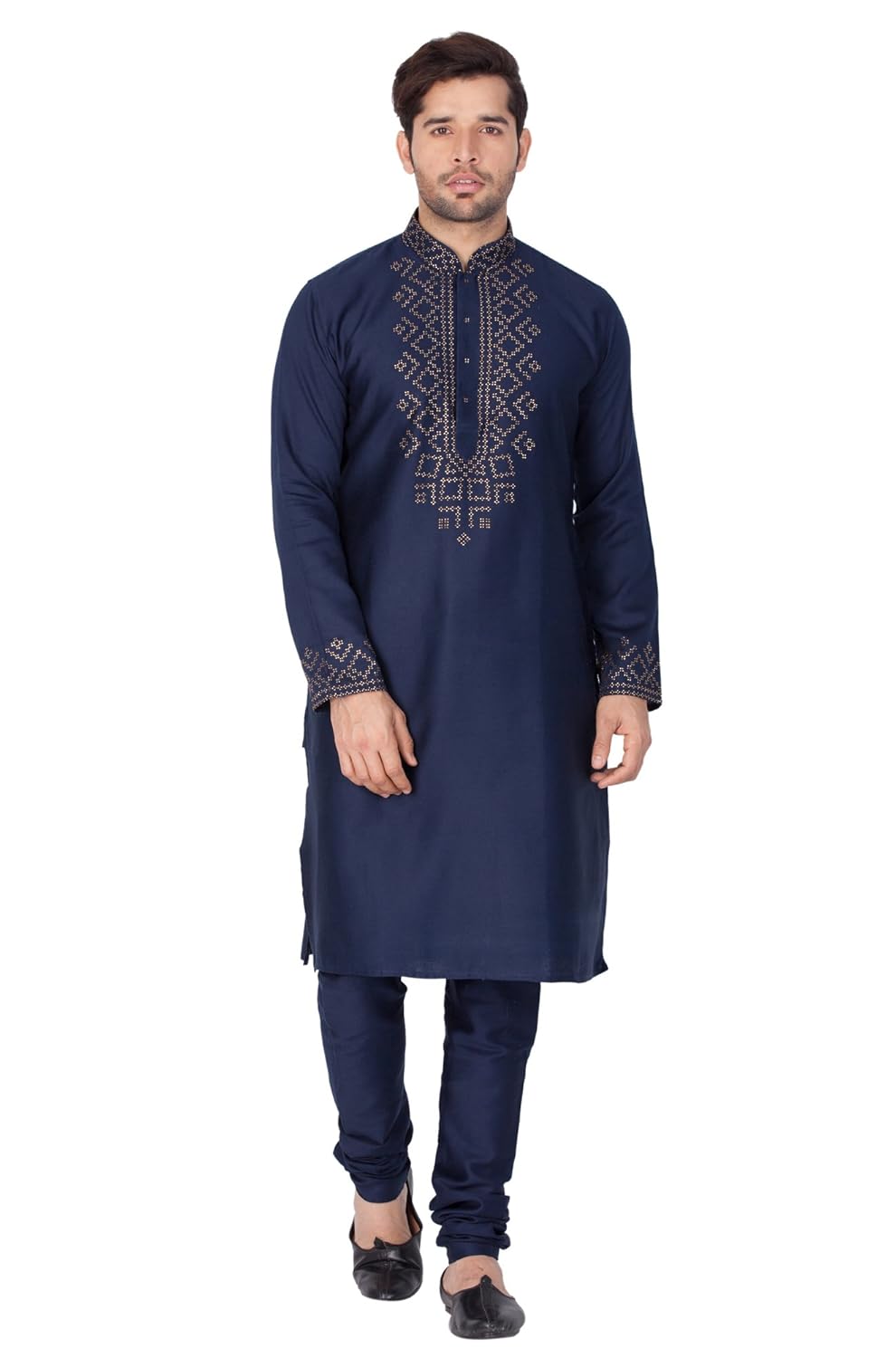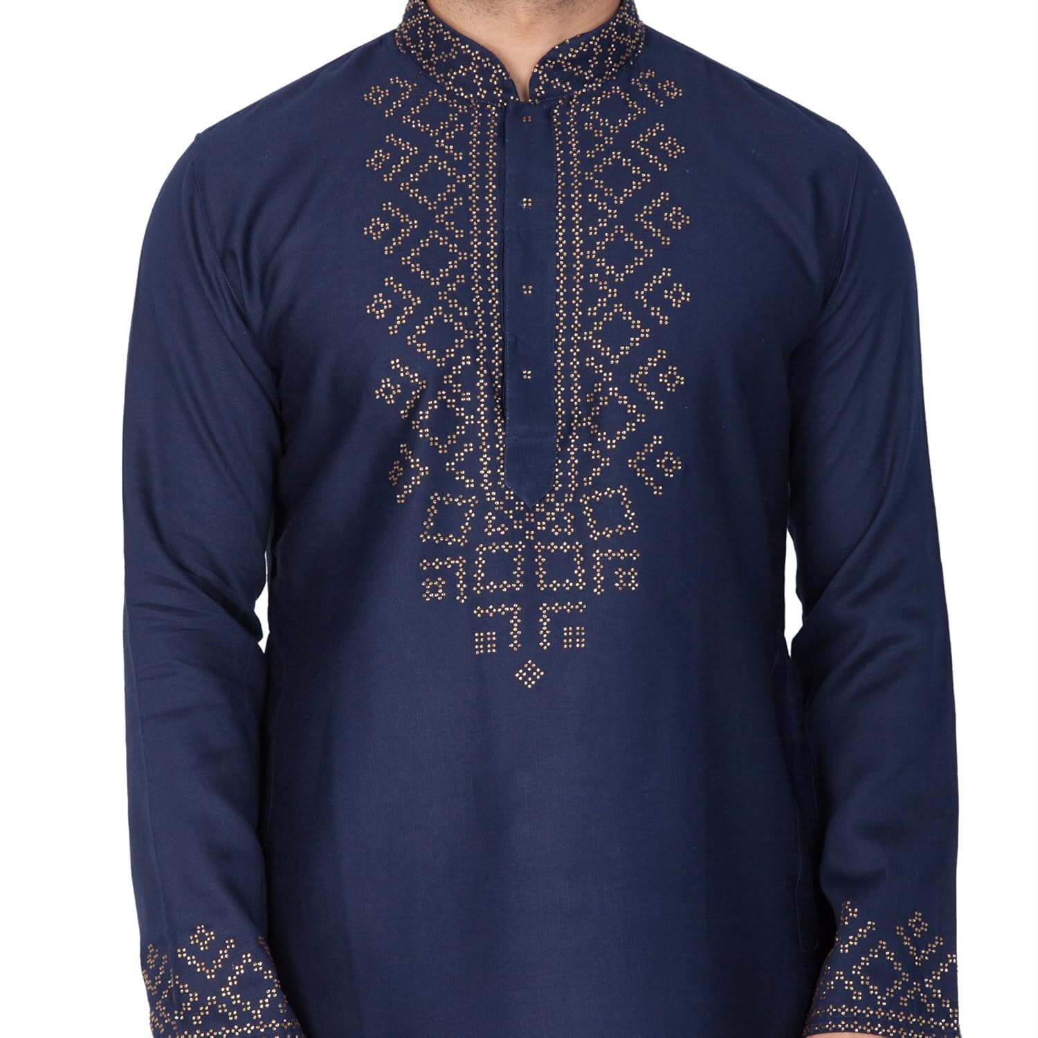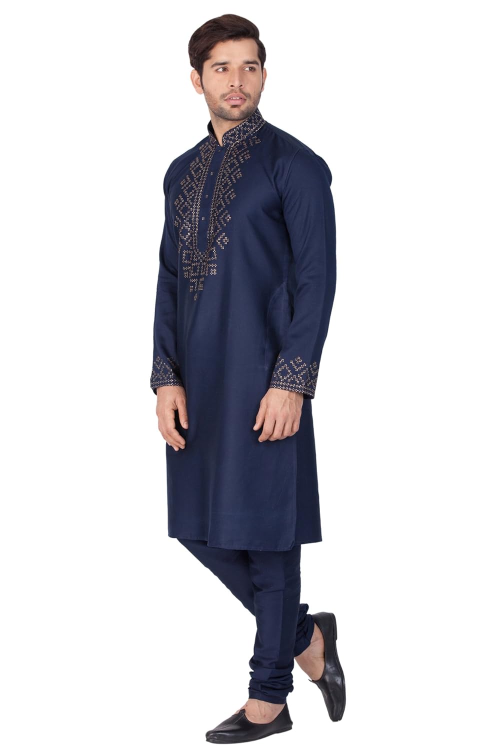 Vastramay brings to you this Stylish yet Comfortable Men Navy Blue Men Soft Shiny Cotton Kurta with Inticate Stone Designer Motif on Yoke and Cuff paired with a Churidar Pyjama Set.. Adorn it for a perfect Classy & Trendy look. Pair it with a juti or a mojari for the Royal look. |