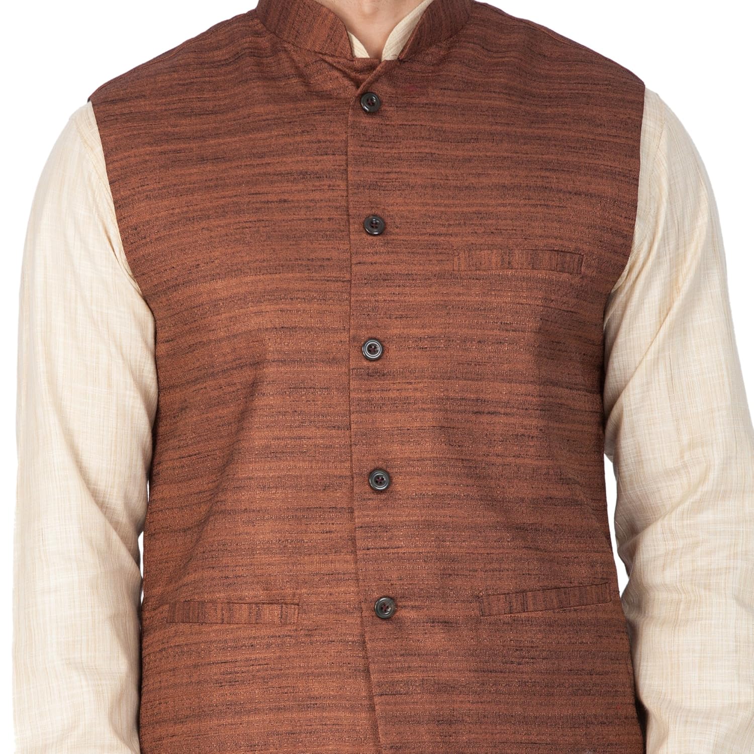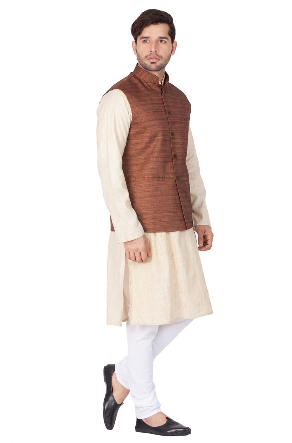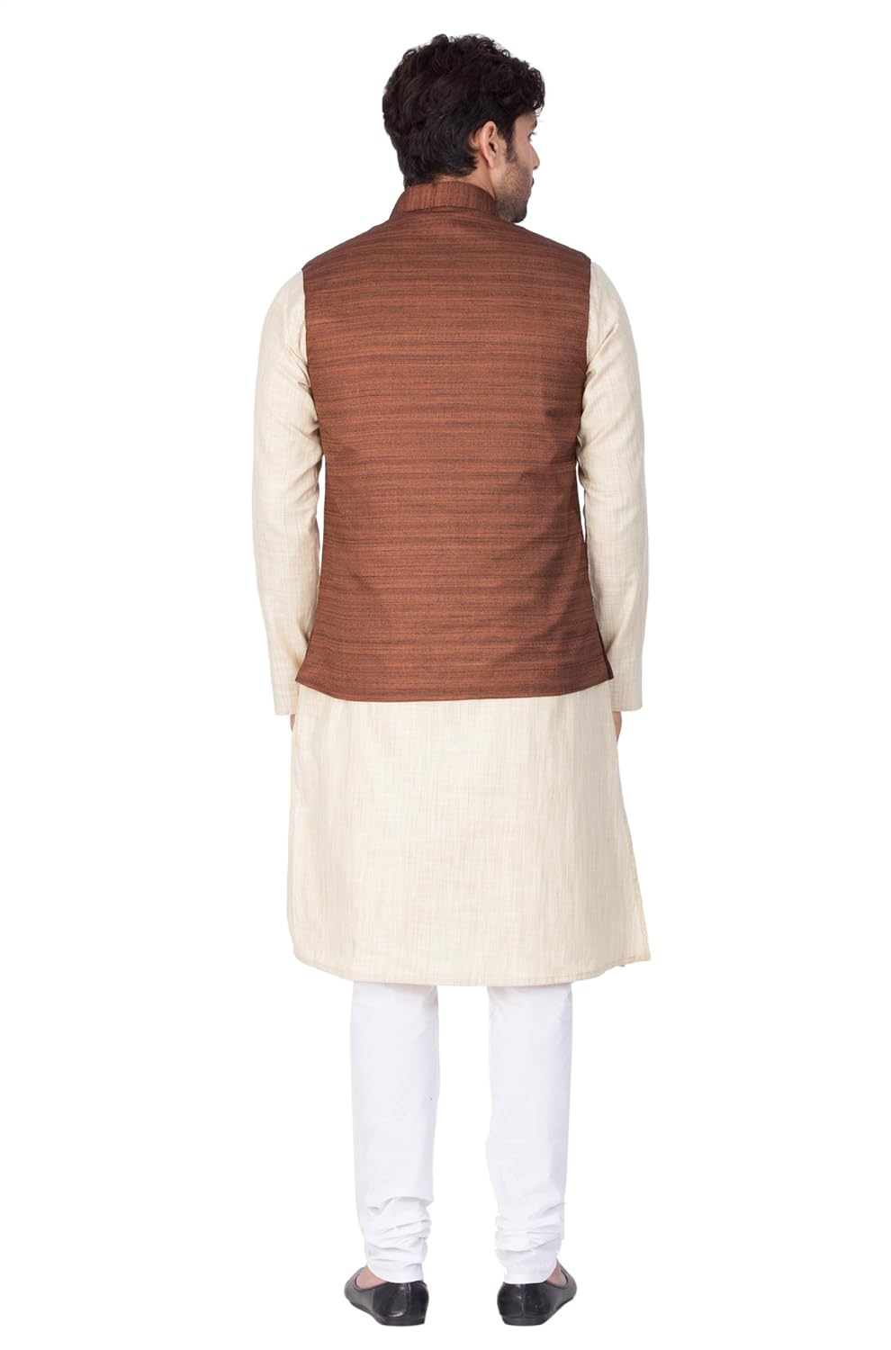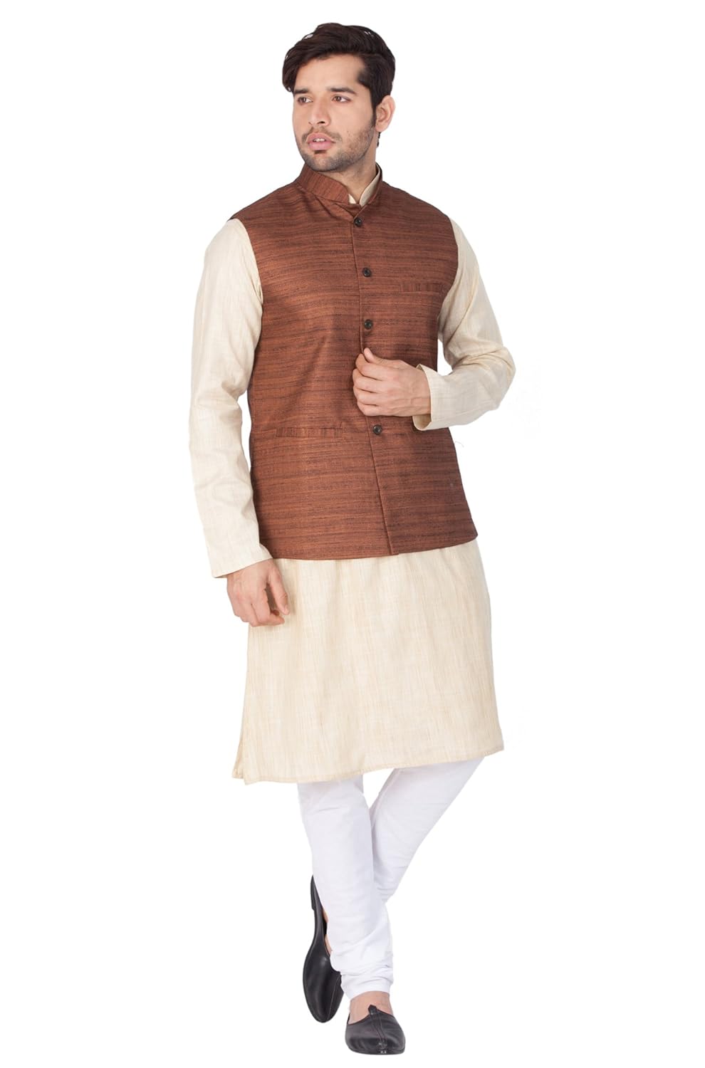 Vastramay brings to you this Stylish yet Comfortable Men Beige Men Bhagalpuri Matka Feel Blended Cotton Modi Jacket, a Cotton Self Design Kurta and Pyjama Set. Adorn it for a perfect Classy & Trendy look. Pair it with a juti or a mojari for the Royal look. |