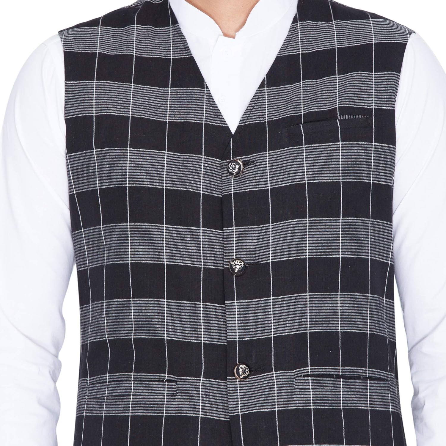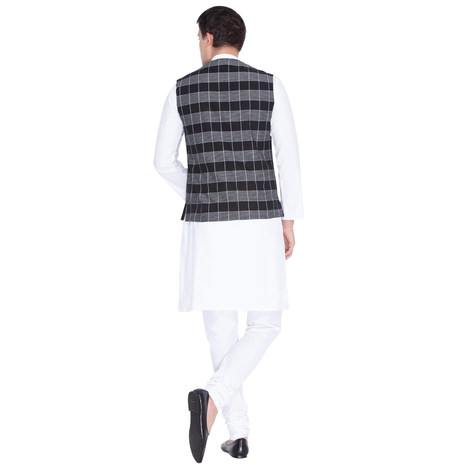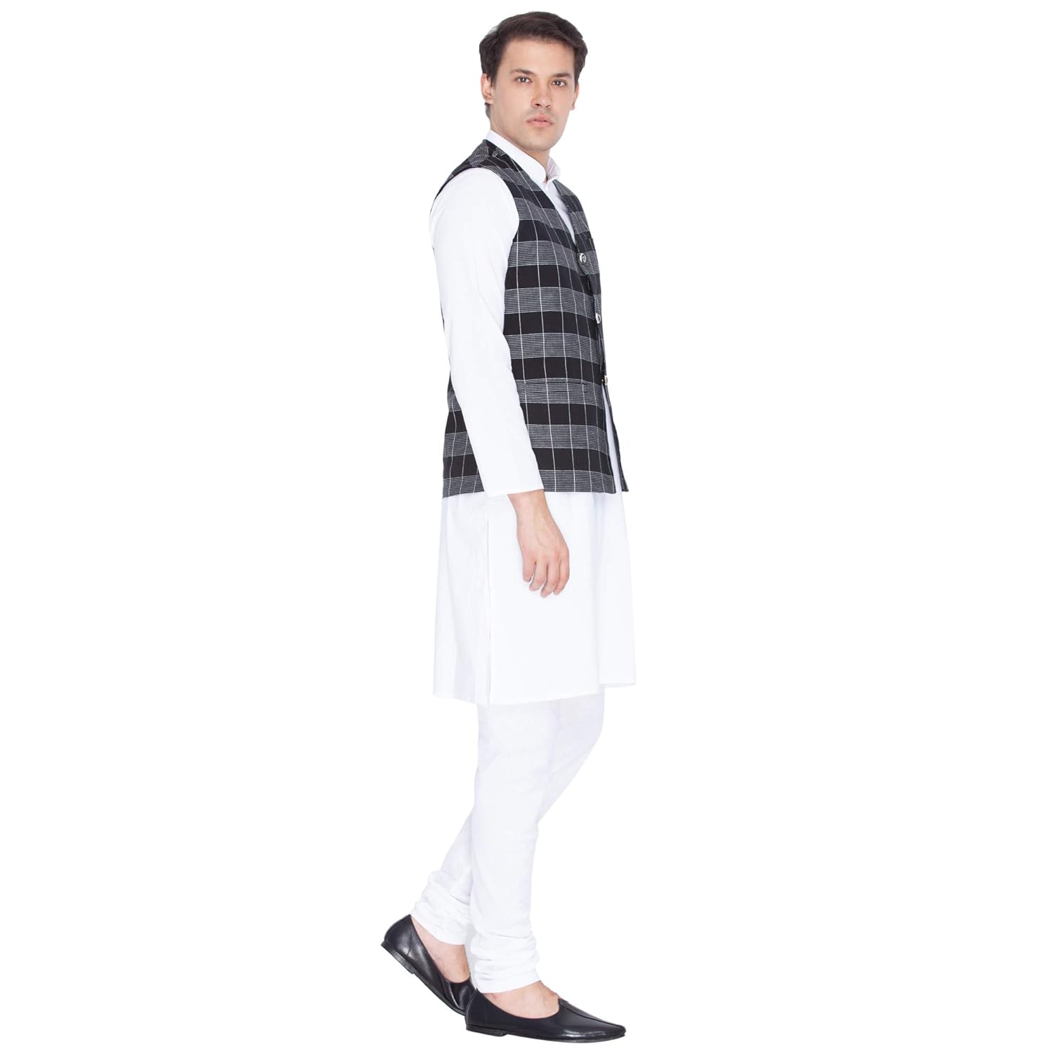 Vastramay brings to you this Stylish yet Comfortable Men Black and White Linen Cotton Khadi Feel V Neck Modi Jacket and White Cotton Kurta with Churidar Pyjama Set. Adorn it for a perfect Classy & Trendy look. Pair it with a juti or a mojari for the Royal feel. |