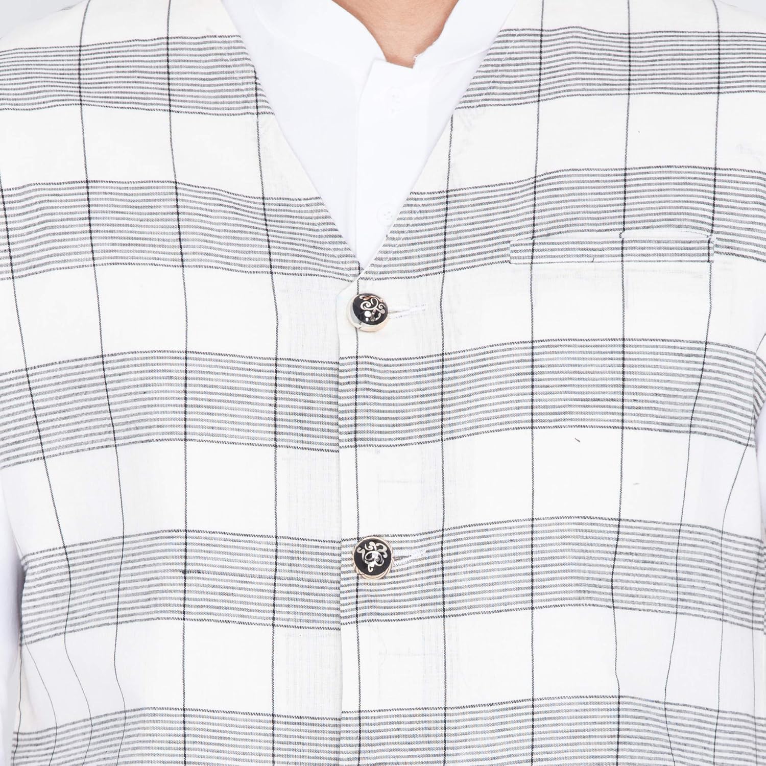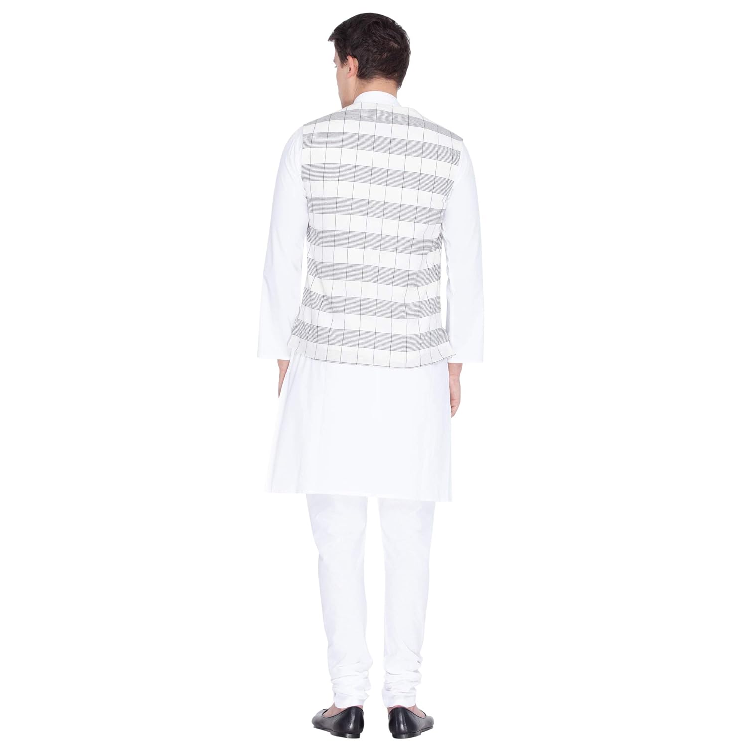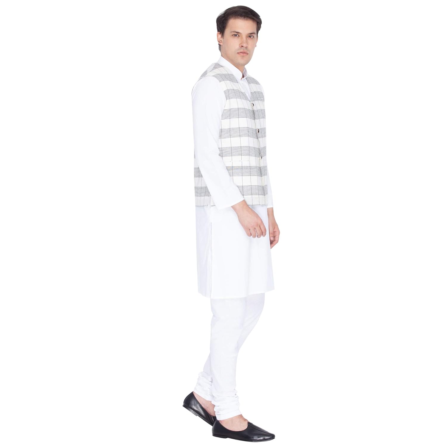 Vastramay brings to you this Stylish yet Comfortable Men White and Black Linen Cotton Khadi Feel V Neck Modi Jacket and White Cotton Kurta with Churidar Pyjama Set. Adorn it for a perfect Classy & Trendy look. Pair it with a juti or a mojari for the Royal feel. |