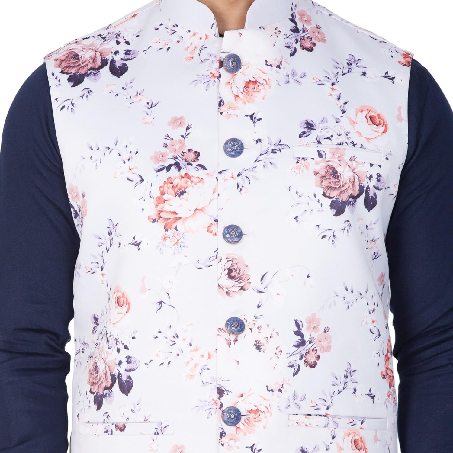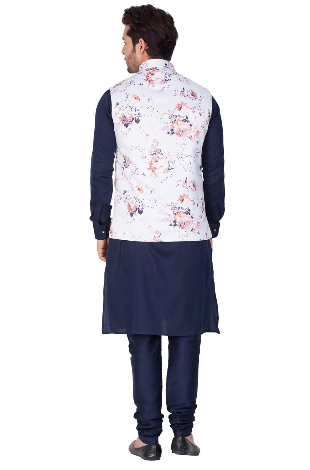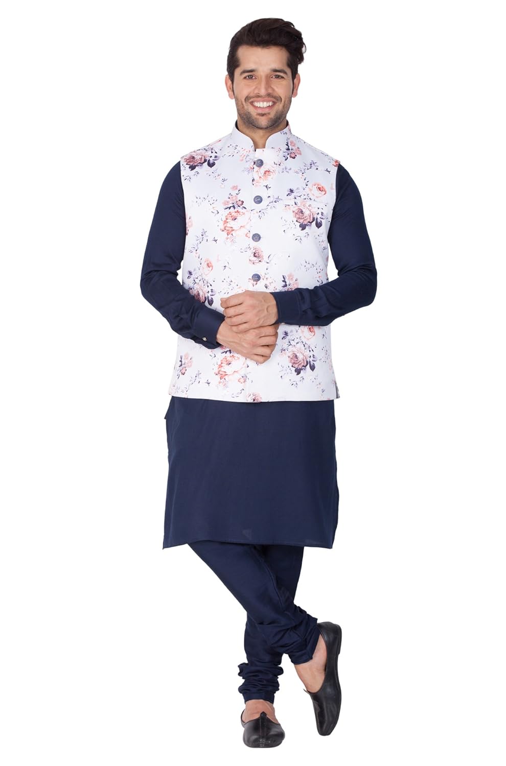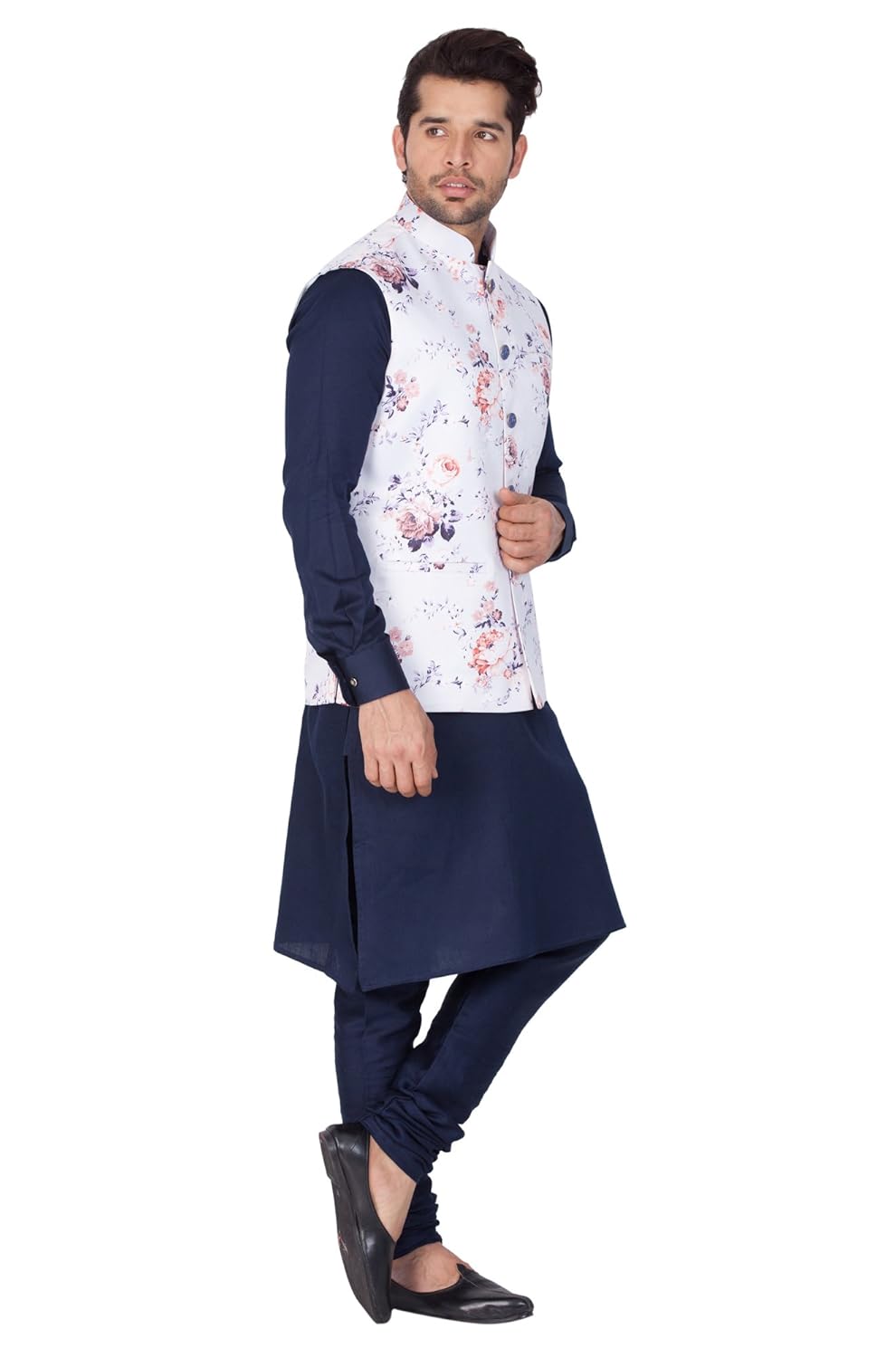 Vastramay brings to you this Stylish yet Comfortable Men Navy Blue Men Digital Floral Print on Soft Cotton Satin Modi Jacket, Soft Shiny Cotton Kurta with a Buttoned Cuff Styling paired with a Churidar Pyjama Set.. Adorn it for a perfect Classy & Trendy look. Pair it with a juti or a mojari for the Royal look. |
