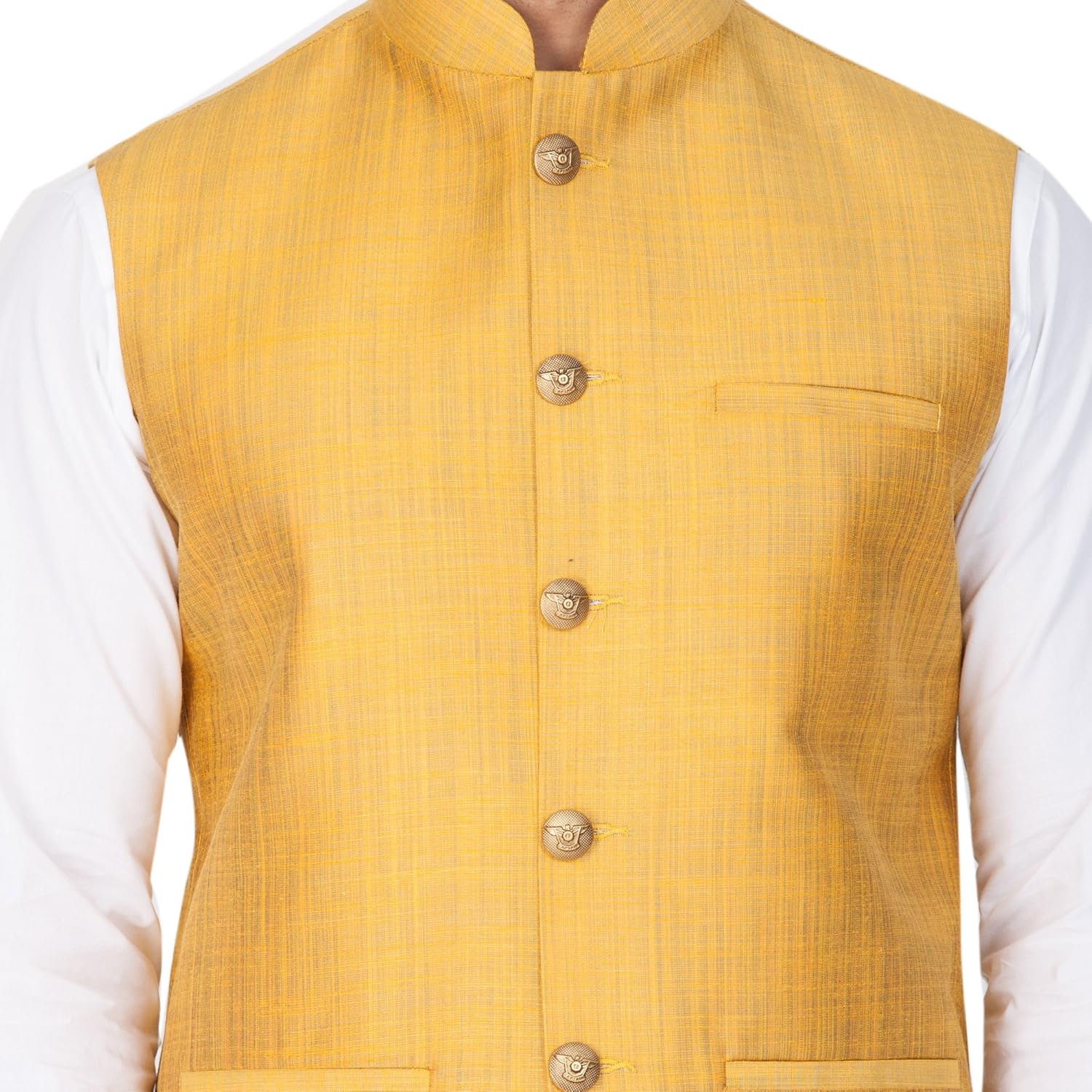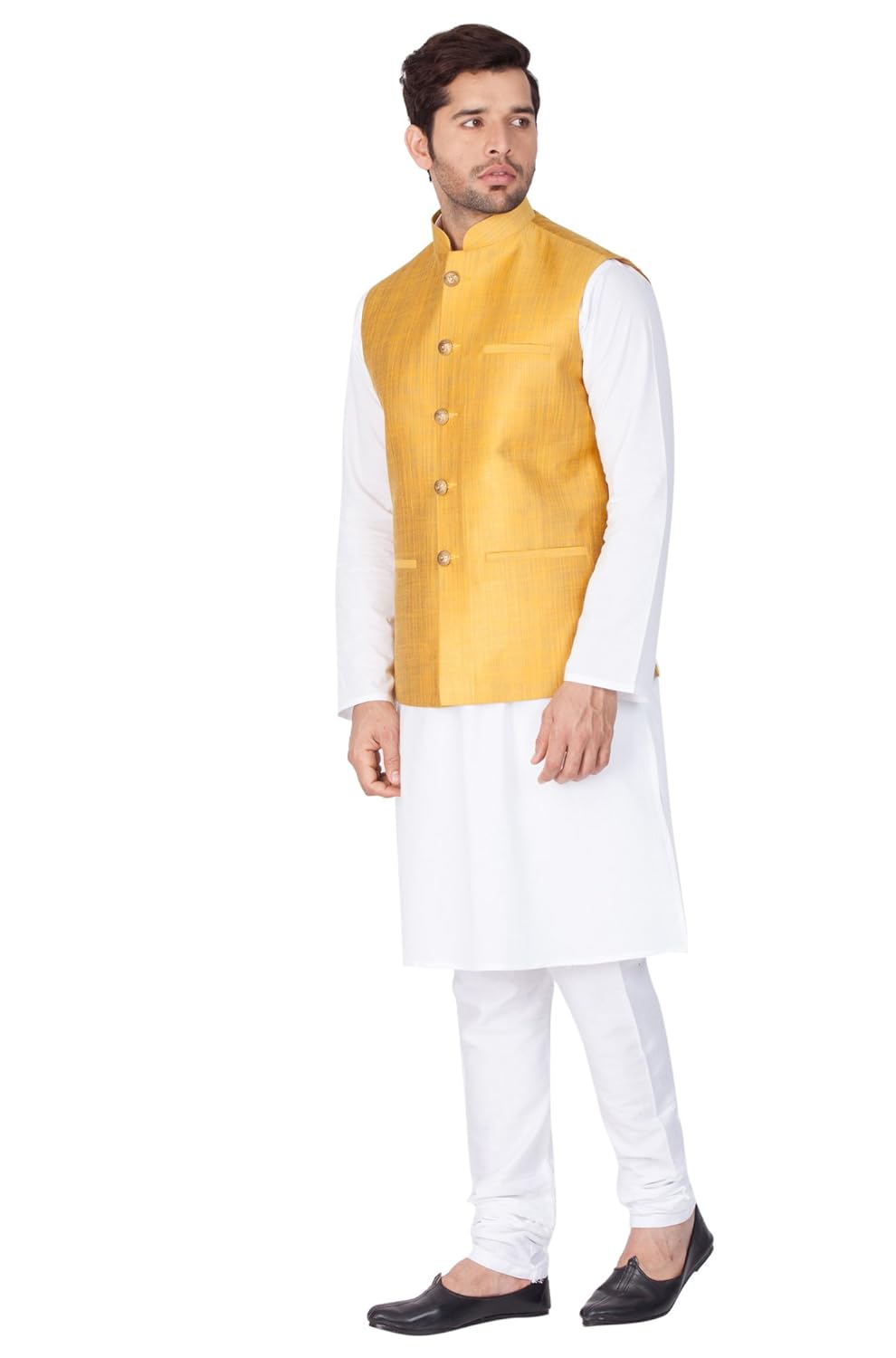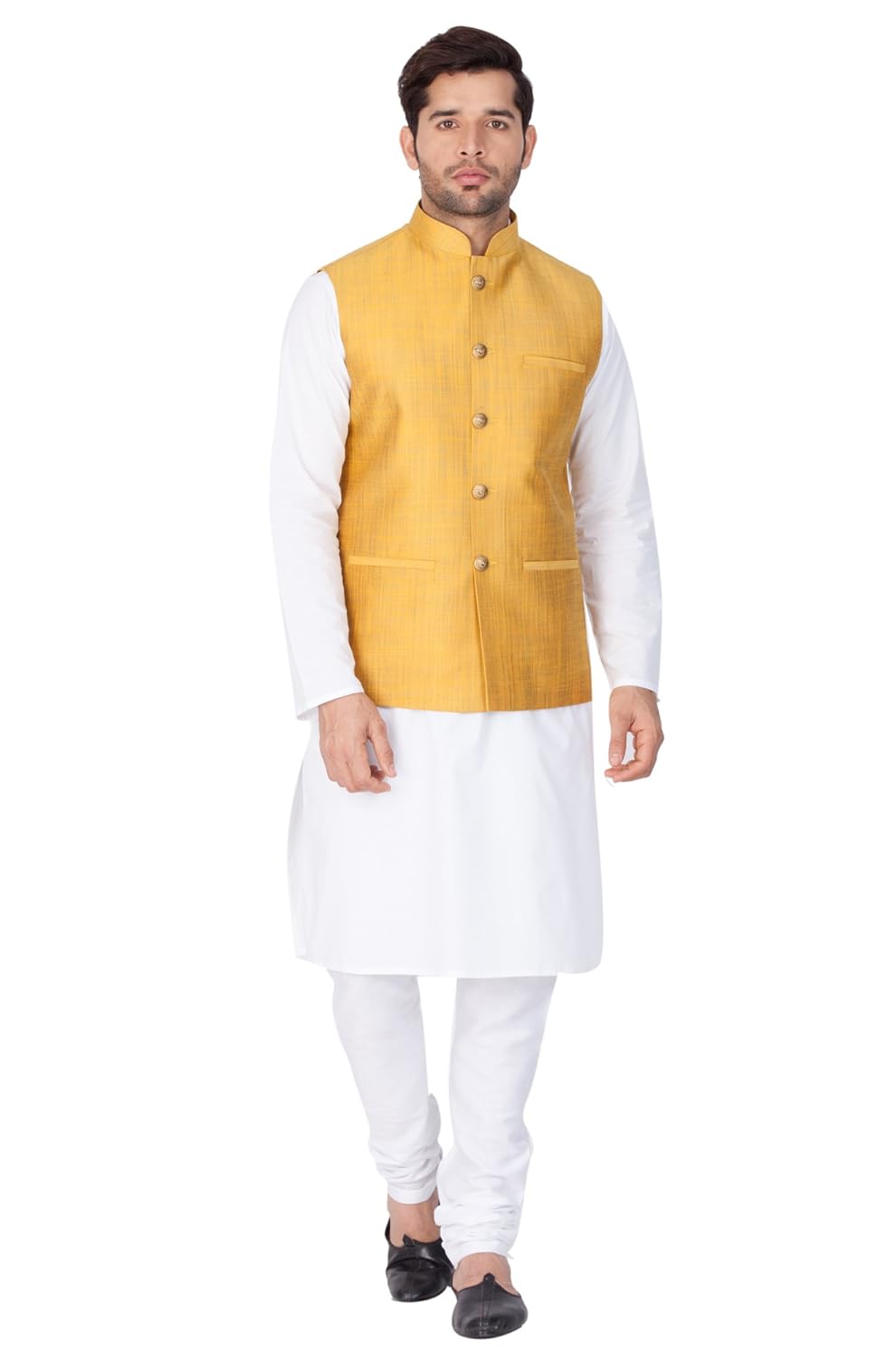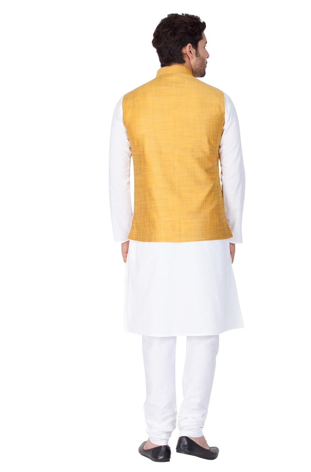 Vastramay brings to you this Stylish yet Comfortable Men White Men Self Design Blended Cotton Modi Jacket, Pure Cotton White Kurta and Churidar Pyjama Set. Adorn it for a perfect Classy & Trendy look. Pair it with a juti or a mojari for the Royal look. |