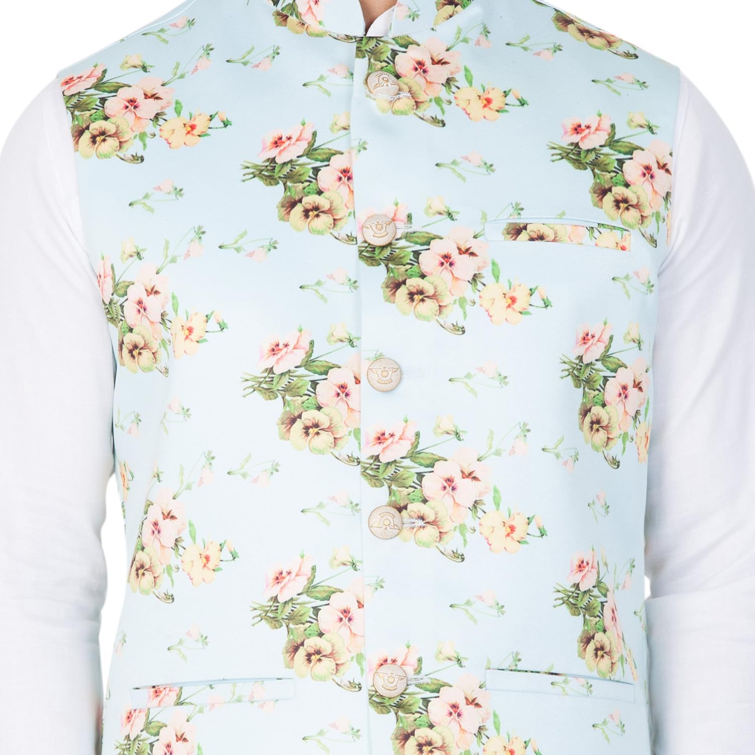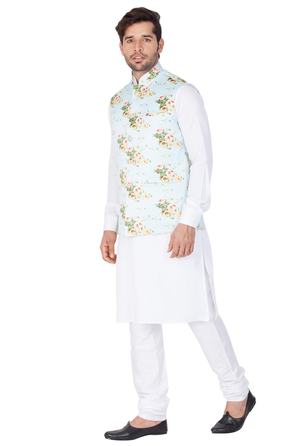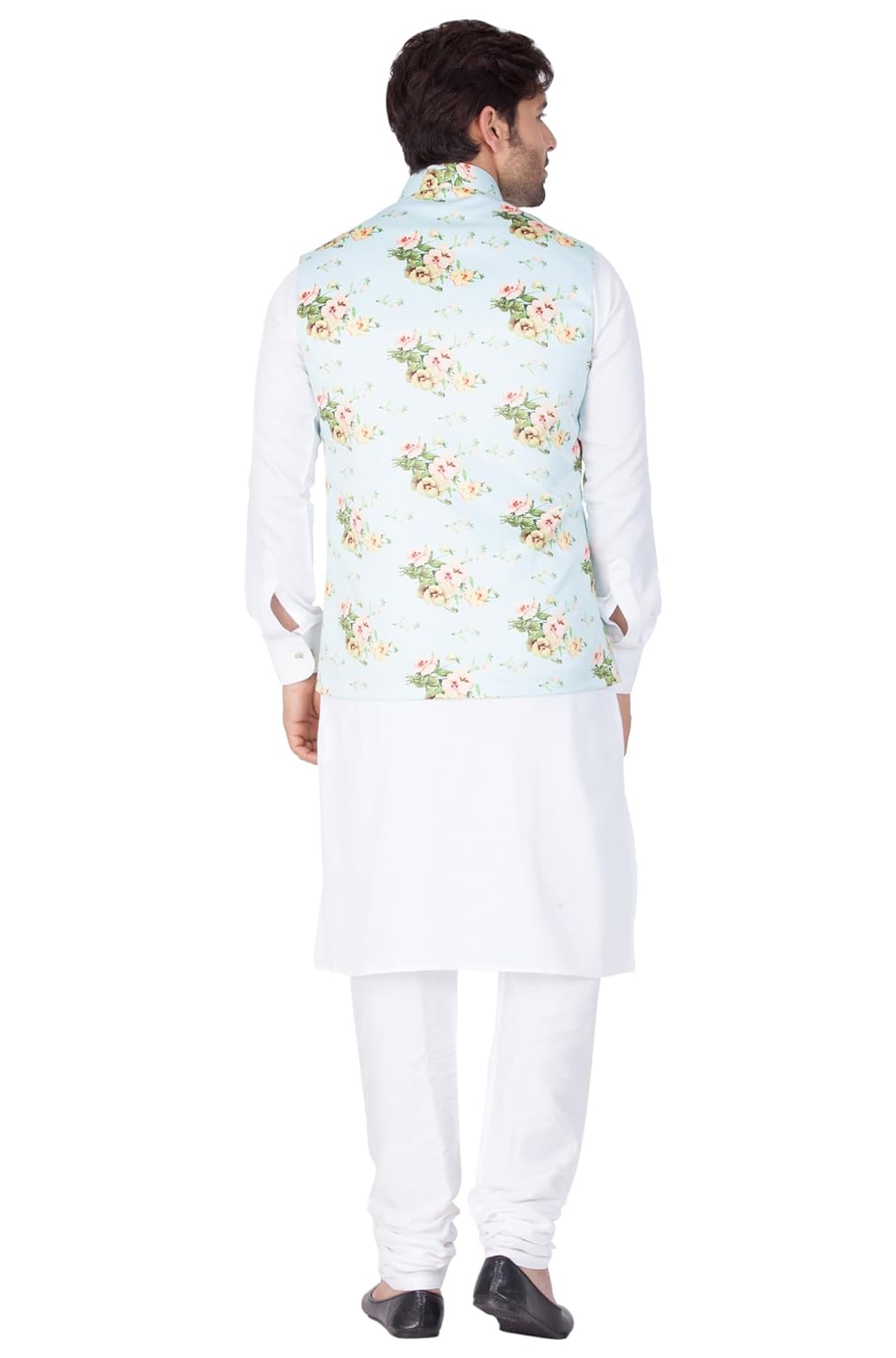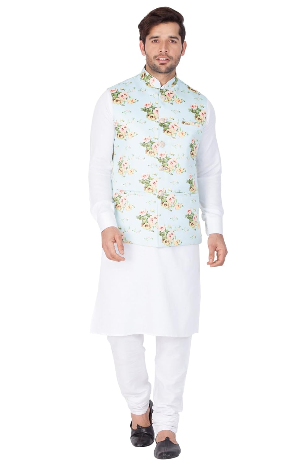 Vastramay brings to you this Stylish yet Comfortable Men White Men Digital Floral Print on Soft Cotton Satin Modi Jacket, Soft Shiny Cotton Kurta with a Buttoned Cuff Styling paired with a Churidar Pyjama Set.. Adorn it for a perfect Classy & Trendy look. Pair it with a juti or a mojari for the Royal look. |