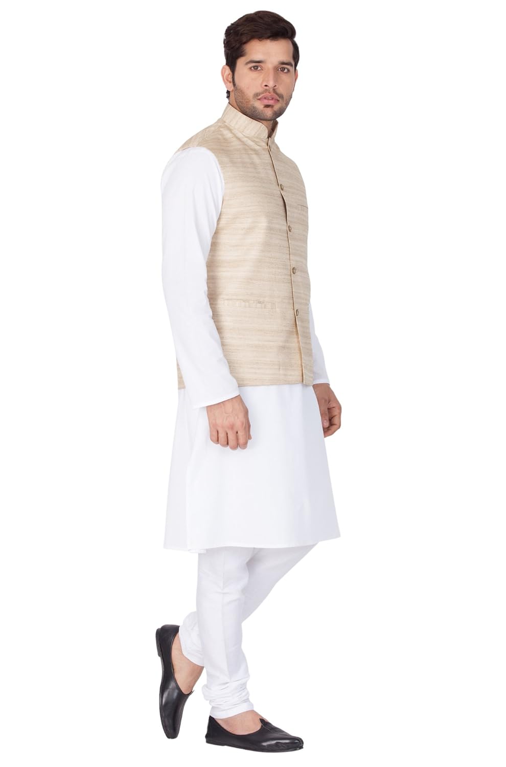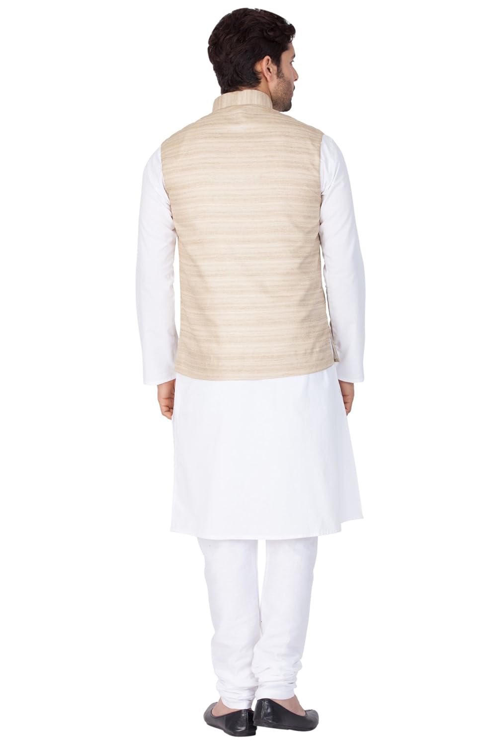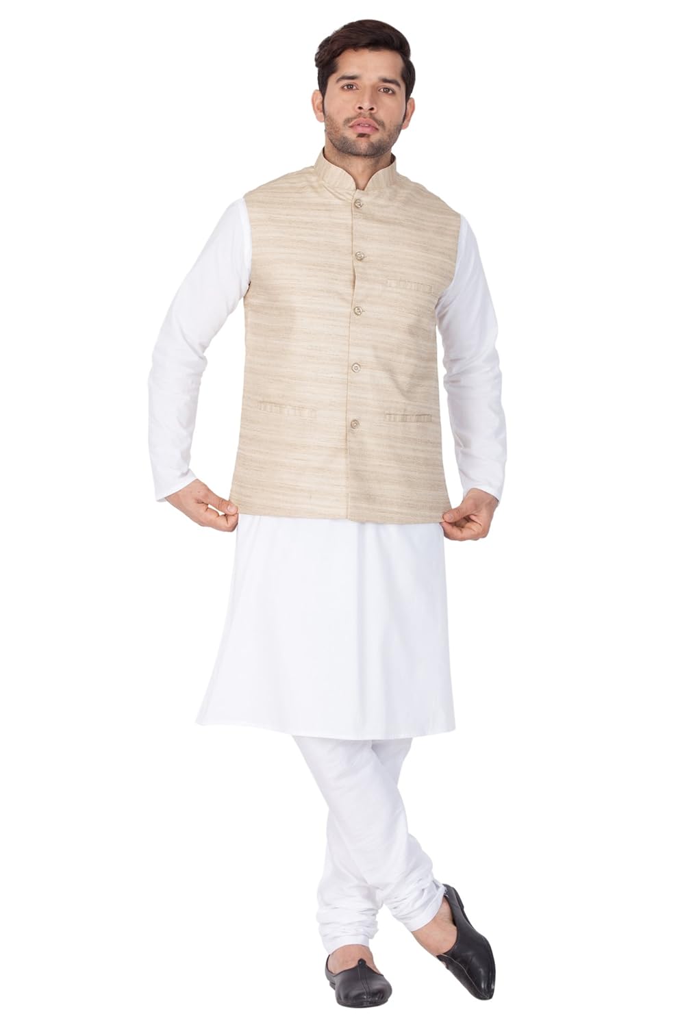 Vastramay brings to you this Stylish yet Comfortable Men White Men Bhagalpuri Matka Feel Blended Cotton Modi Jacket, a Pure Cotton White Kurta and Churidar Pyjama Set. Adorn it for a perfect Classy & Trendy look. Pair it with a juti or a mojari for the Royal look. |