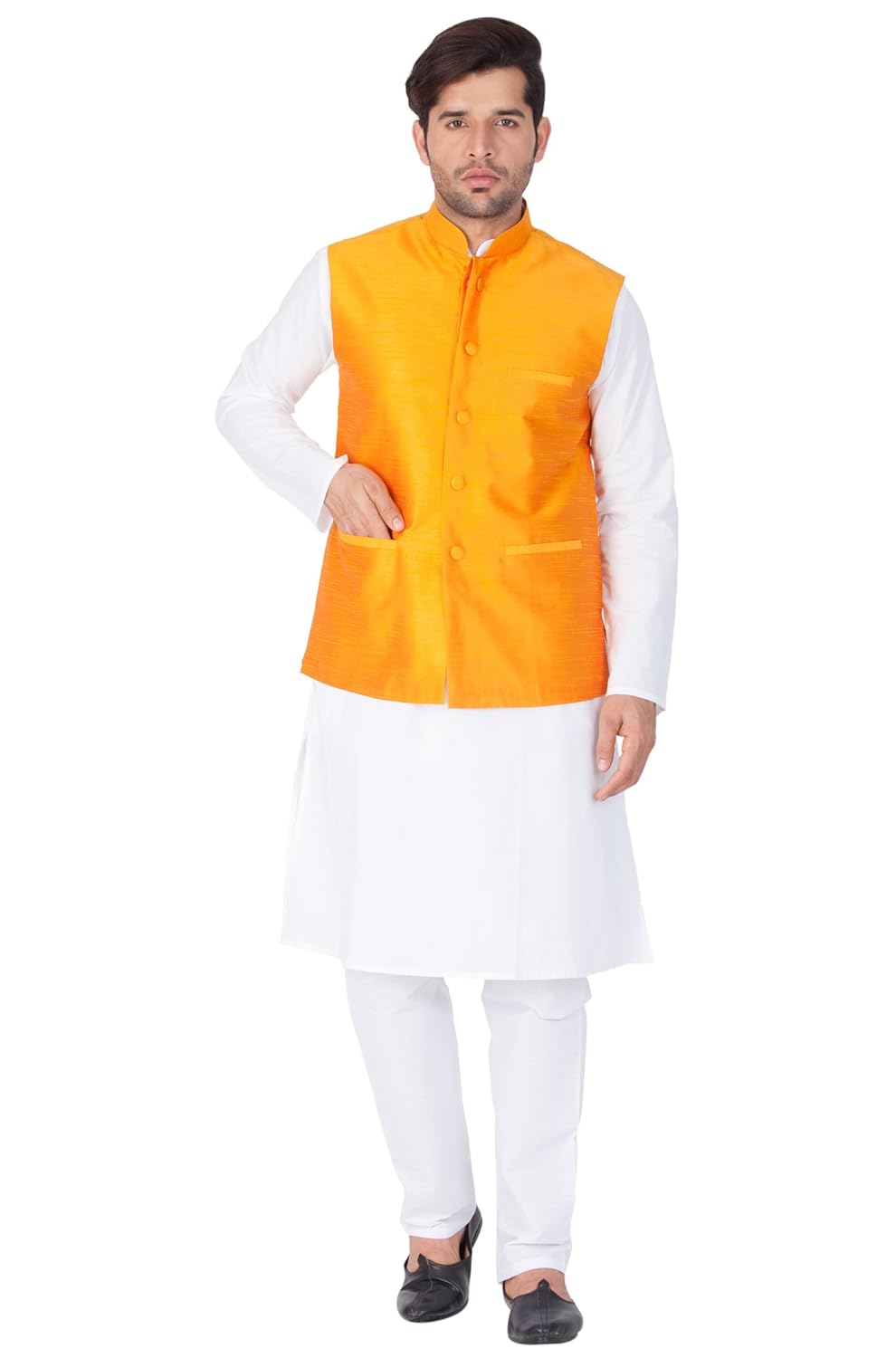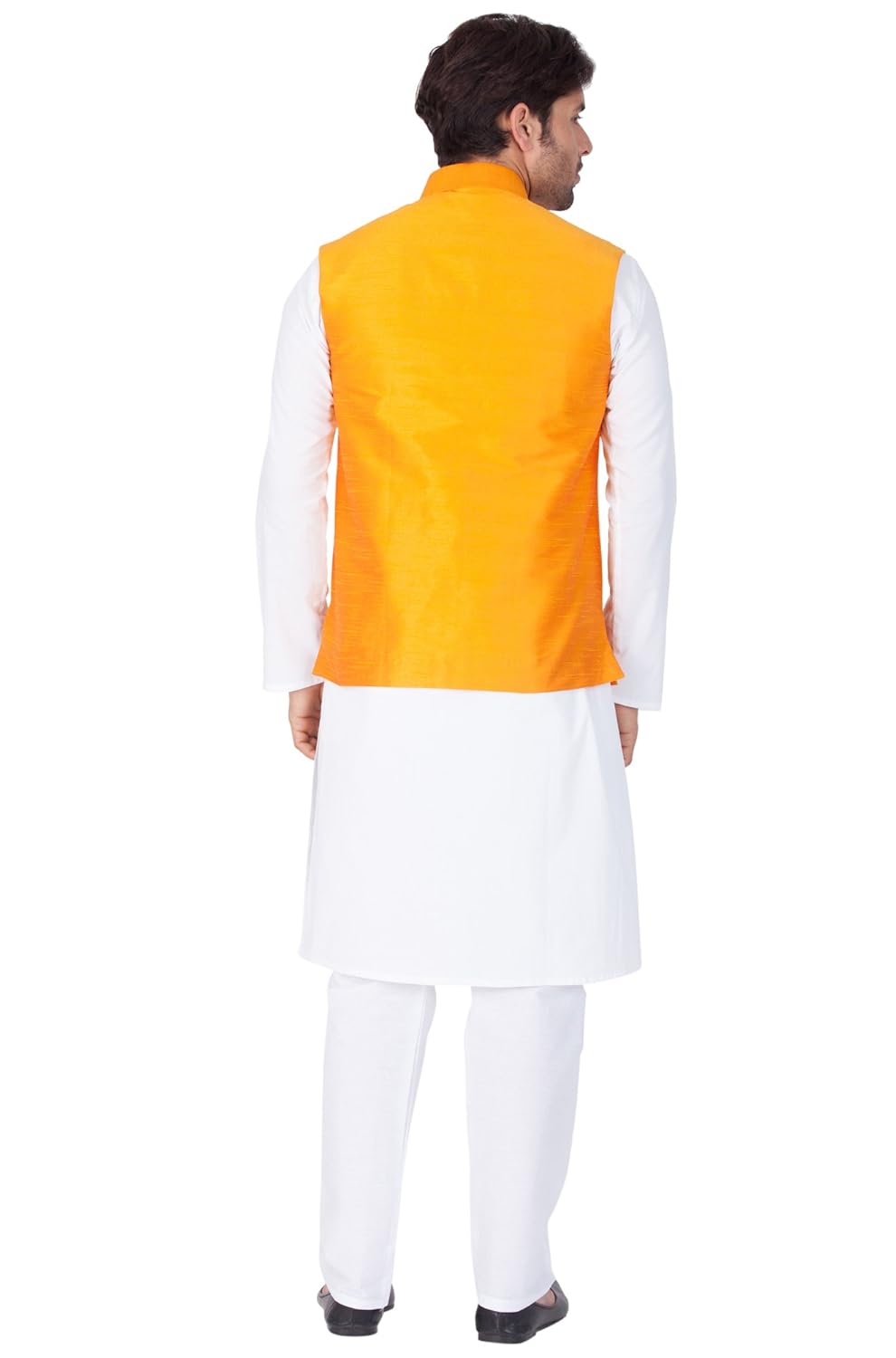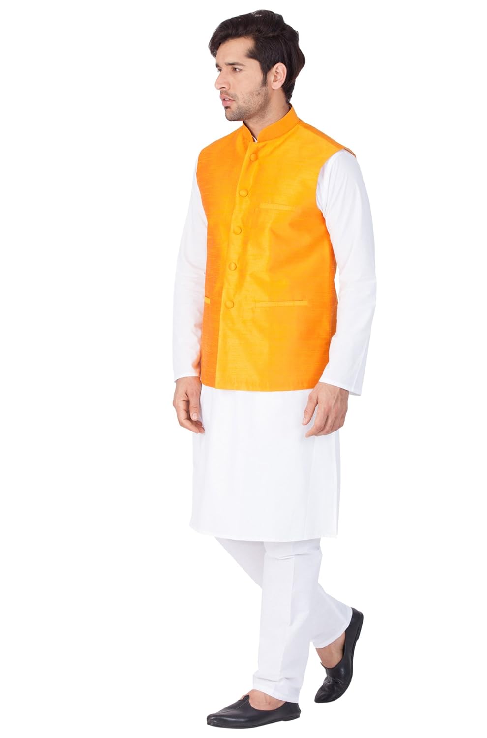 Vastramay brings to you this Stylish yet Comfortable Men White Men Cotton Silk Modi Jacket, a Pure Cotton White Kurta and Pyjama Set. Adorn it for a perfect Classy & Trendy look. Pair it with a juti or a mojari for the Royal look. |