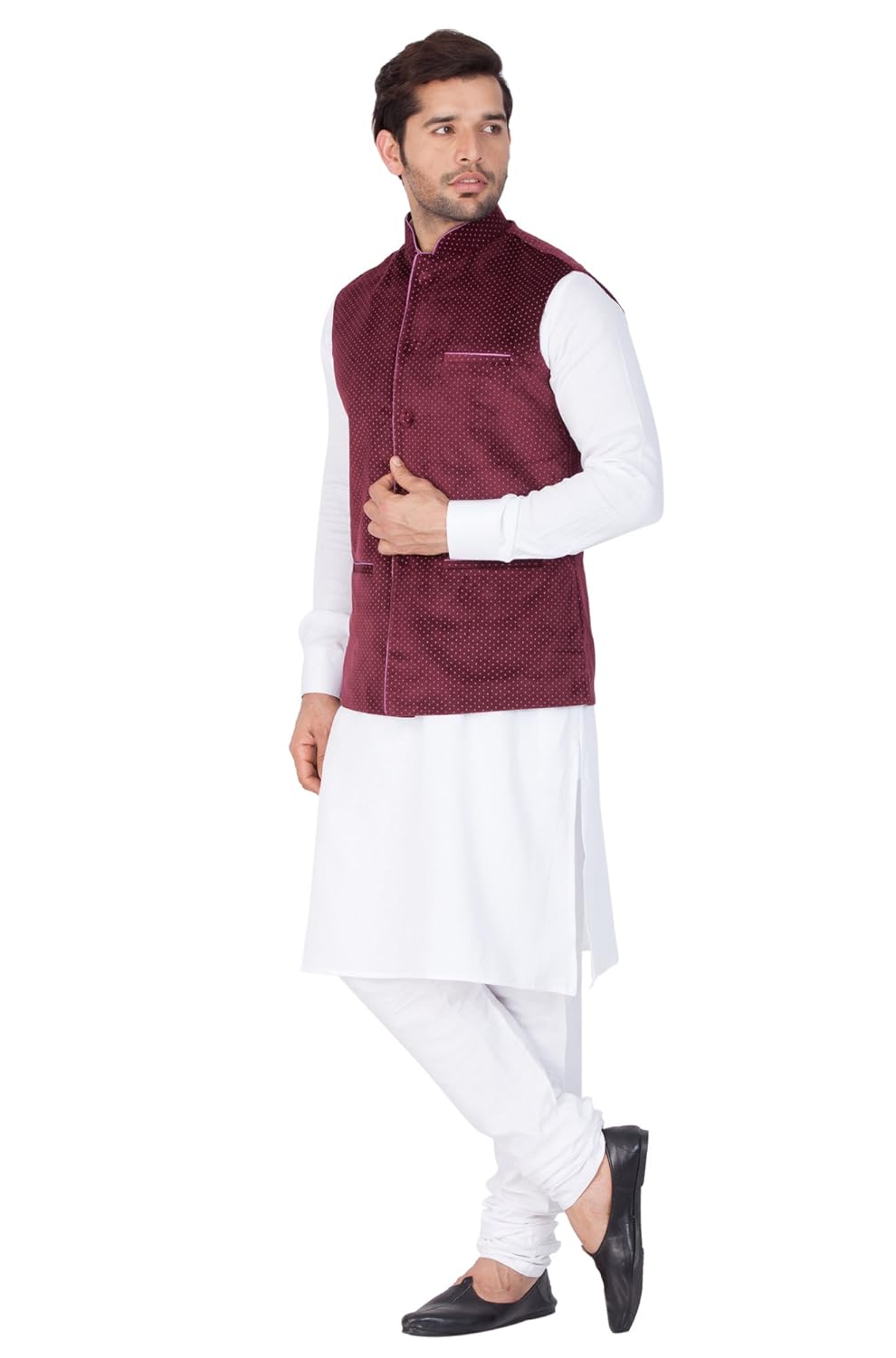 Vastramay brings to you this Stylish yet Comfortable Men White Men Digital Velvet Nehru (Modi) Jakcet, a Soft Shiny Cotton Kurta with a Buttoned Cuff Styling paired with a Churidar Pyjama Set.. Adorn it for a perfect Classy & Trendy look. Pair it with a juti or a mojari for the Royal look. |