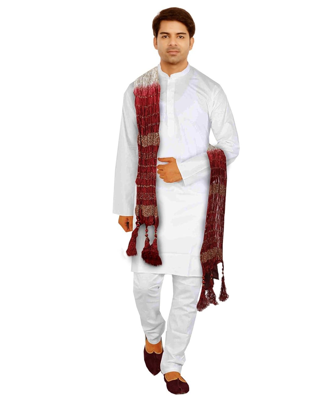 Vastramay brings to you this Stylish yet Comfortable Men White Men Pure Cotton White Kurta, Pyjama with a Shaded Dye Crushed Dupatta Set. Adorn it for a perfect Classy & Trendy look. Pair it with a juti or a mojari for the Royal feel. |
