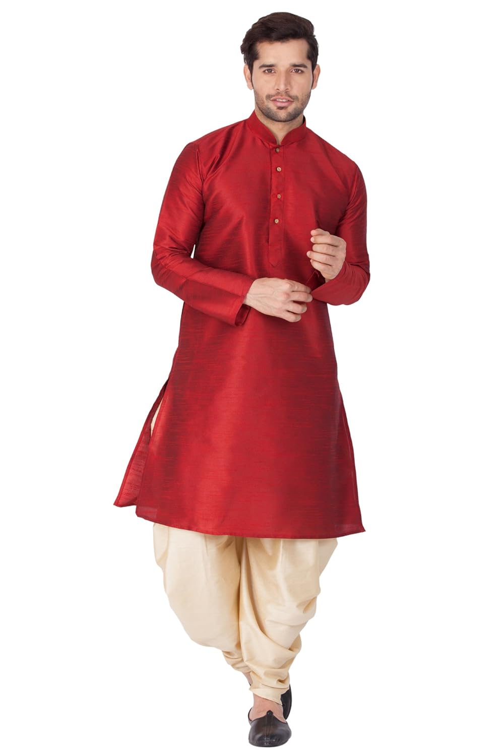 Vastramay brings to you this Stylish yet Comfortable Men Maroon Men Cotton Silk Solid Kurta with Cowl Style Patiala Dhoti Pant Set. Adorn it for a perfect Classy & Trendy look. Pair it with a juti or a mojari for the Royal look. |