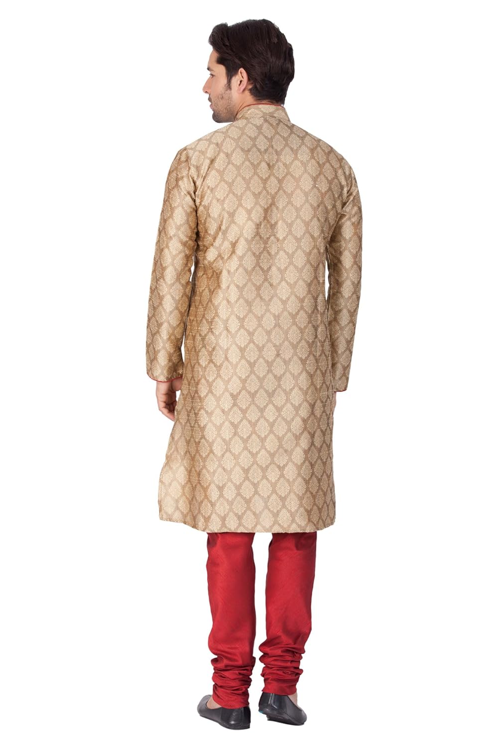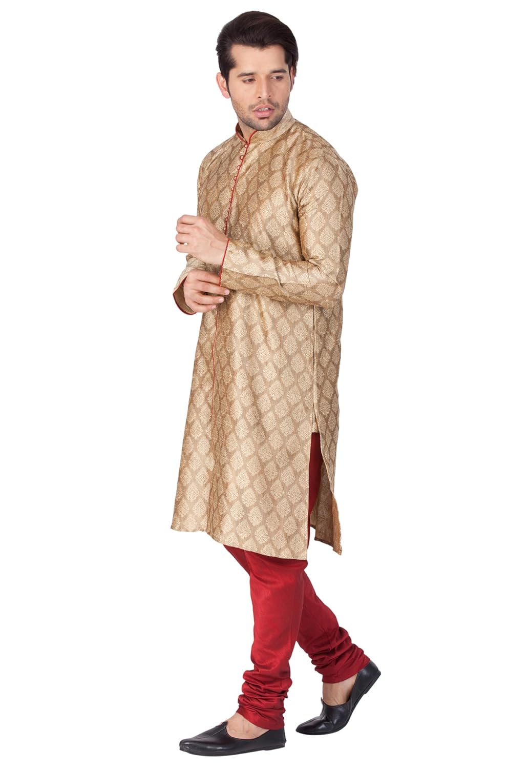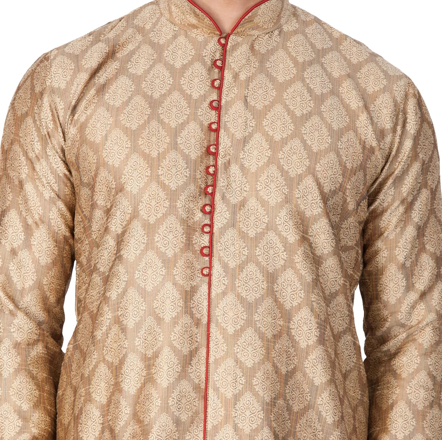 Vastramay brings to you this Stylish yet Comfortable Men Beige Banarasi Jaquard Kurta paired with a Churidar Pyjama. Adorn it for a perfect Classy & Trendy look. Pair it with a juti or a mojari for the Royal look. |