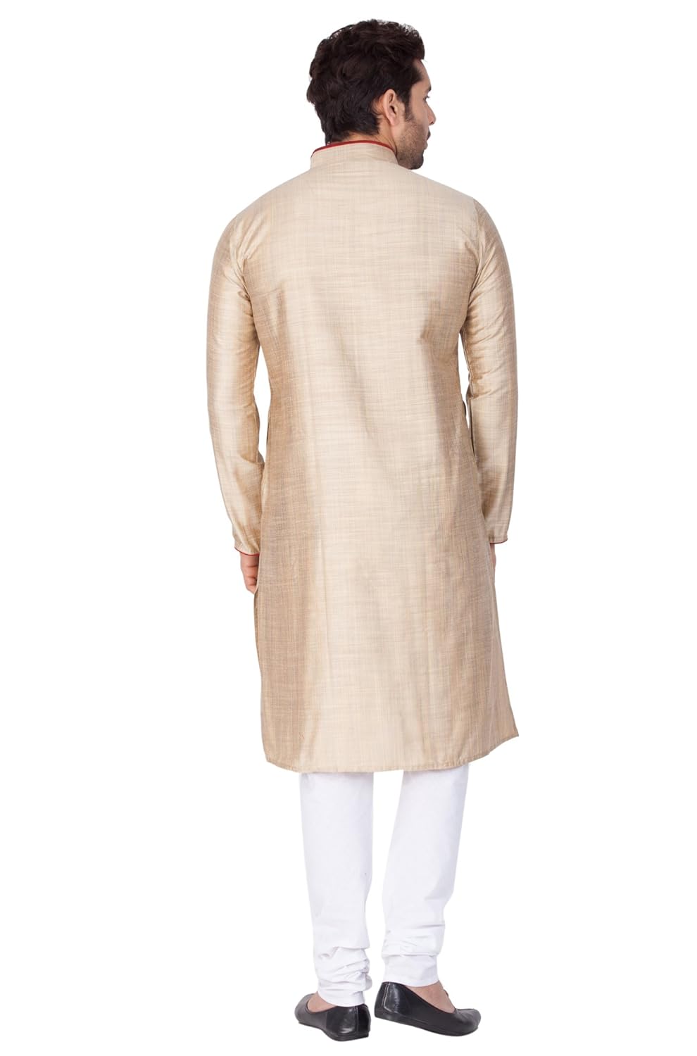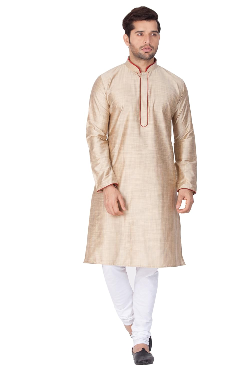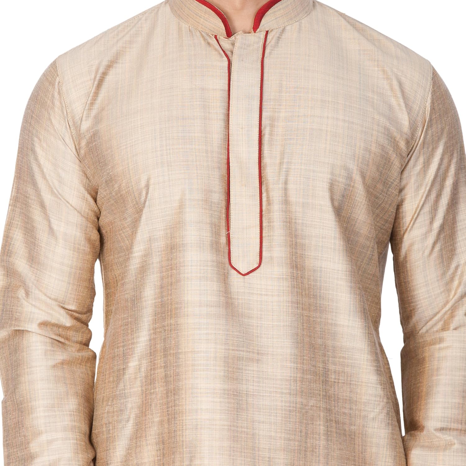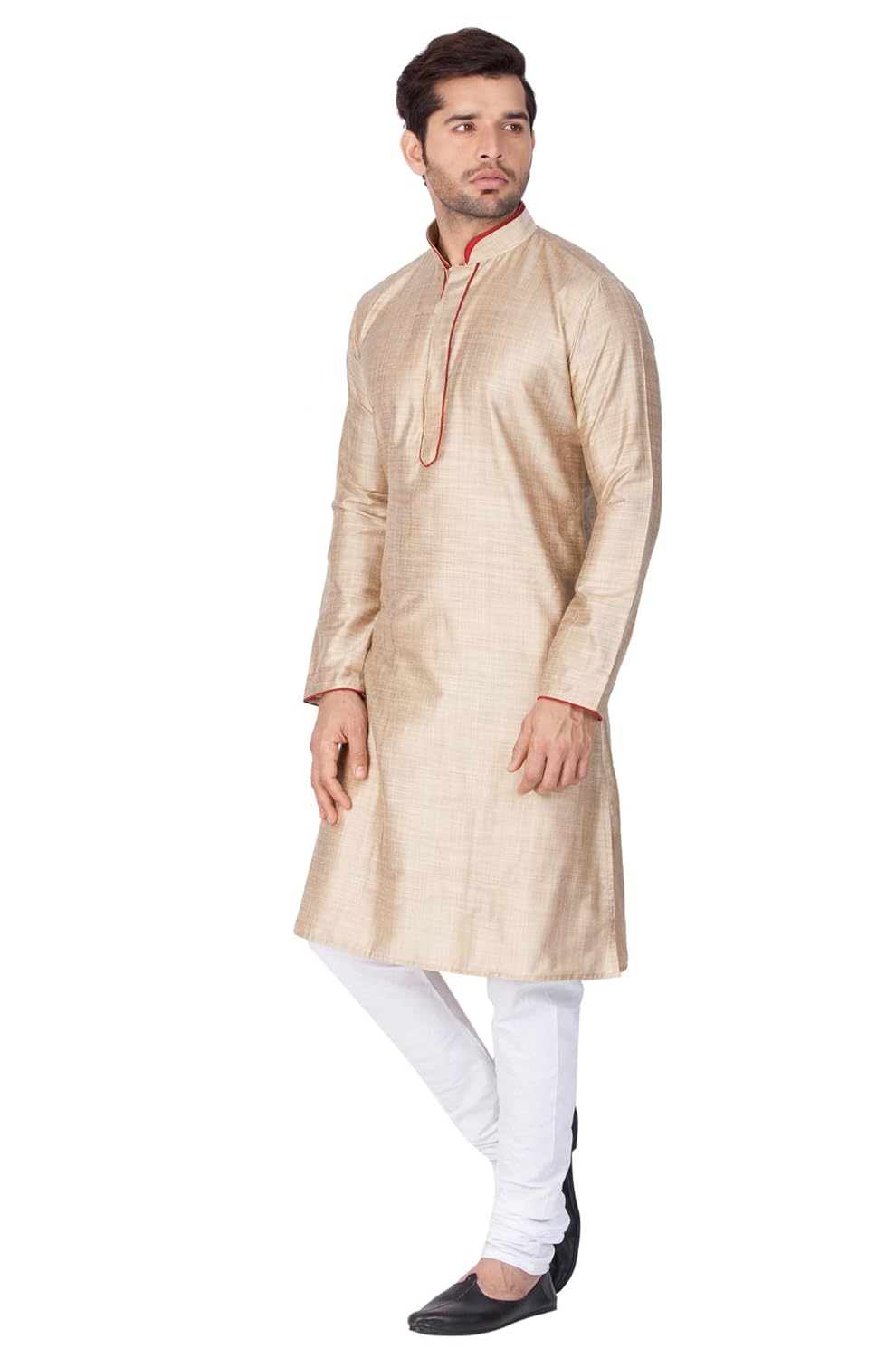 Vastramay brings to you this Stylish yet Comfortable Men Beige Self Design Kurta With Minimal Contrast Piping Highlight on Collar and Placket and Churidar Pyjama Set. Adorn it for a perfect Classy & Trendy look. Pair it with a juti or a mojari for the Royal look. |