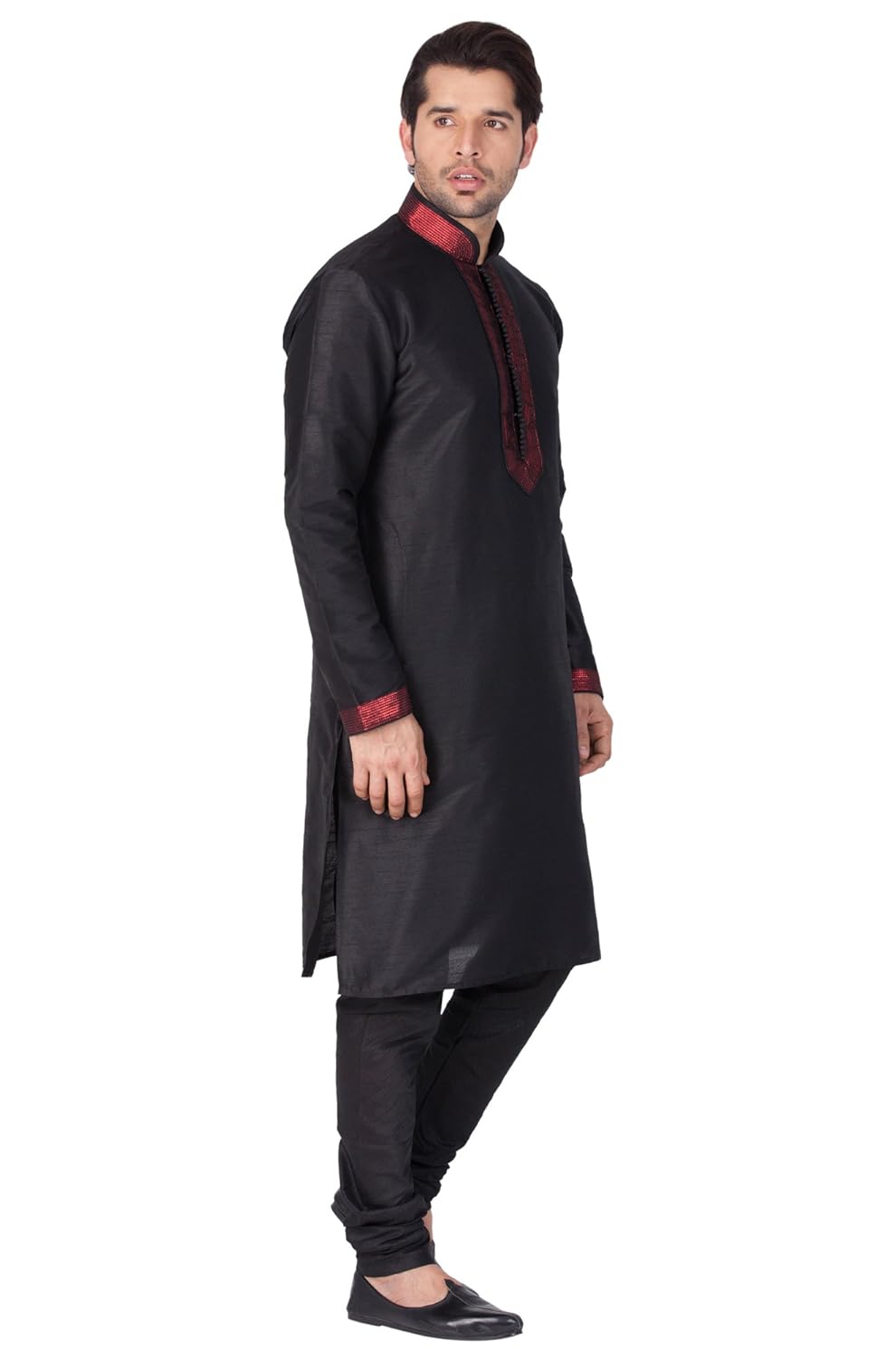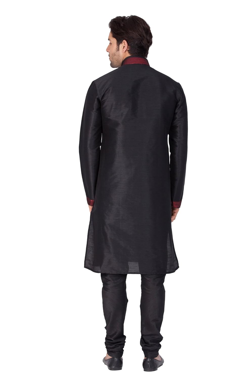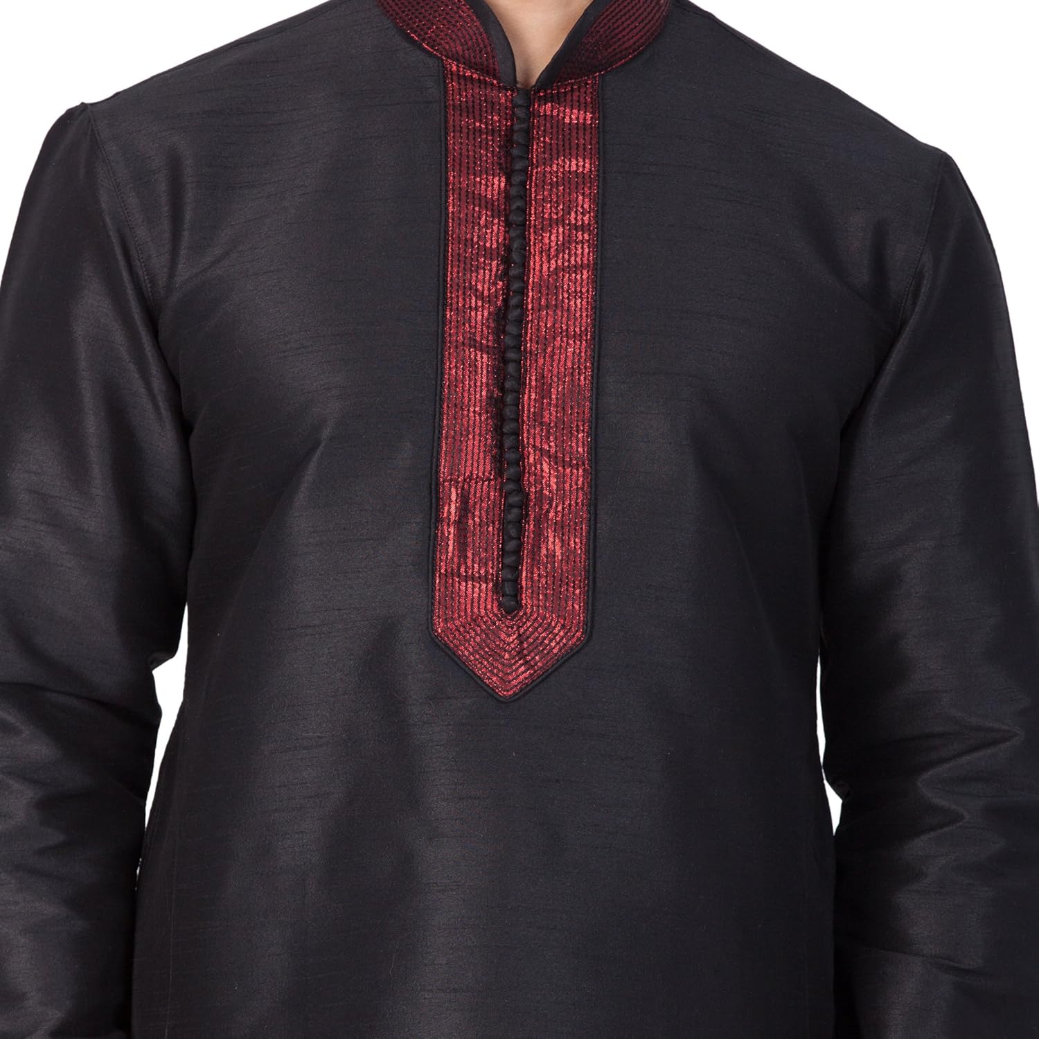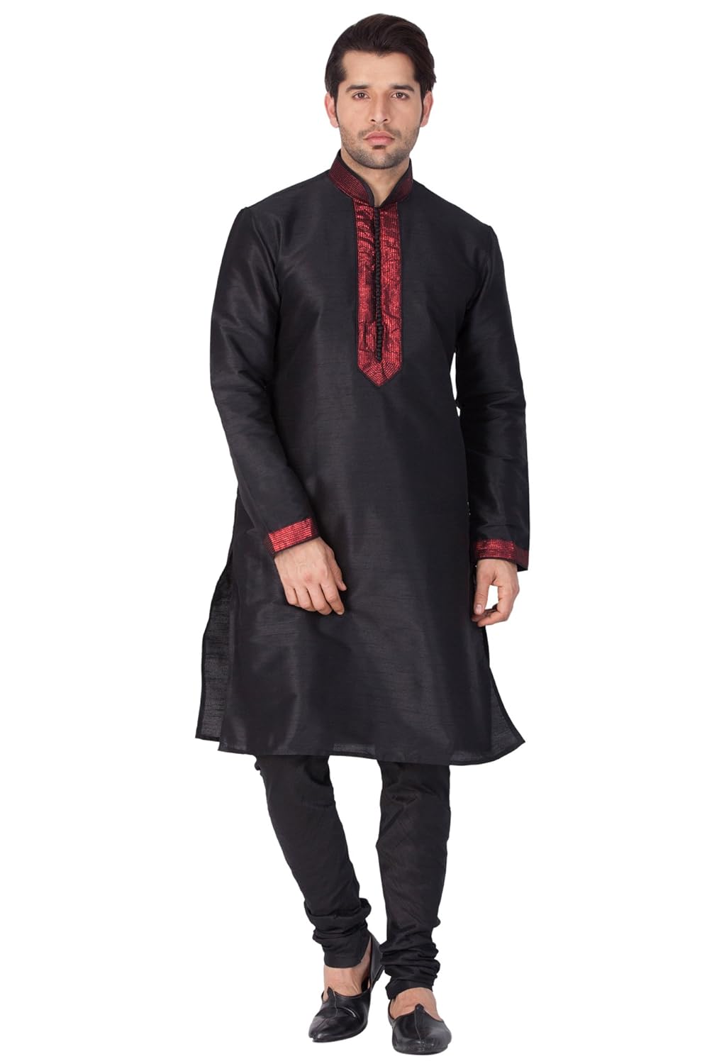 Vastramay brings to you this Stylish yet Comfortable Men Black Kurta With Ebroidered Collar, Placket and Cuff and Churidar Pyjama Set. Adorn it for a perfect Classy & Trendy look. Pair it with a juti or a mojari for the Royal look. |