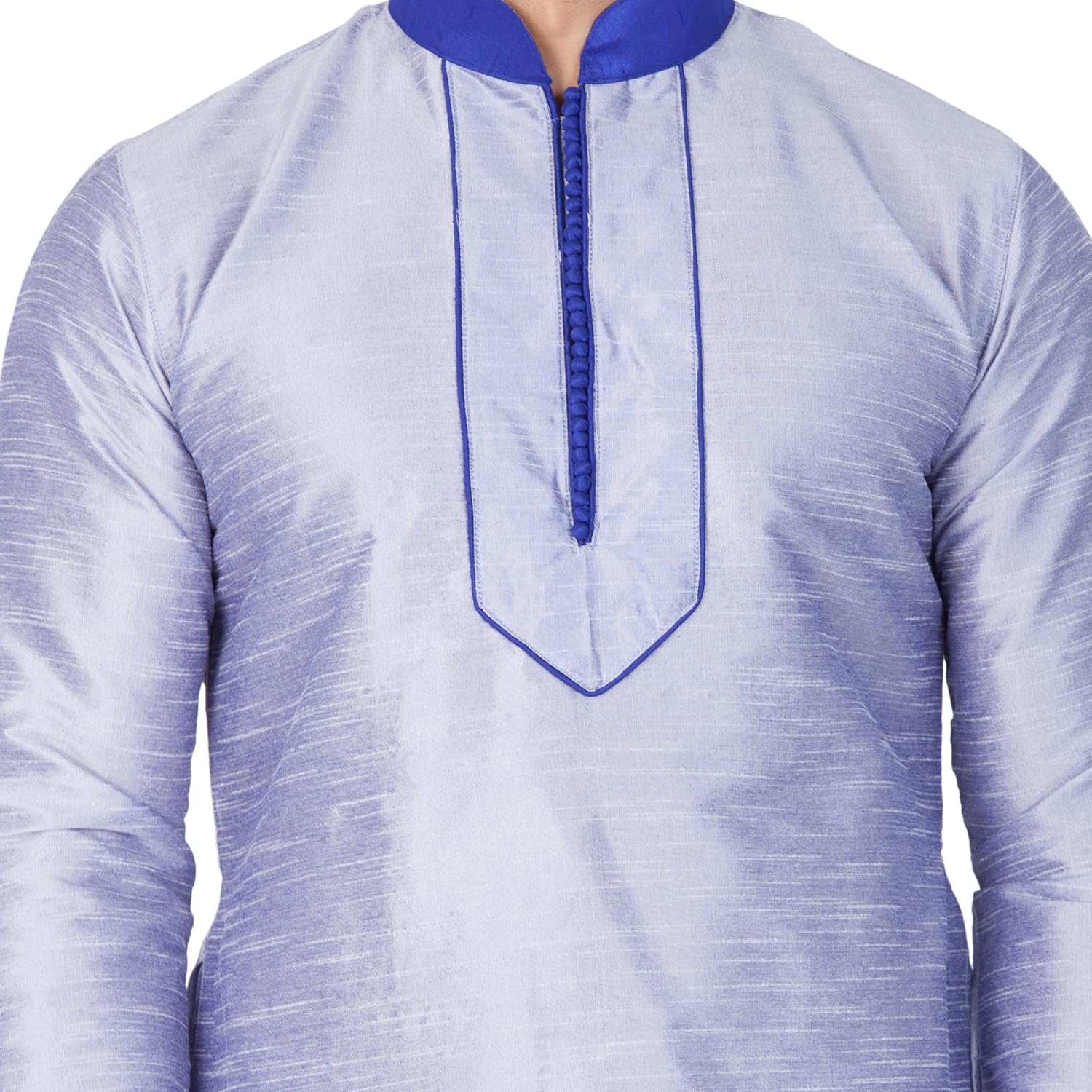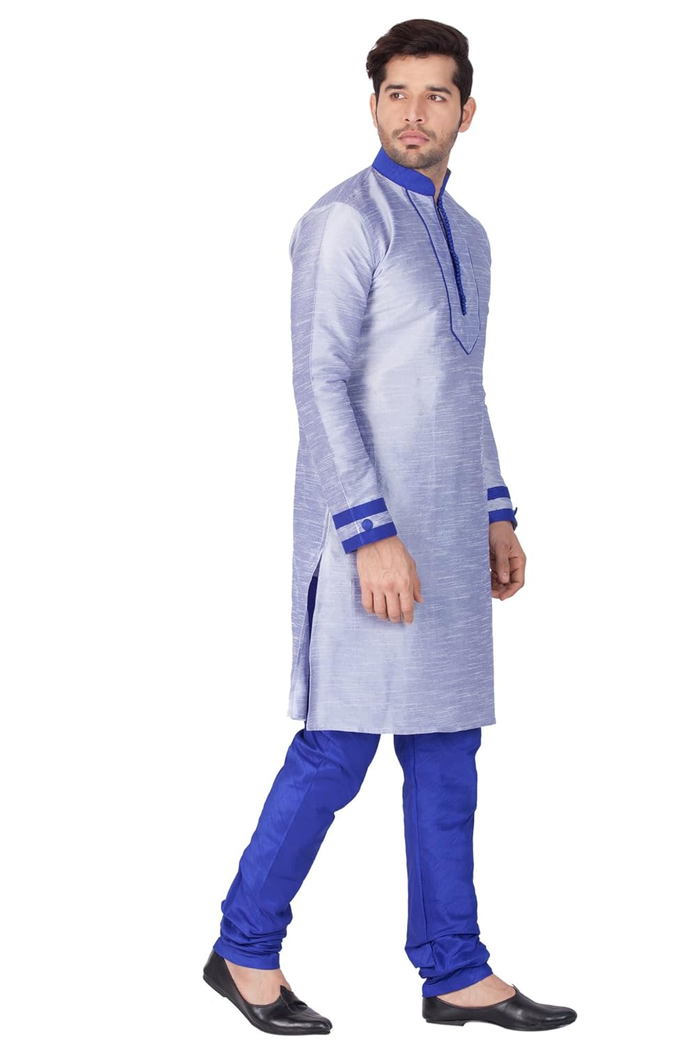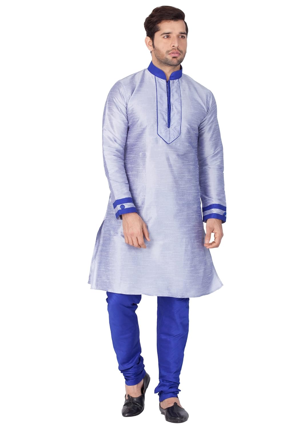 Vastramay brings to you this Stylish yet Comfortable Men Bluish White Men Cotton Silk Kurta with V Design Neck Line and Highlighting Beads and Churidar Pyjama Set. Adorn it for a perfect Classy & Trendy look. Pair it with a juti or a mojari for the Royal feel. |