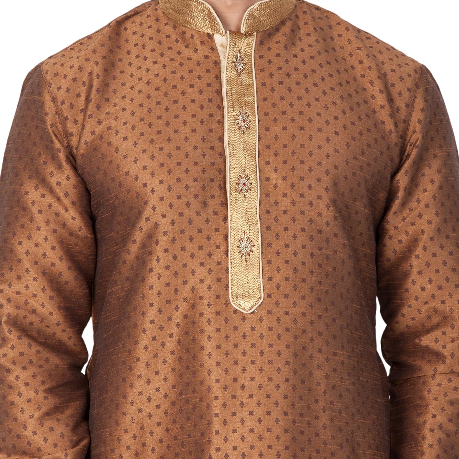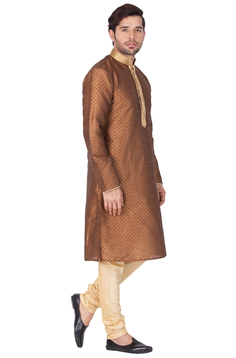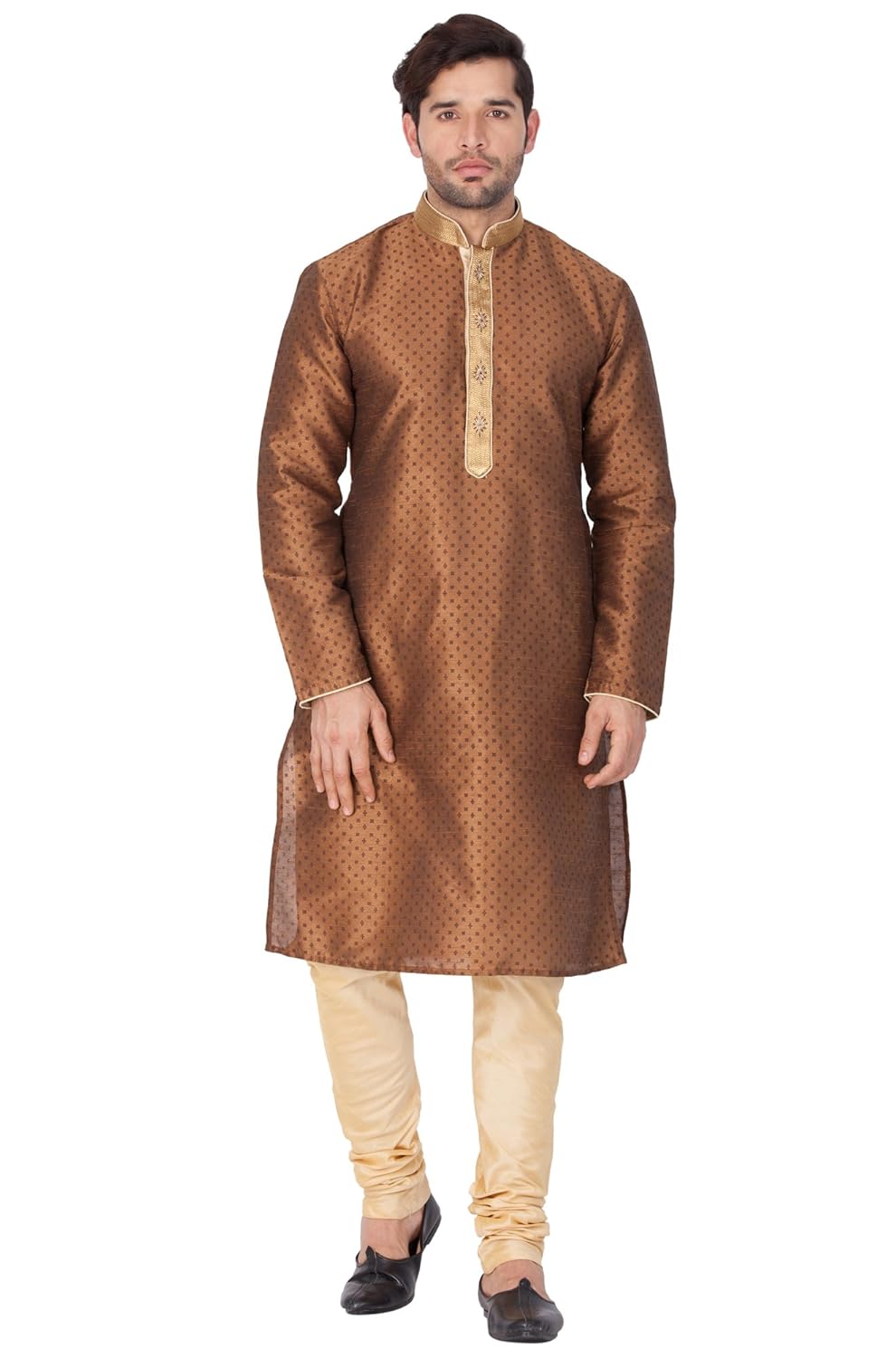 Vastramay brings to you this Stylish yet Comfortable Men Coffee Printed Kurta with Hand Embroidered Collar and Placket paired with a Churidar Pyjama. Adorn it for a perfect Classy & Trendy look. Pair it with a juti or a mojari for the Royal look. |