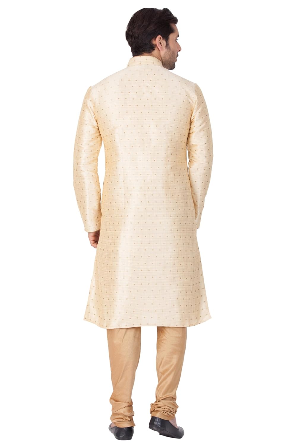 Vastramay brings to you this Stylish yet Comfortable Men Gold Banarasi Jaquard Kurta with Designer Placket paired with a Churidar Pyjama. Adorn it for a perfect Classy & Trendy look. Pair it with a juti or a mojari for the Royal look. |