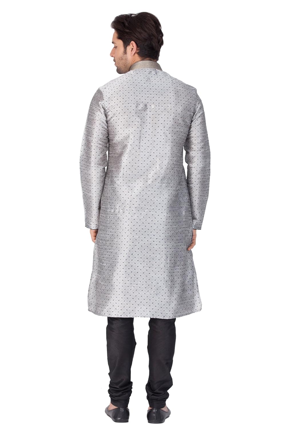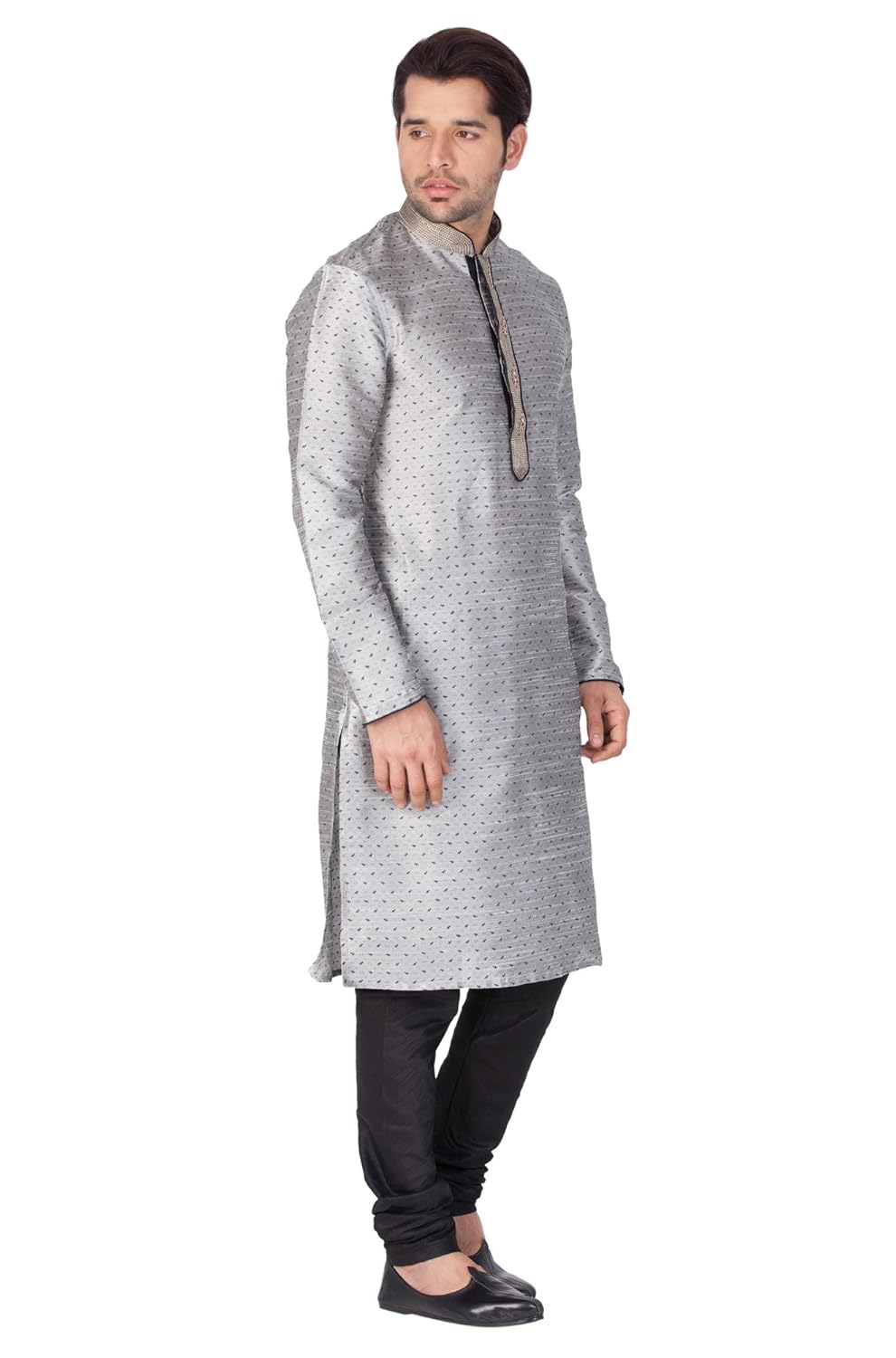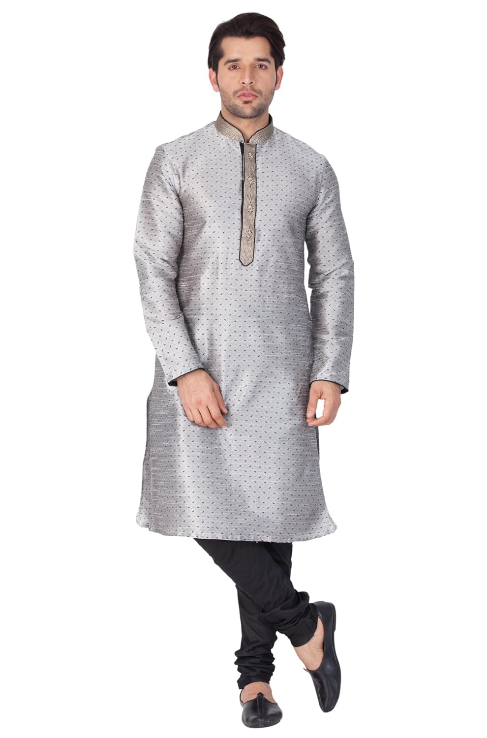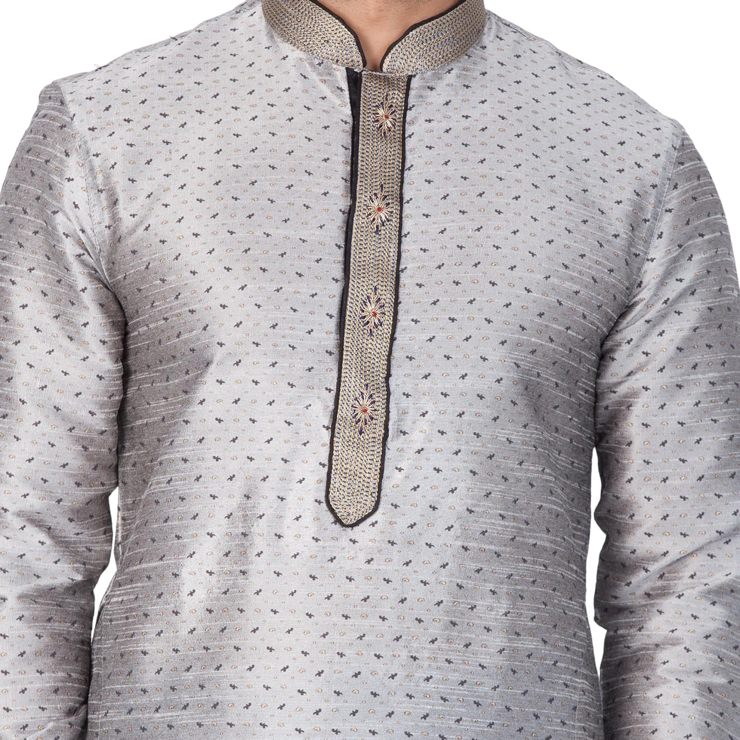 Vastramay brings to you this Stylish yet Comfortable Men Grey Printed Kurta with Hand Embroidered Collar and Placket paired with a Churidar Pyjama. Adorn it for a perfect Classy & Trendy look. Pair it with a juti or a mojari for the Royal look. |
