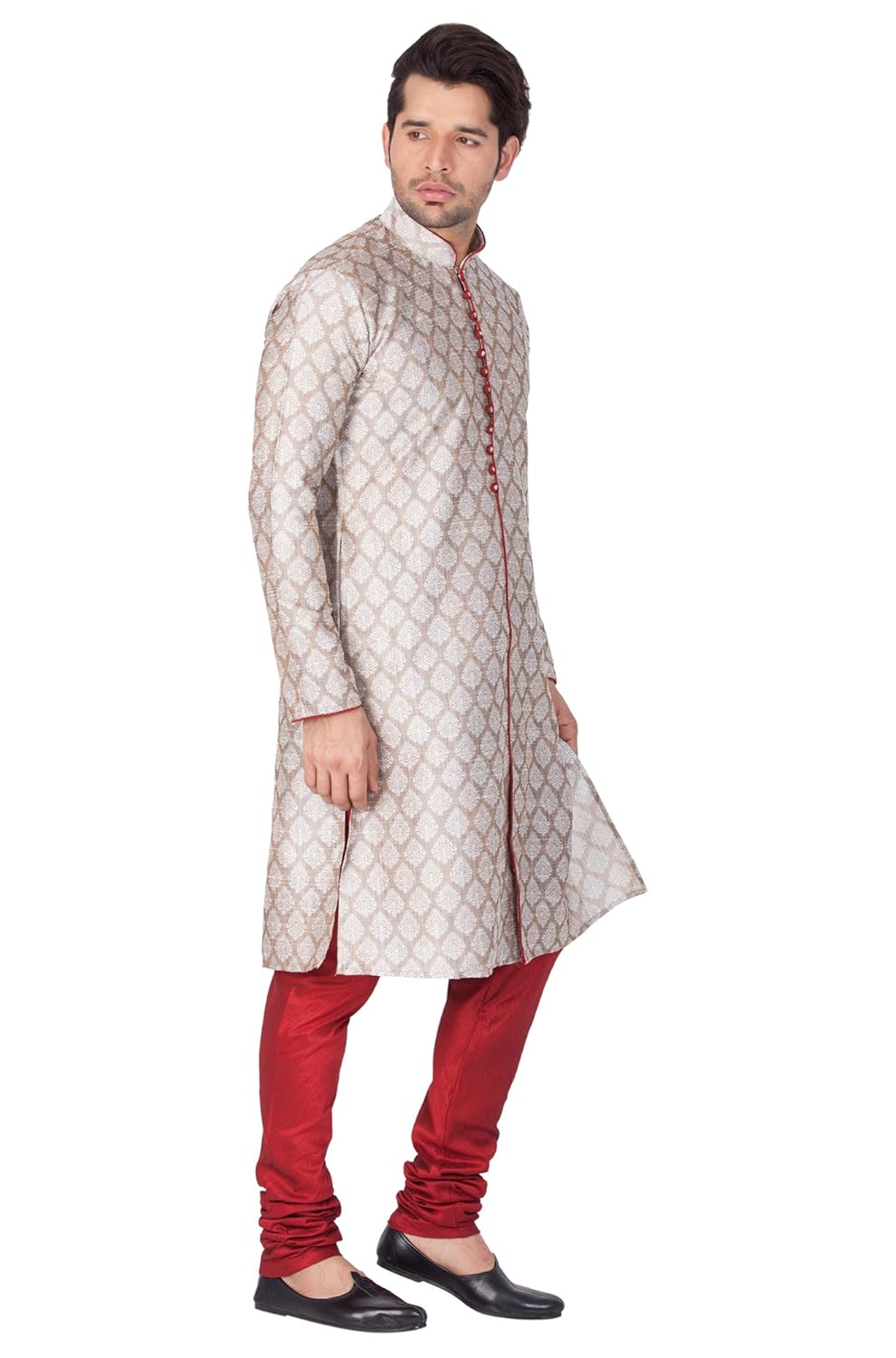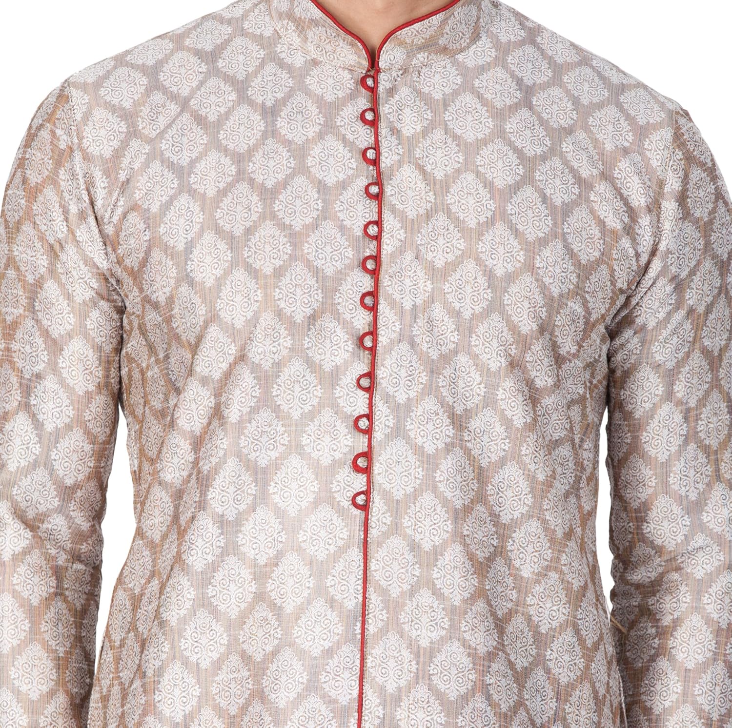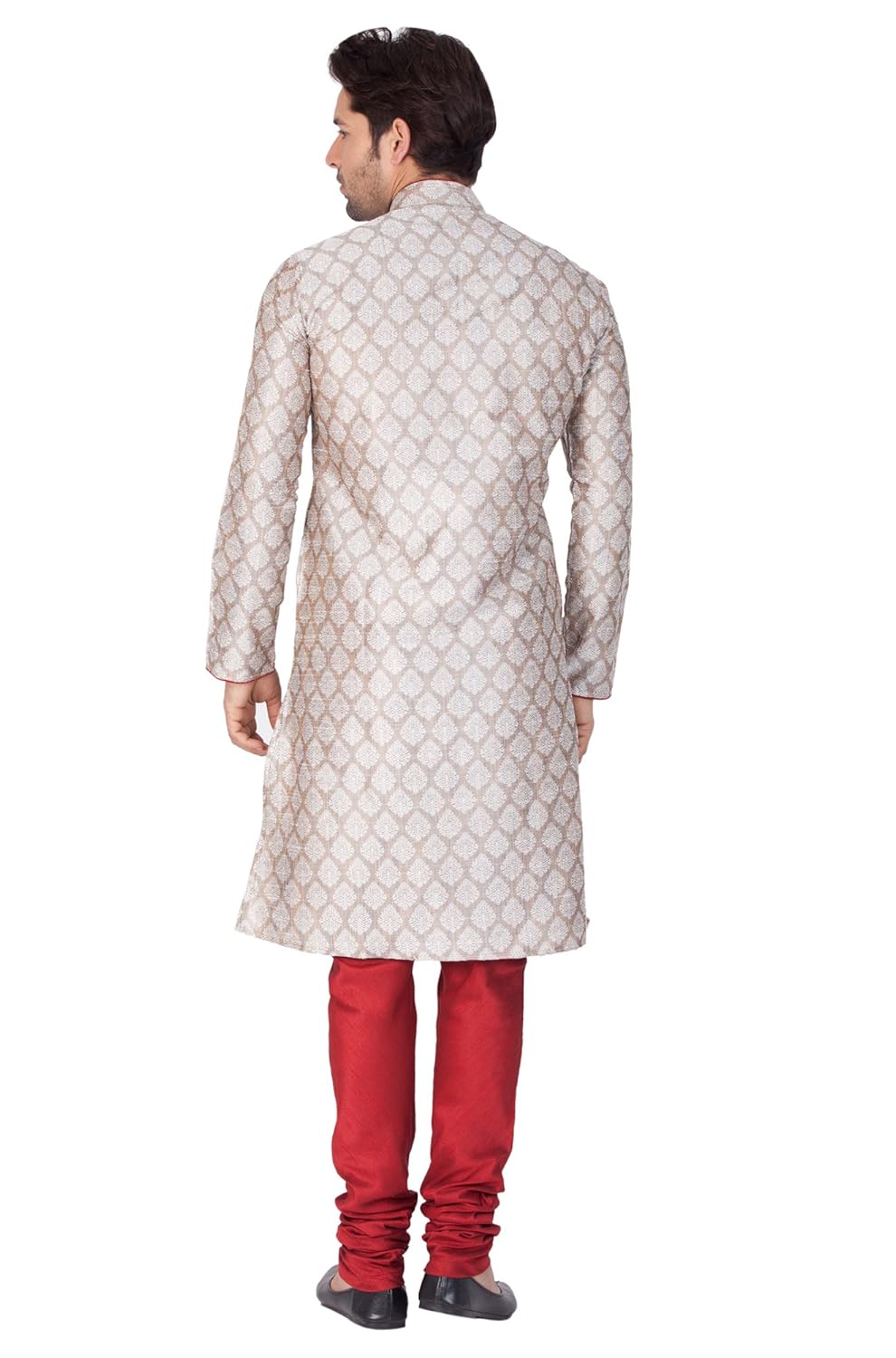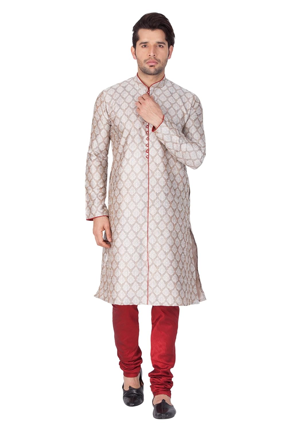 Vastramay brings to you this Stylish yet Comfortable Men Light Cement Grey Banarasi Jaquard Kurta paired with a Churidar Pyjama. Adorn it for a perfect Classy & Trendy look. Pair it with a juti or a mojari for the Royal look. |