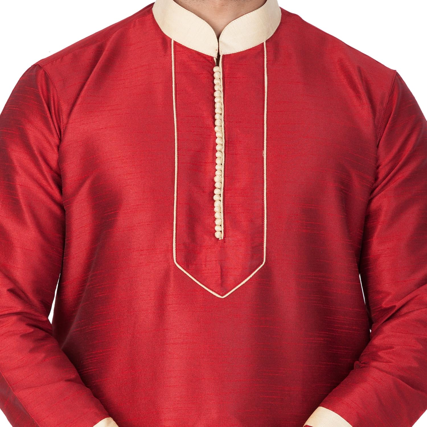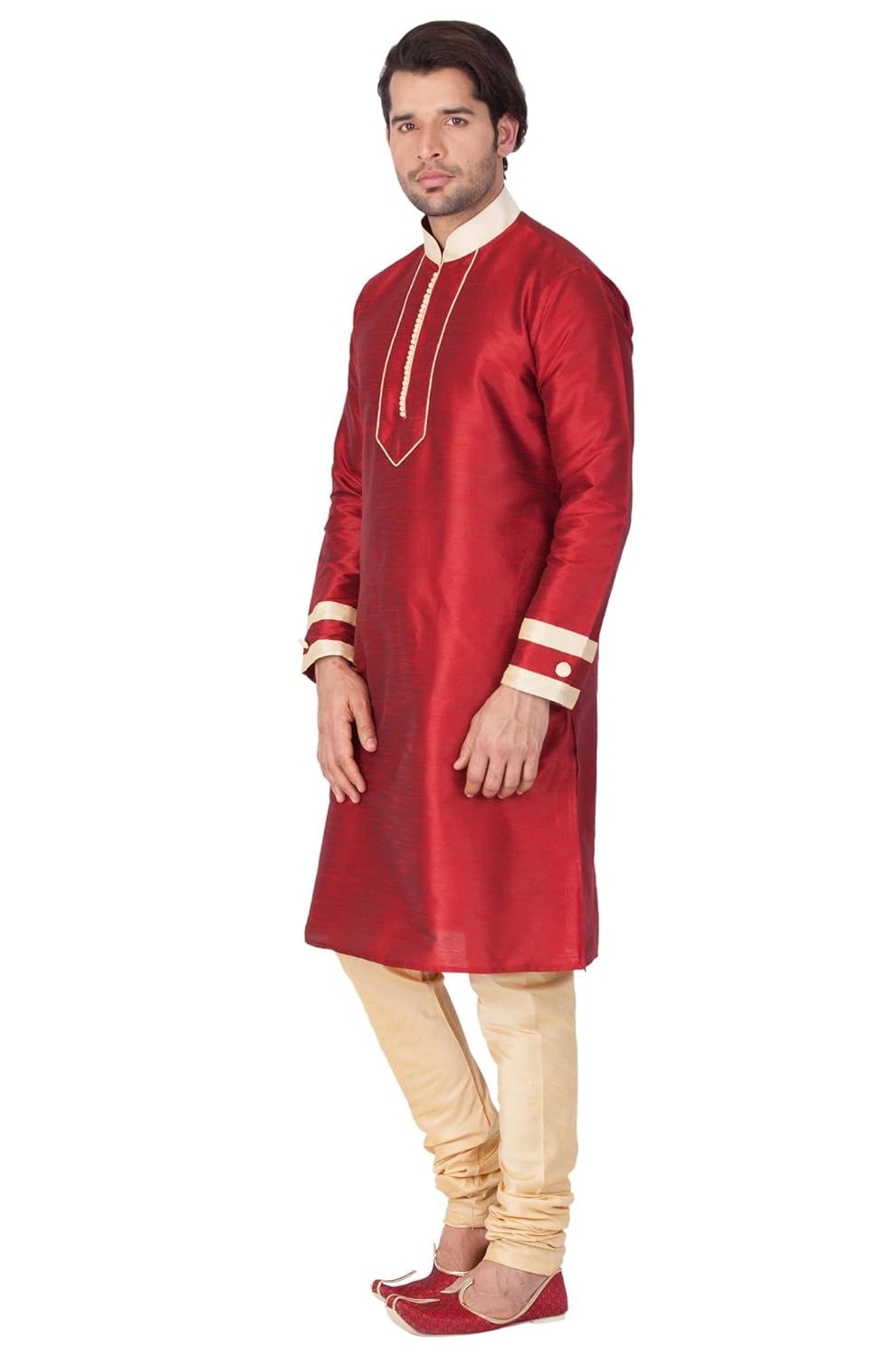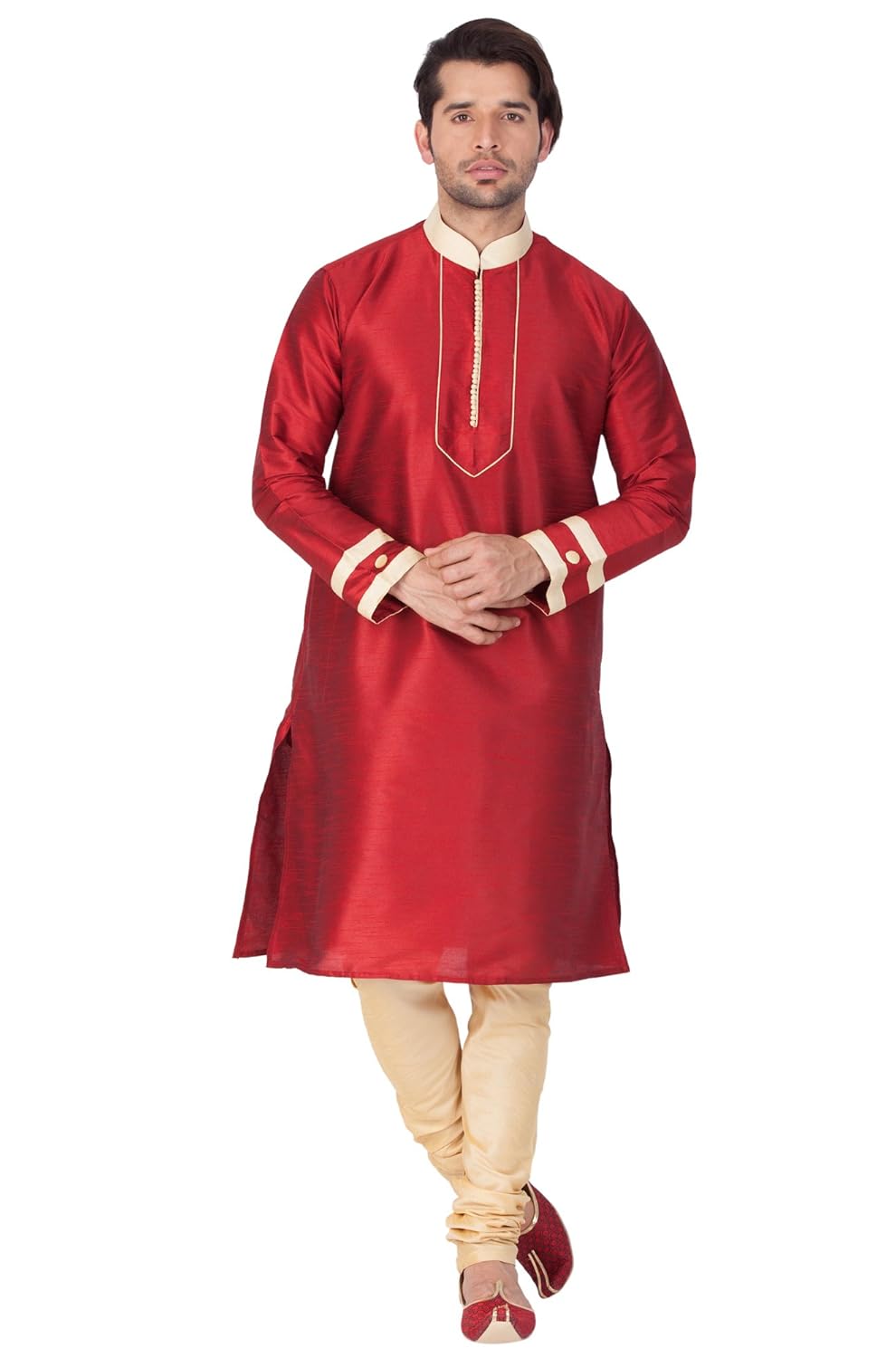 Vastramay brings to you this Stylish yet Comfortable Men Maroon Men Cotton Silk Kurta with V Design Neck Line and Highlighting Beads and Churidar Pyjama Set. Adorn it for a perfect Classy & Trendy look. Pair it with a juti or a mojari for the Royal feel. |
