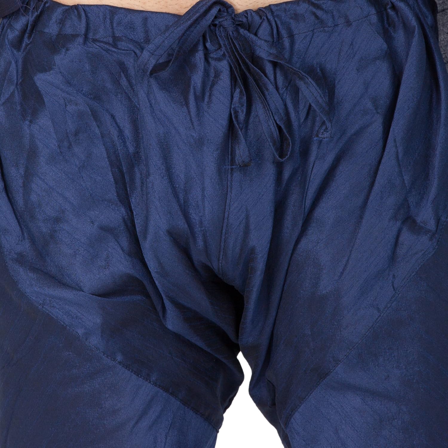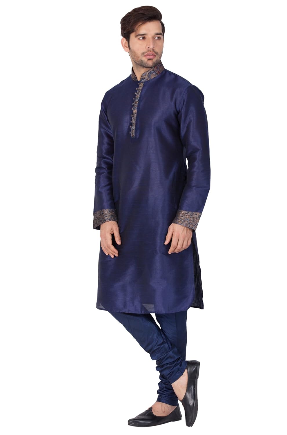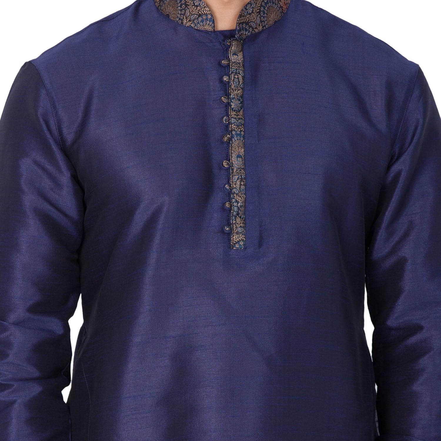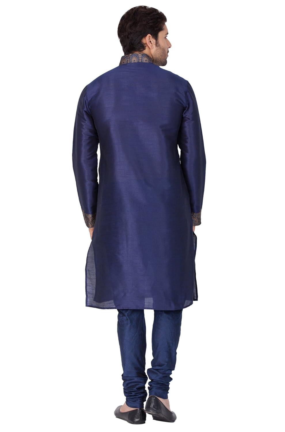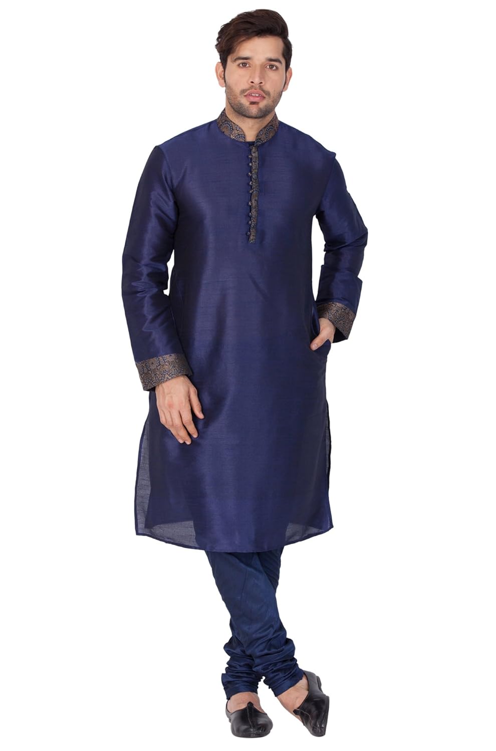 Vastramay brings to you this Stylish yet Comfortable Men Navy Blue Men Cotton Silk Kurta with Banarasi Brocade Collar, Placket and Calf and Churidar Pyjama Set. Adorn it for a perfect Classy & Trendy look. Pair it with a juti or a mojari for the Royal look. |