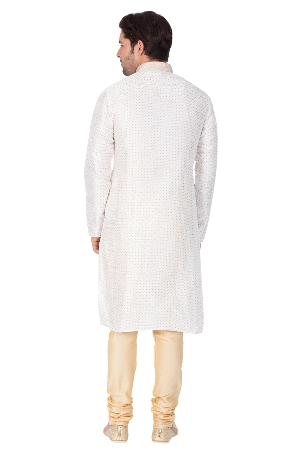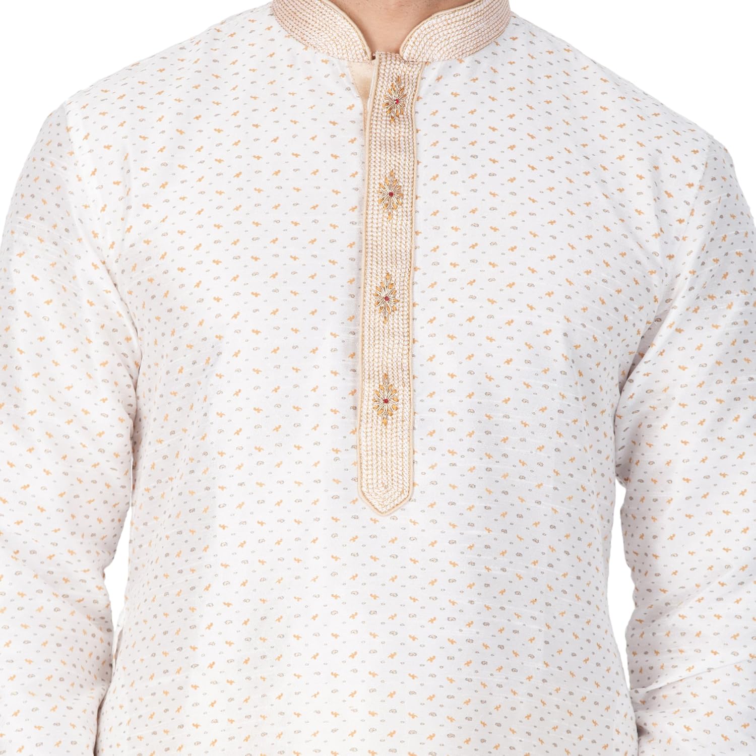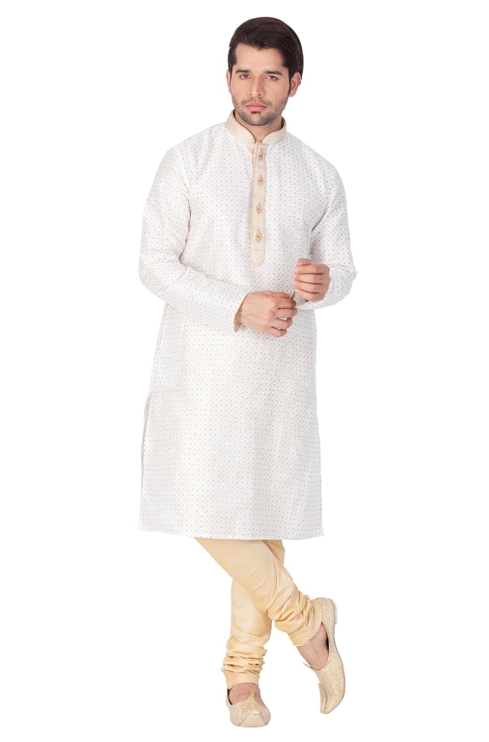 Vastramay brings to you this Stylish yet Comfortable Men White Printed Kurta with Hand Embroidered Collar and Placket paired with a Churidar Pyjama. Adorn it for a perfect Classy & Trendy look. Pair it with a juti or a mojari for the Royal look. |