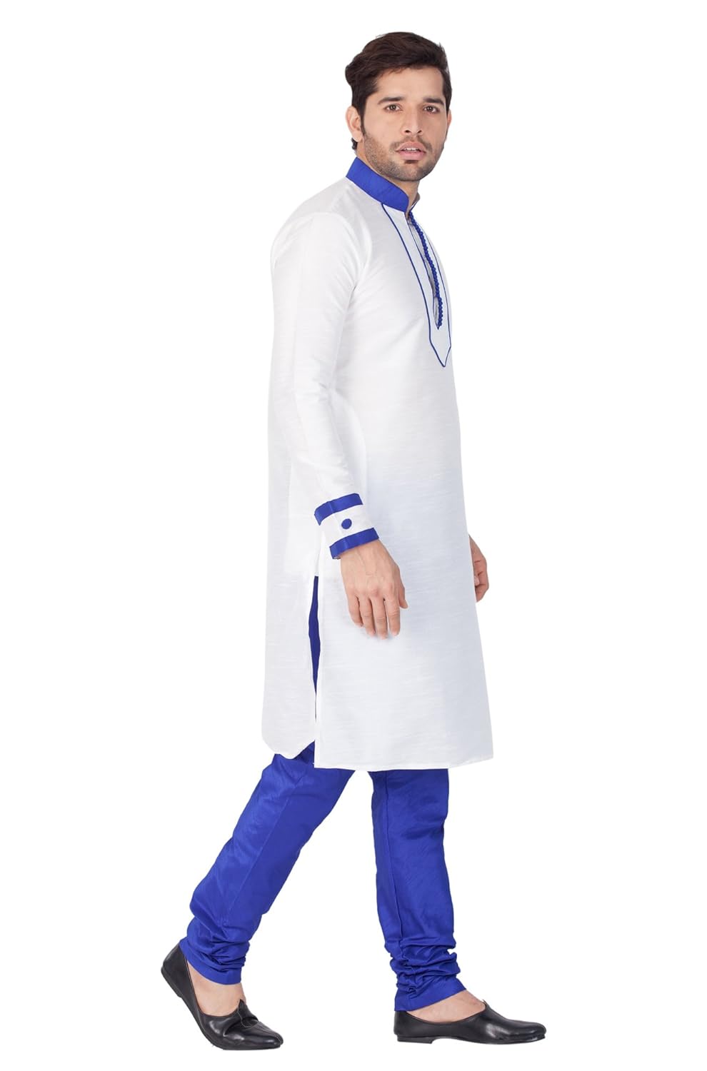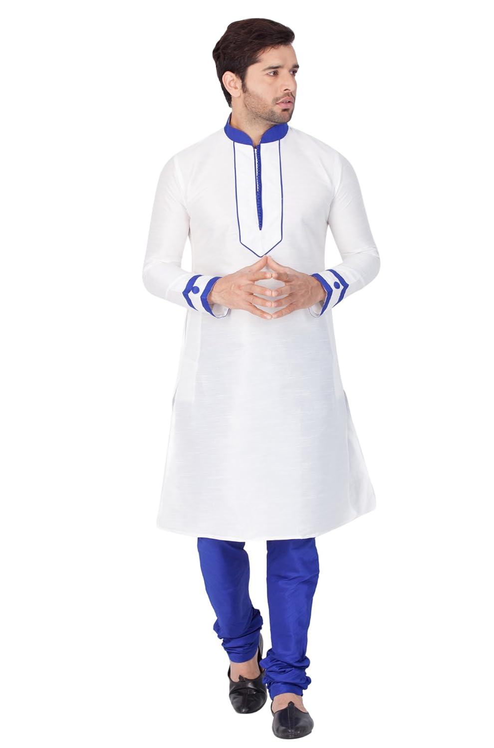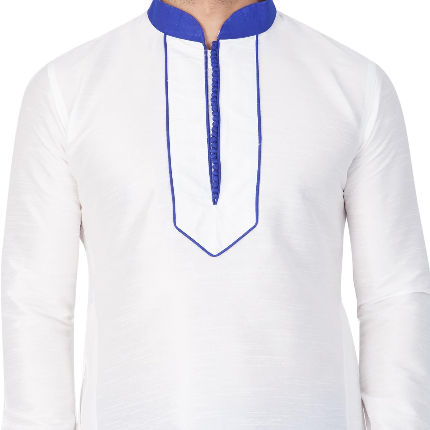 Vastramay brings to you this Stylish yet Comfortable Men White Men Cotton Silk Kurta with V Design Neck Line and Highlighting Beads and Churidar Pyjama Set. Adorn it for a perfect Classy & Trendy look. Pair it with a juti or a mojari for the Royal look. |