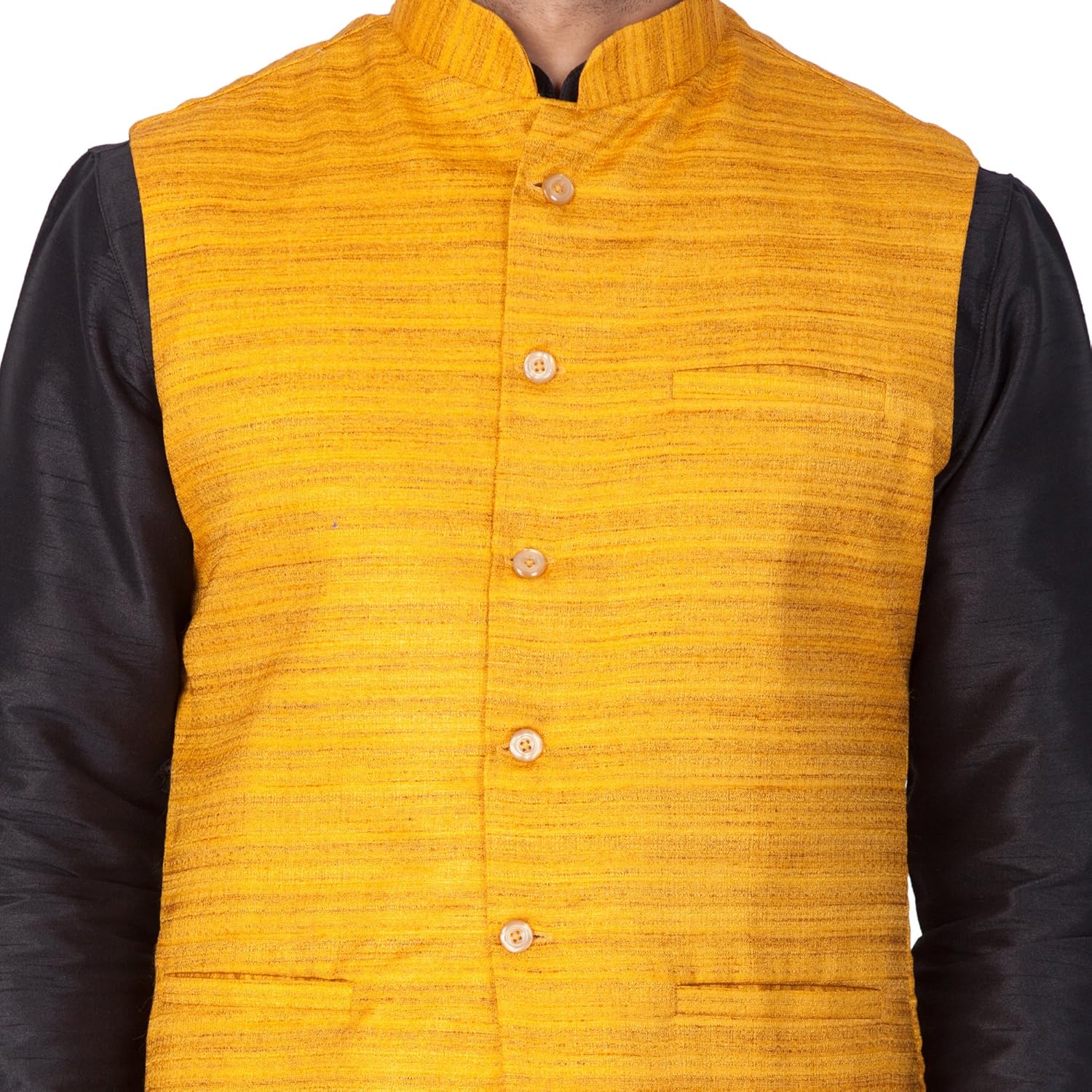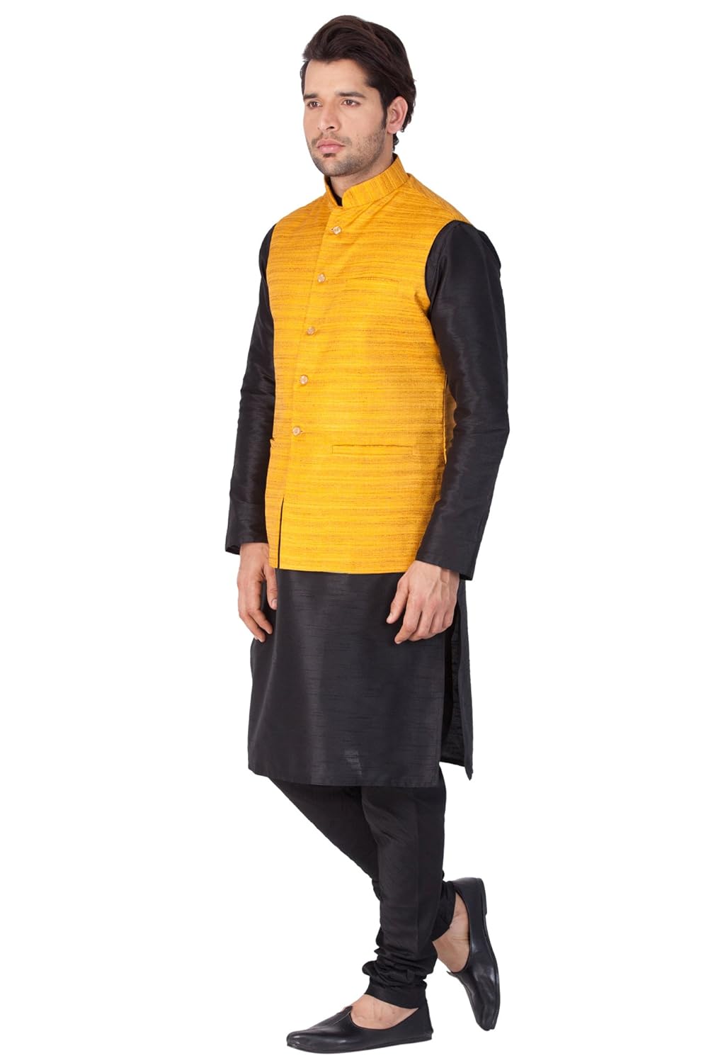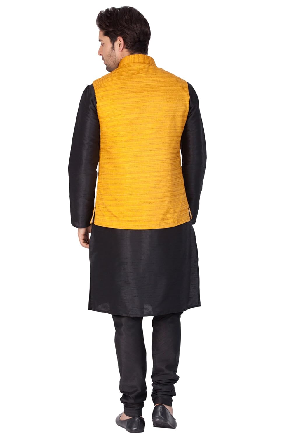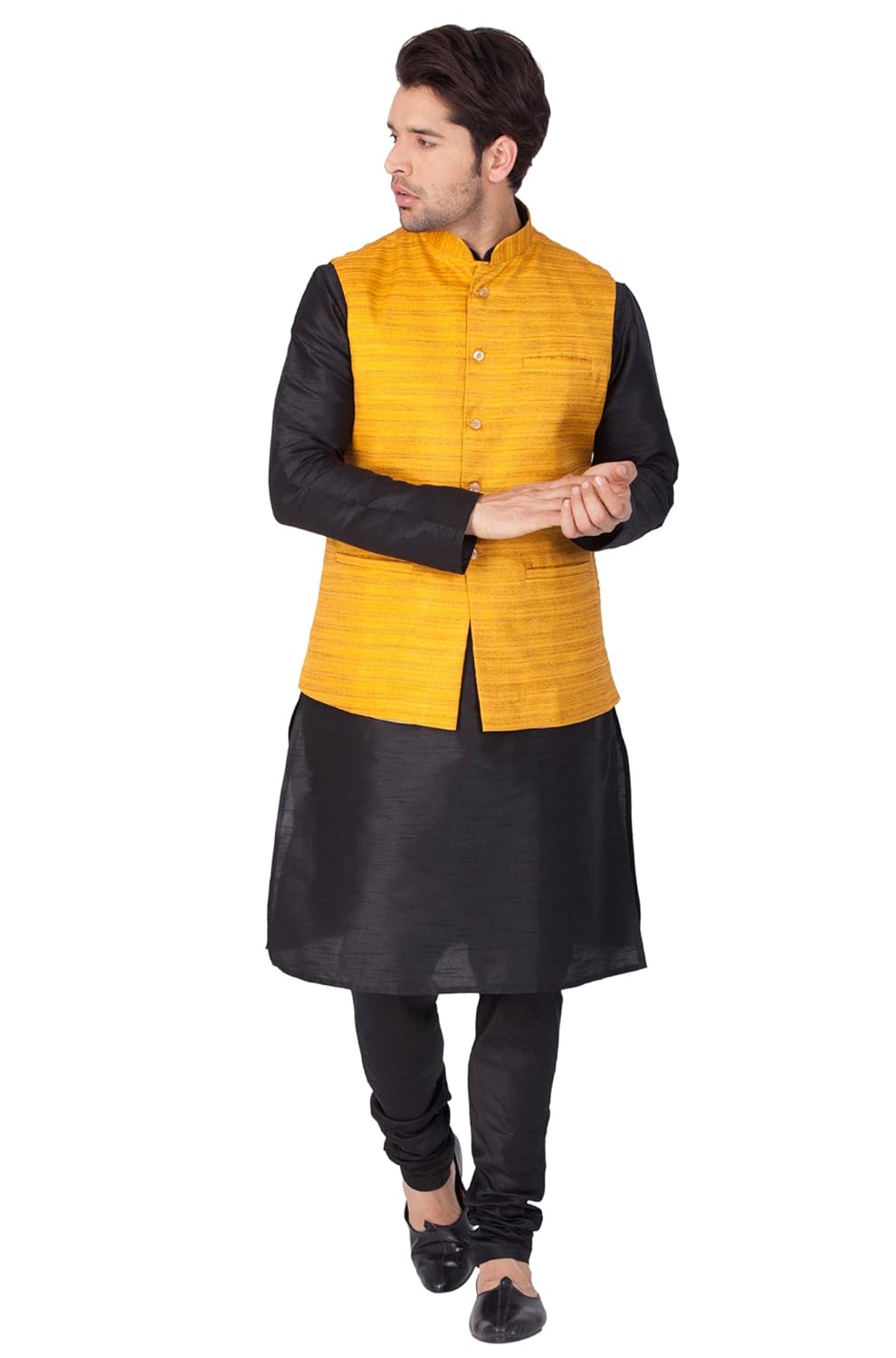 Vastramay brings to you this Stylish yet Comfortable Men Black Men Bhagalpuri Matka Feel Blended Cotton Modi Jacket, Cotton Silk Solid Kurta and Churidar Pyjama Set. Adorn it for a perfect Classy & Trendy look. Pair it with a juti or a mojari for the Royal look. |