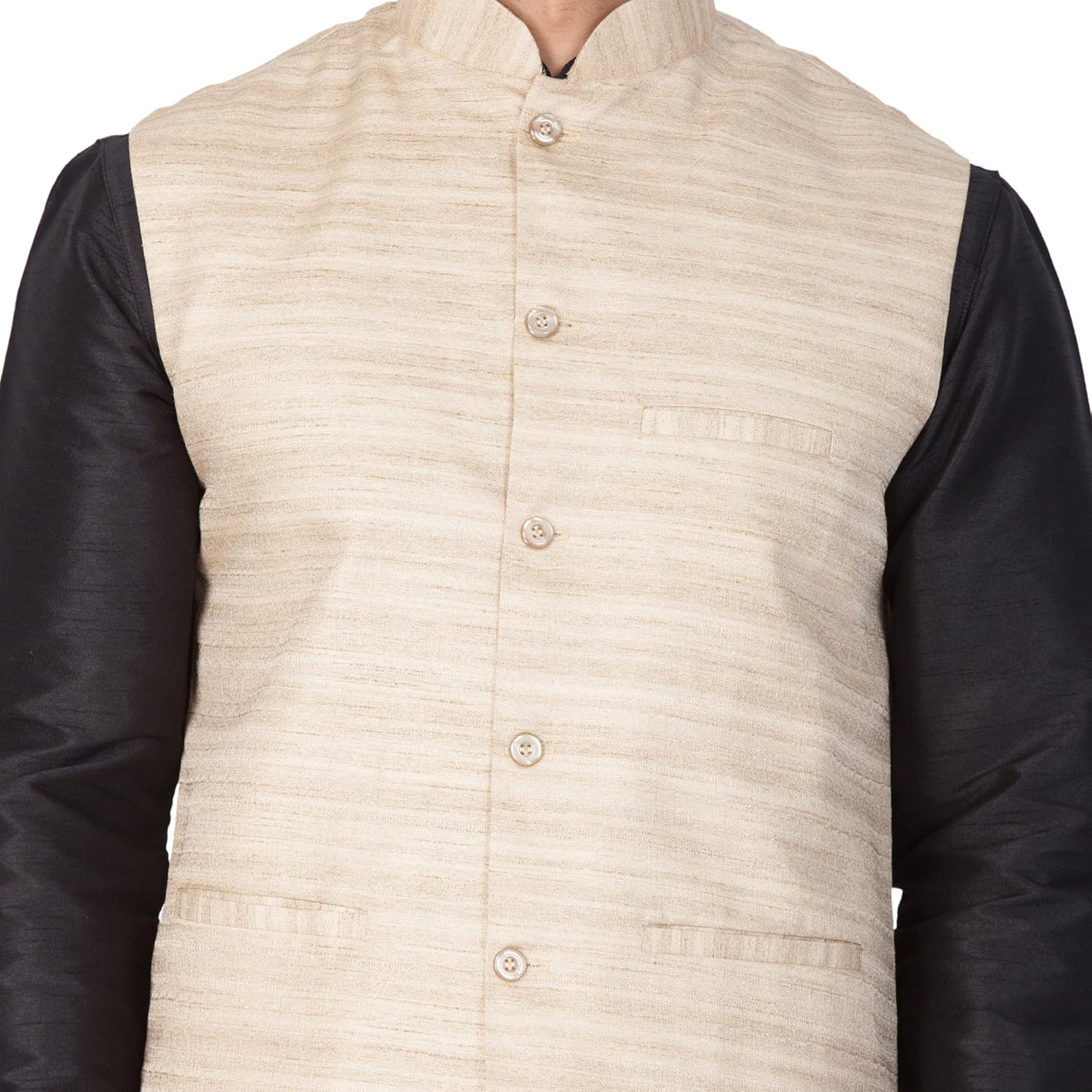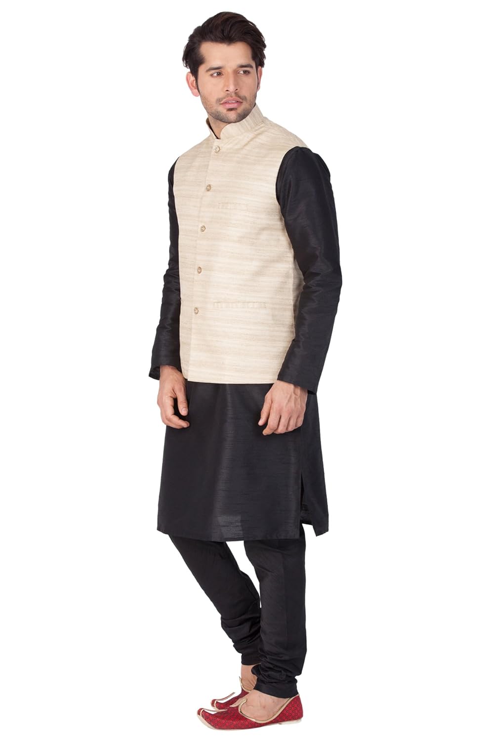 Vastramay brings to you this Stylish yet Comfortable Men Black Men Bhagalpuri Matka Feel Blended Cotton Modi Jacket, Cotton Silk Solid Kurta and Churidar Pyjama Set. Adorn it for a perfect Classy & Trendy look. Pair it with a juti or a mojari for the Royal feel. |