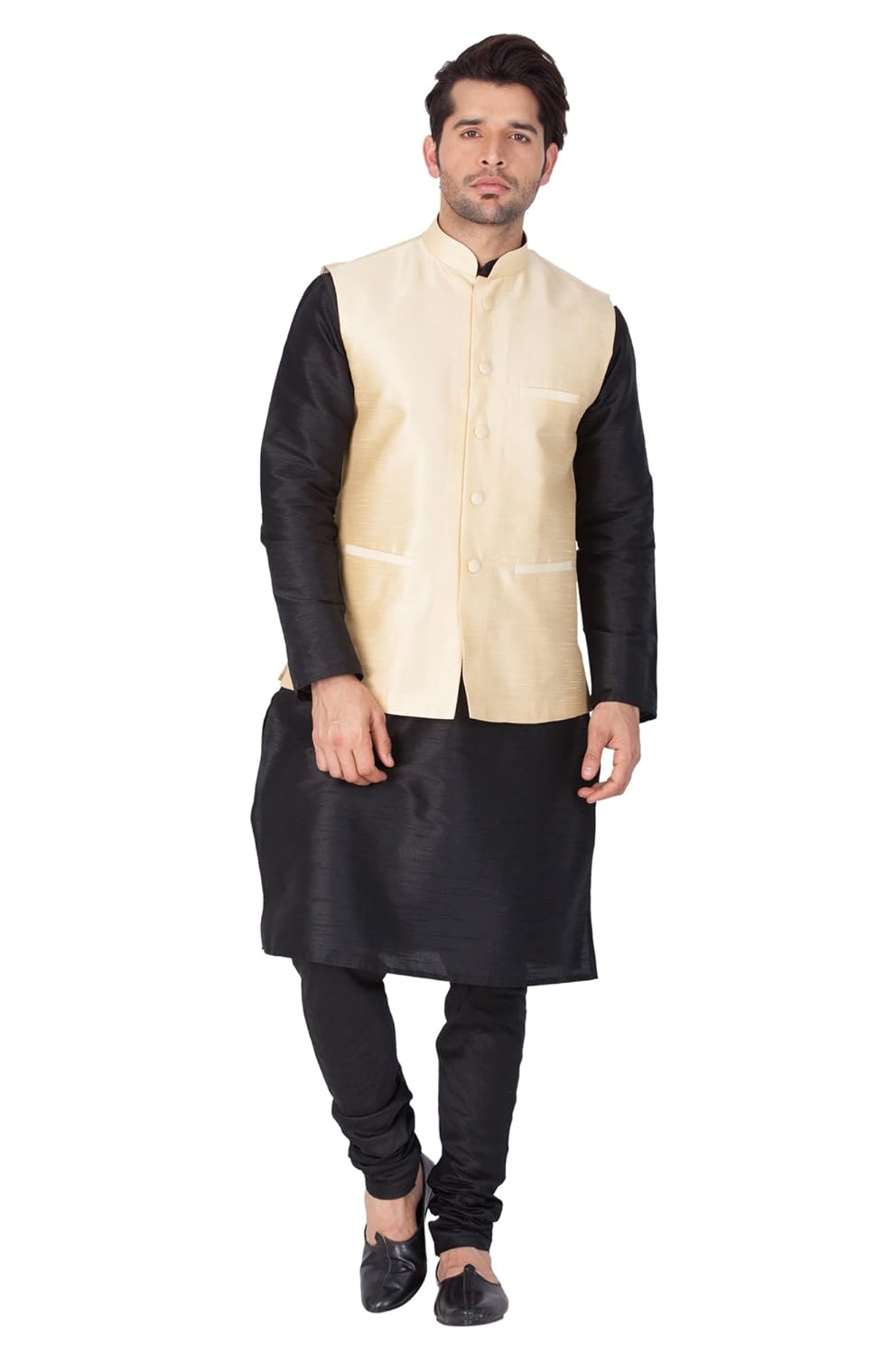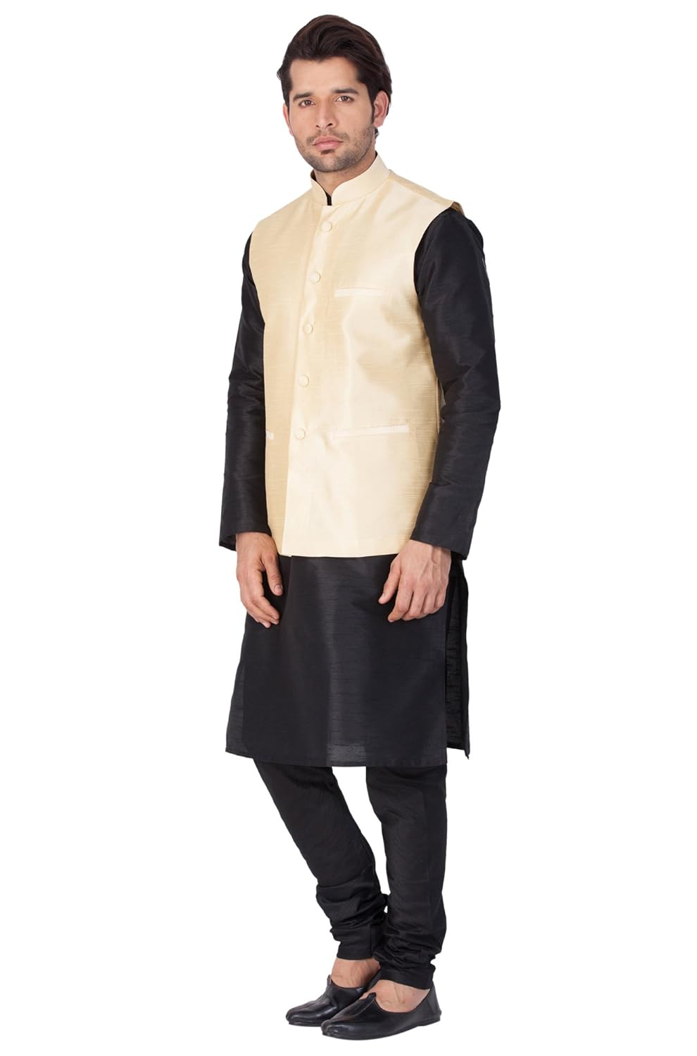 Vastramay brings to you this Stylish yet Comfortable Men Black Men Cotton Silk Modi Jacket, a Cotton Silk Solid Kurta and Churidar Pyjama Set. Adorn it for a perfect Classy & Trendy look. Pair it with a juti or a mojari for the Royal feel. |