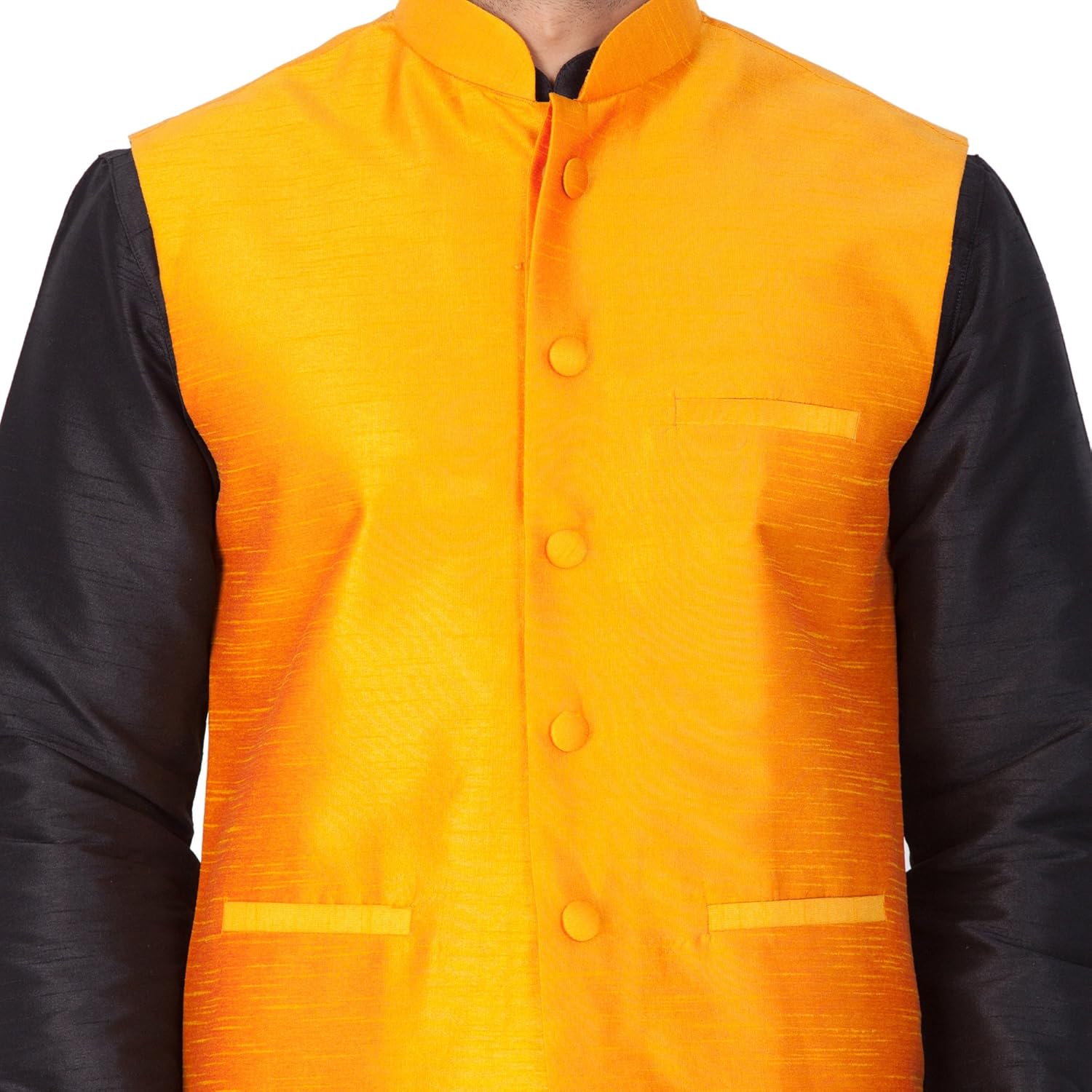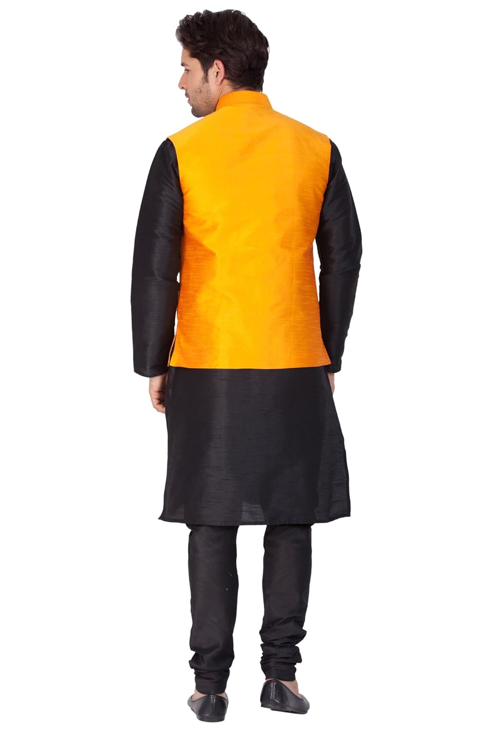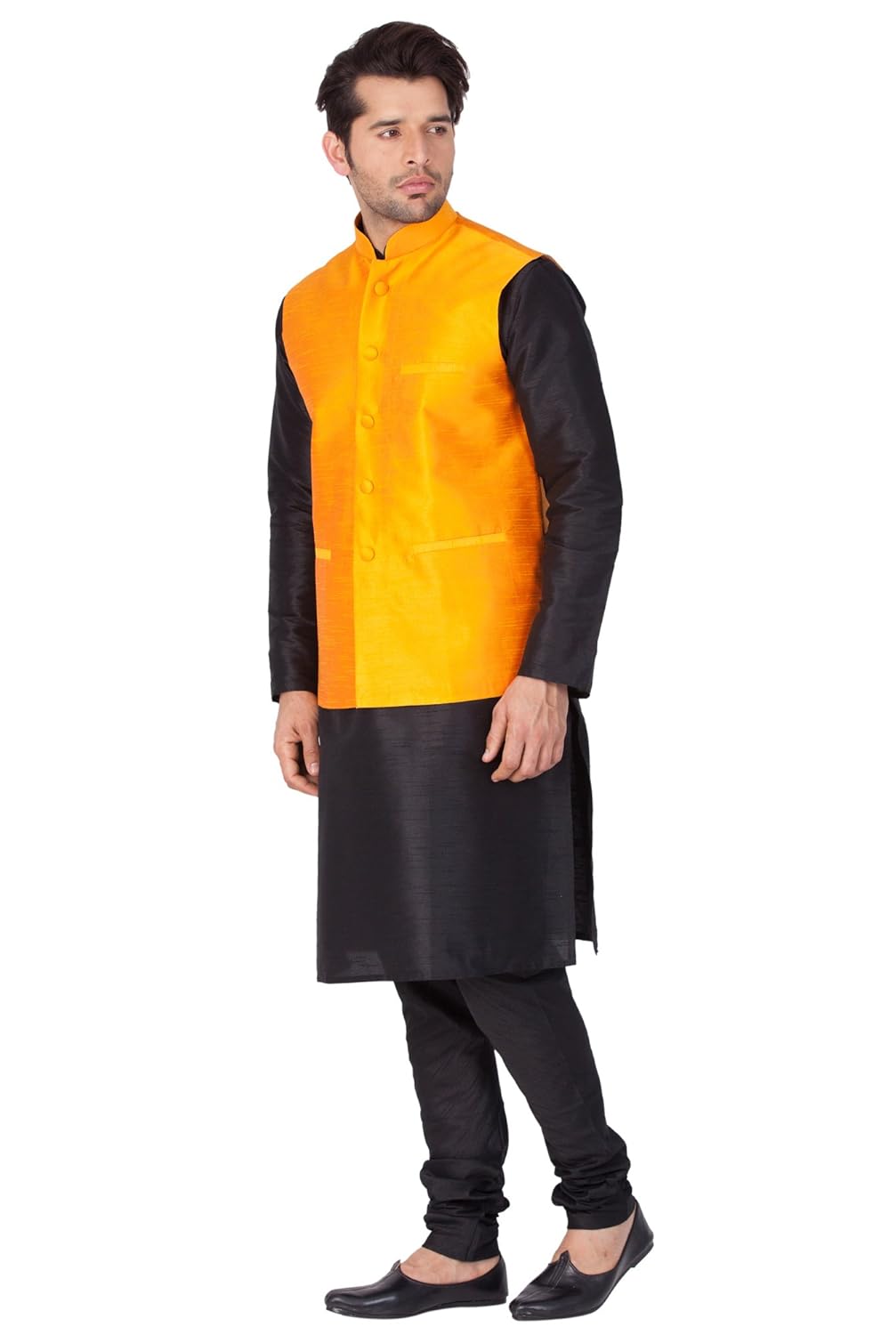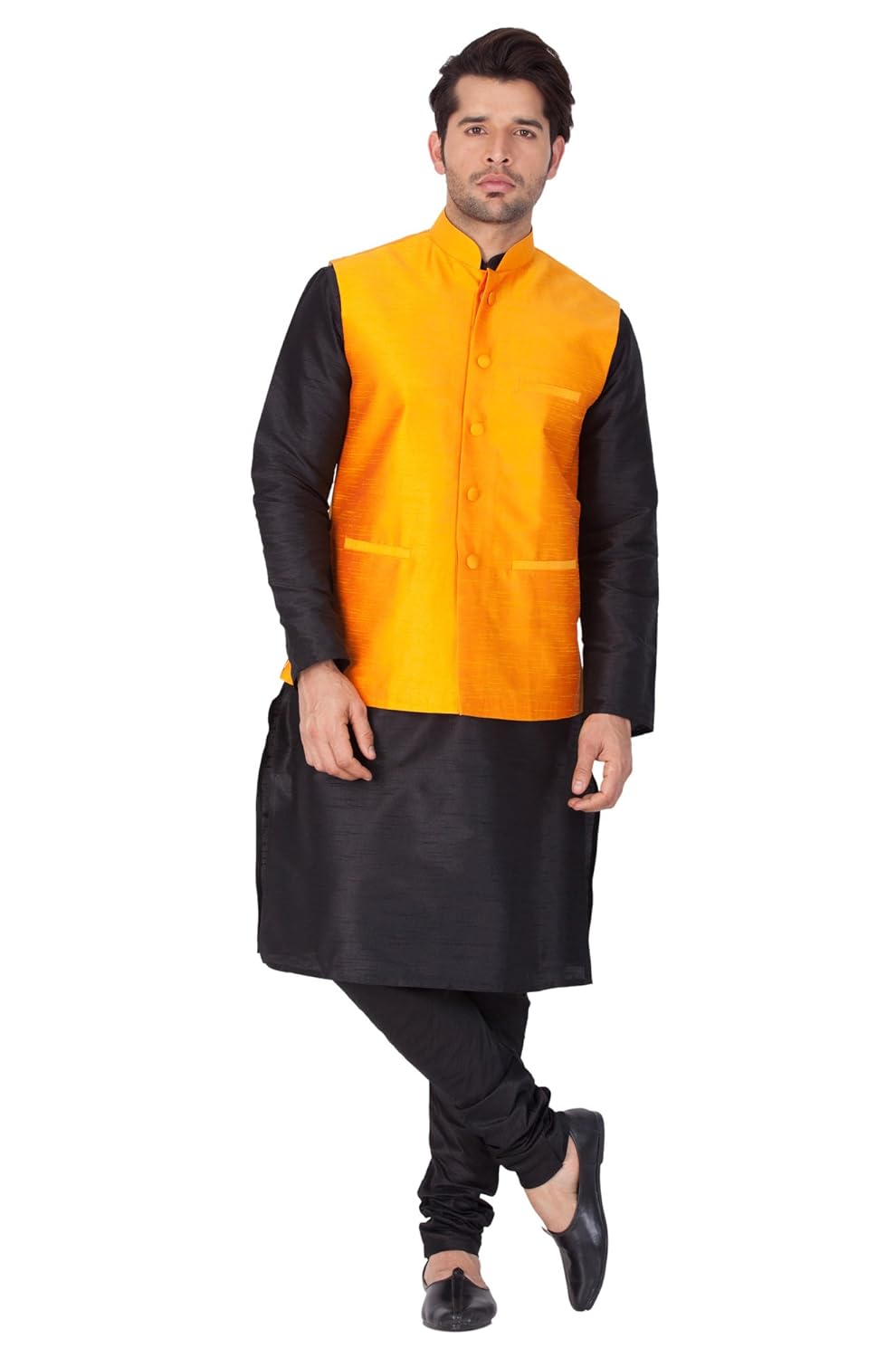 Vastramay brings to you this Stylish yet Comfortable Men Black Men Cotton Silk Modi Jacket, a Cotton Silk Solid Kurta and Churidar Pyjama Set. Adorn it for a perfect Classy & Trendy look. Pair it with a juti or a mojari for the Royal look. |
