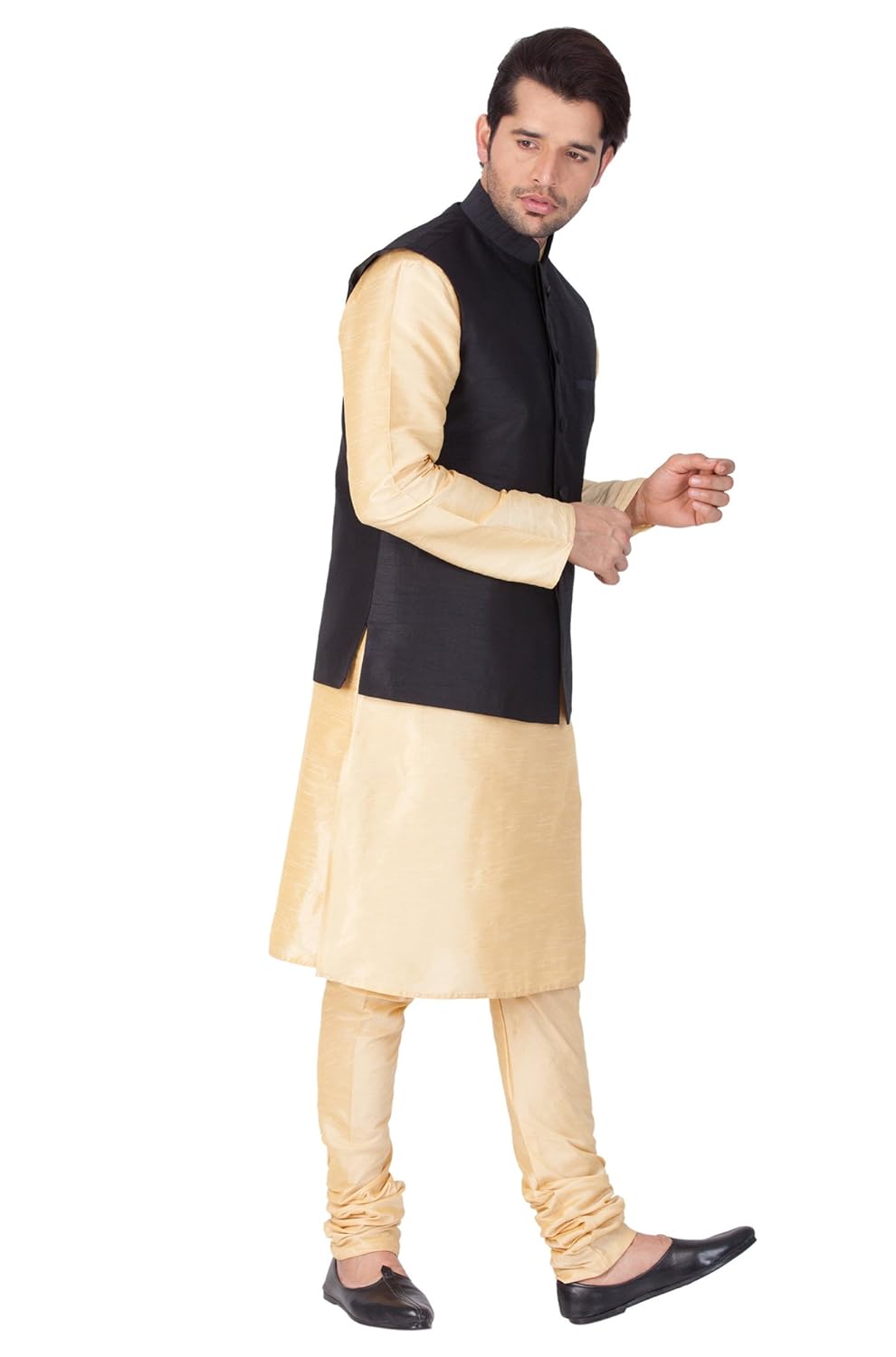 Vastramay brings to you this Stylish yet Comfortable Men Gold Men Solid Modi Jacket, a Cotton Silk Solid Kurta and Churidar Pyjama Set. Adorn it for a perfect Classy & Trendy look. Pair it with a juti or a mojari for the Royal feel. |