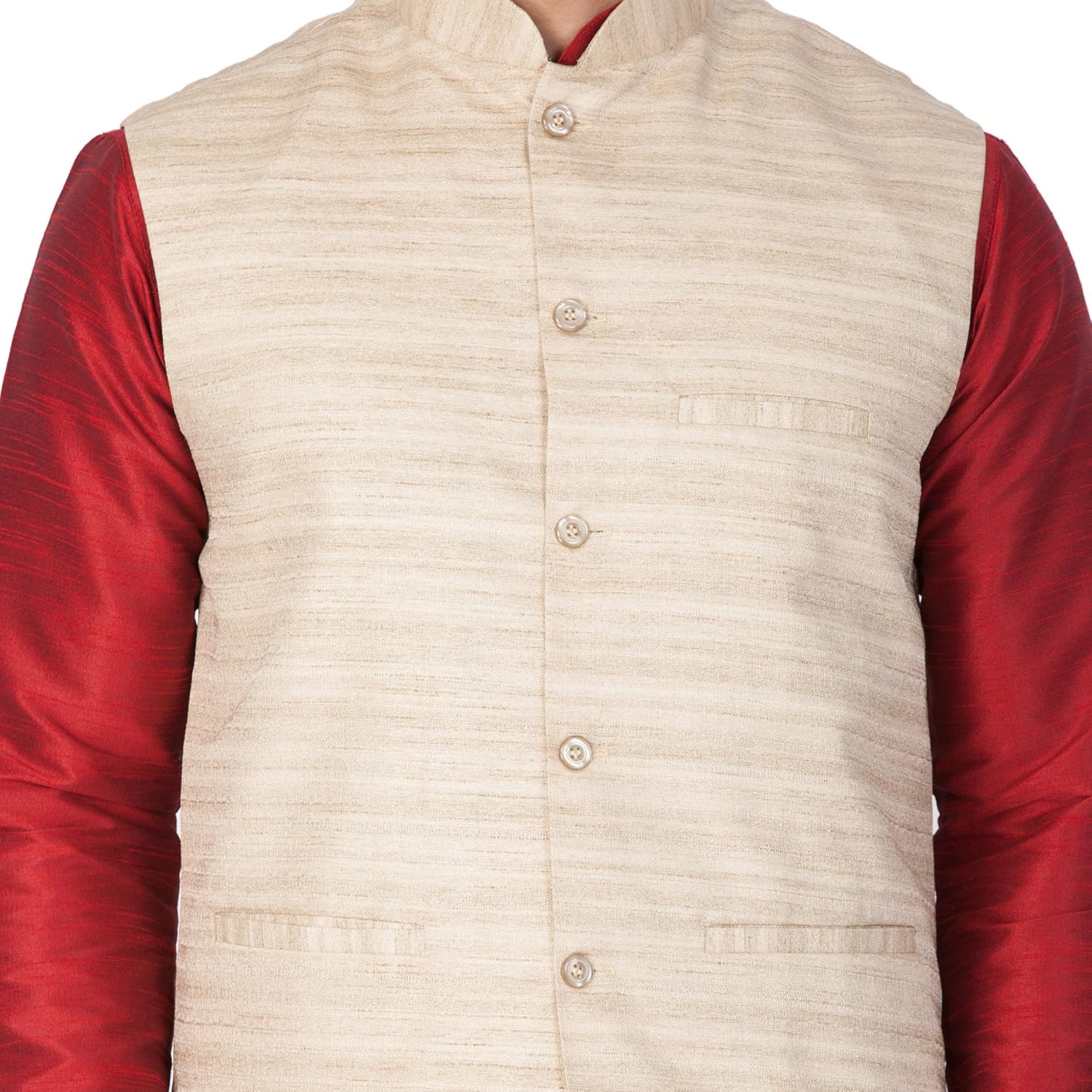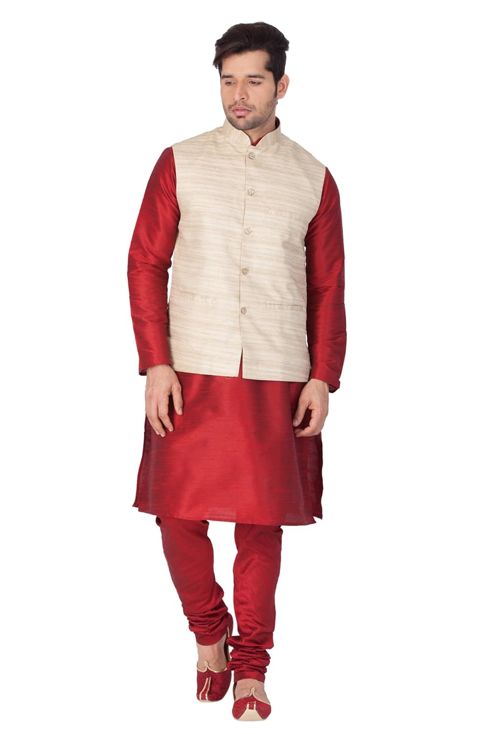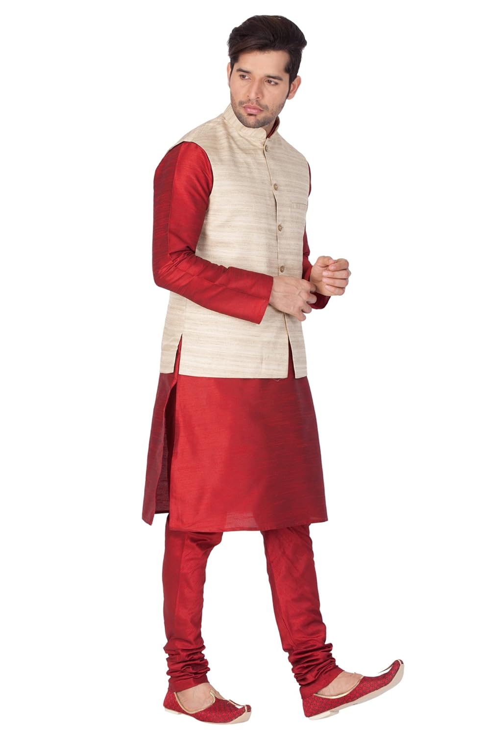 Vastramay brings to you this Stylish yet Comfortable Men Maroon Men Bhagalpuri Matka Feel Blended Cotton Modi Jacket, Cotton Silk Solid Kurta and Churidar Pyjama Set. Adorn it for a perfect Classy & Trendy look. Pair it with a juti or a mojari for the Royal feel. |