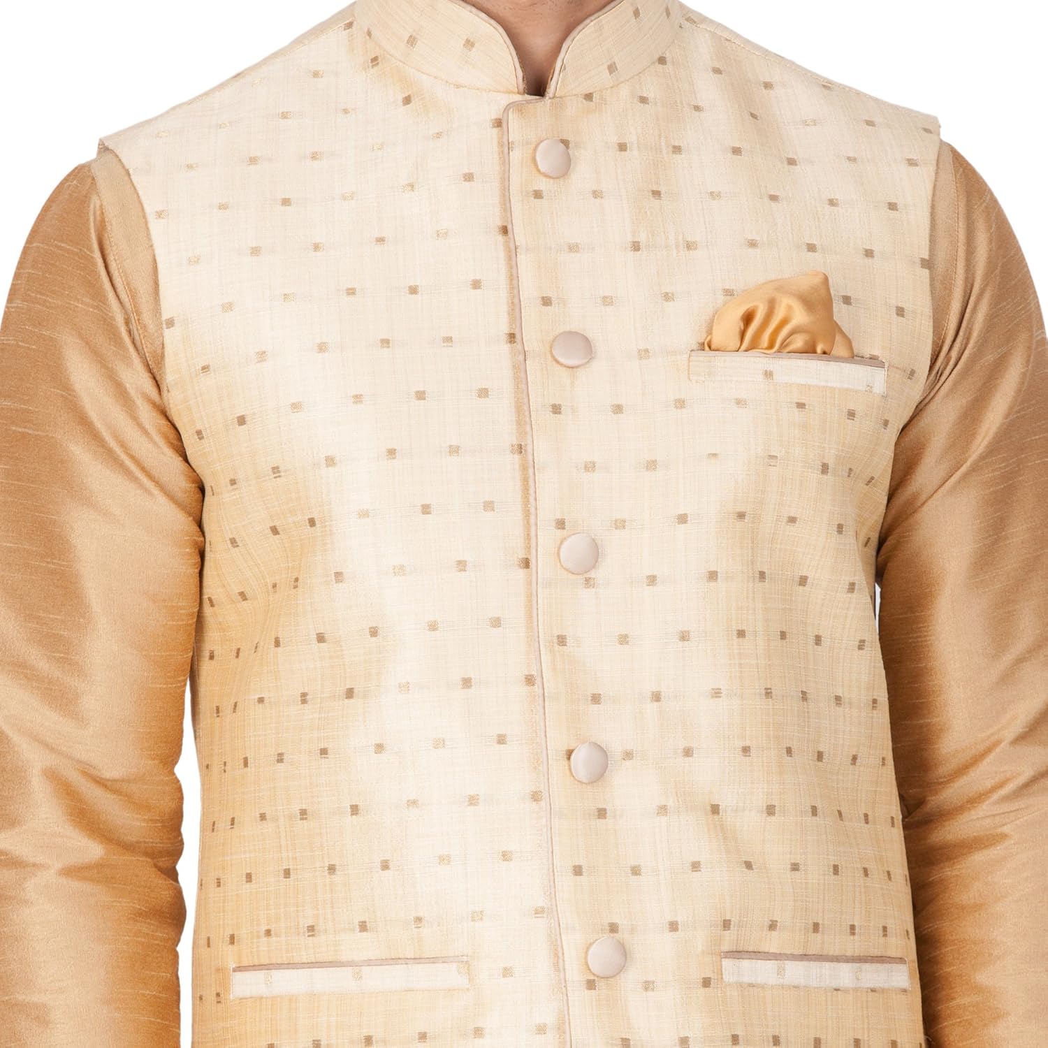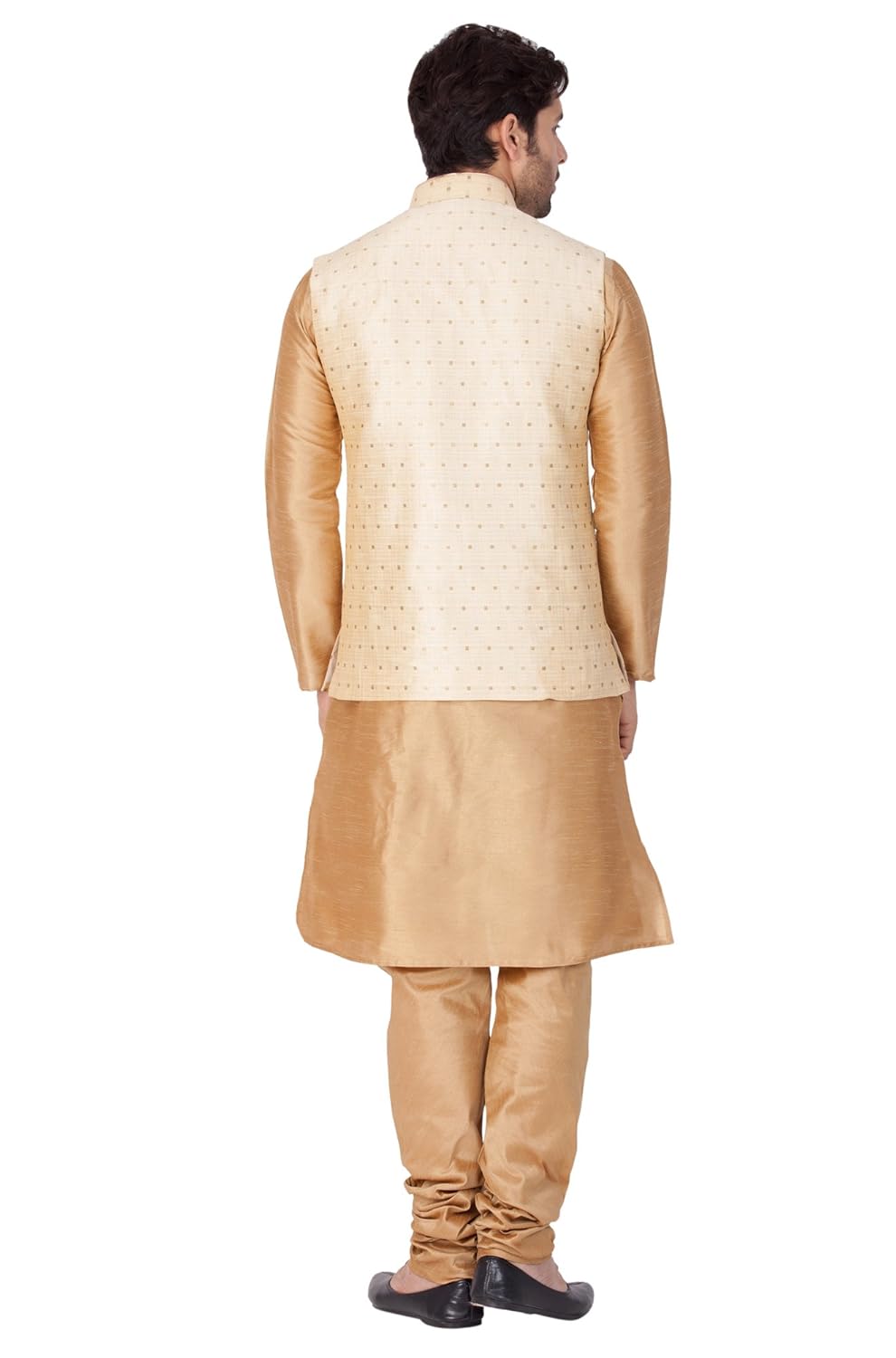 Vastramay brings to you this Stylish yet Comfortable Men Rose Gold Men Woven Jari Jaquard Blended Cotton Modi Jacket, Cotton Silk Solid Kurta and Churidar Pyjama Set. Adorn it for a perfect Classy & Trendy look. Pair it with a juti or a mojari for the Royal look. |