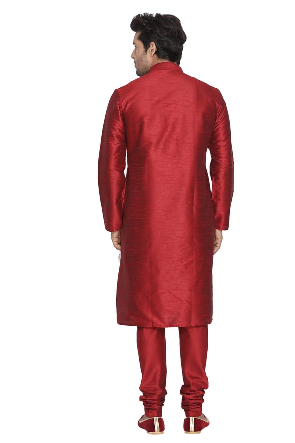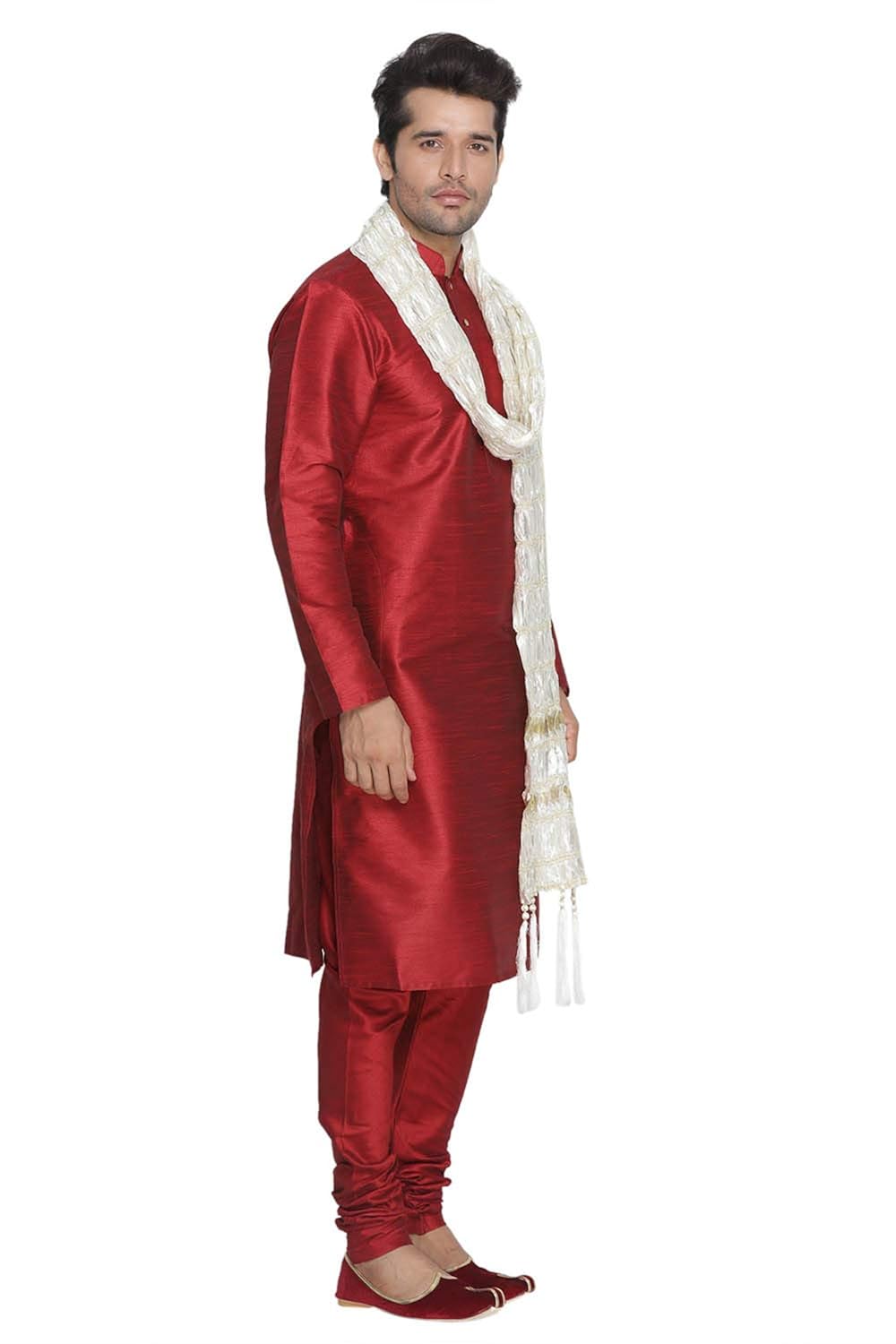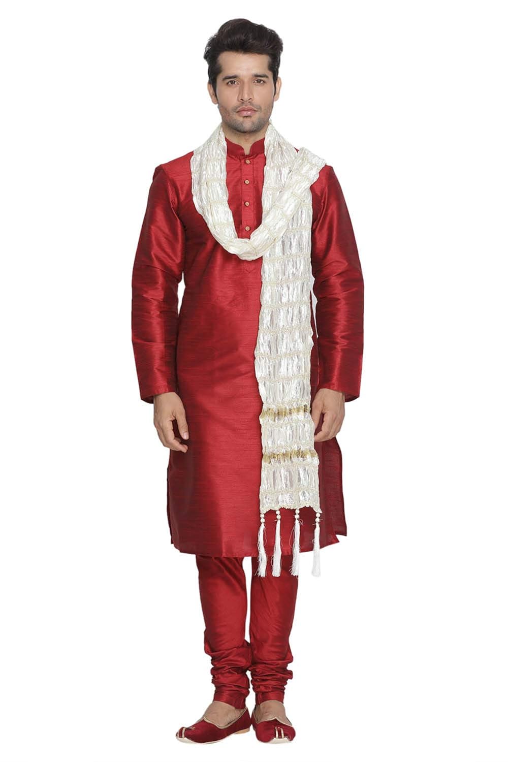 Vastramay brings to you this Stylish yet Comfortable Men Maroon and Cream Kurta Pyjama Set with a Matching Dupatta. Adorn it for a perfect Classy & Trendy look. Pair it with a juti or a mojari for the Royal feel. |