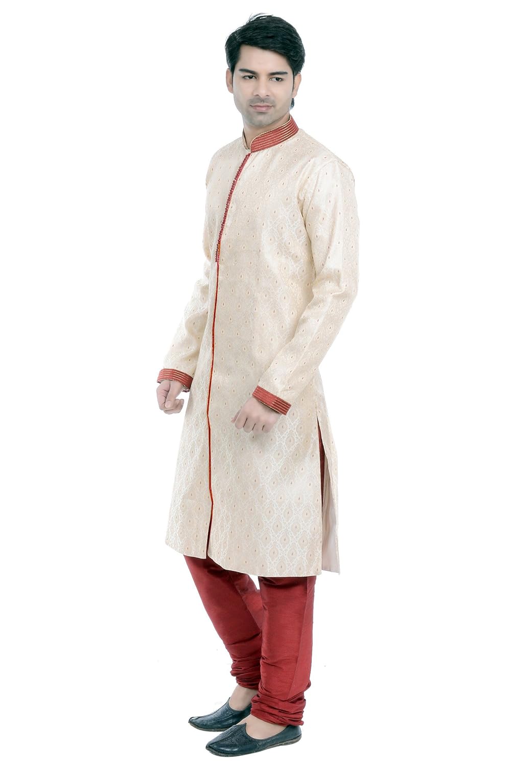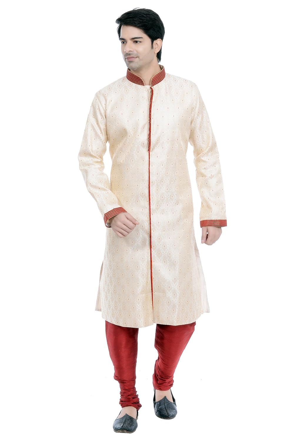 Vastramay brings to you this Stylish yet Comfortable Men Gold Men Cotton Silk Banarasi Brocade Kurta Sherwani With Churidar Pyjama Set. Adorn it for a perfect Classy & Trendy look. Pair it with a juti or a mojari for the Royal feel. |
