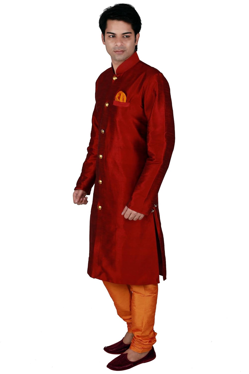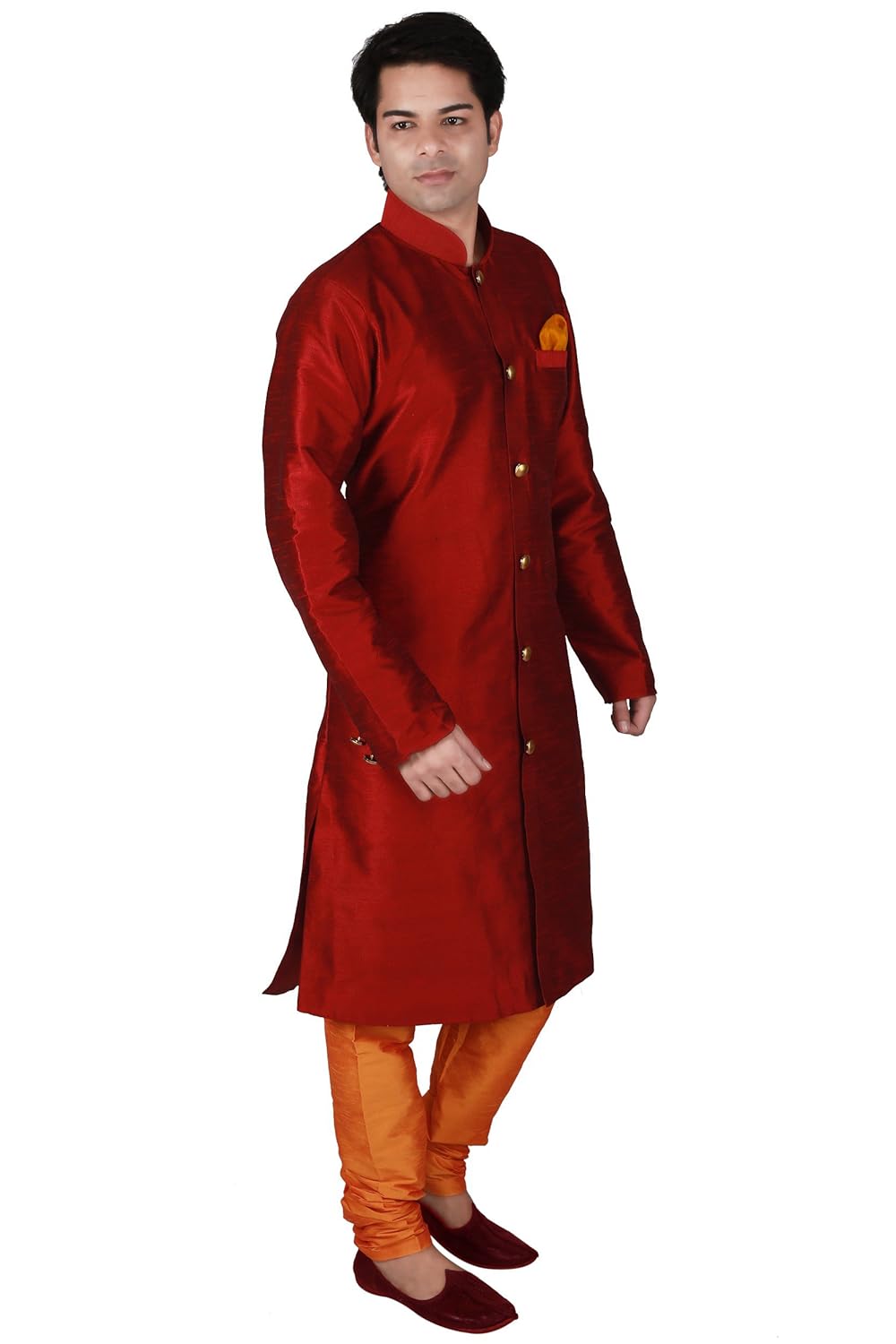 Vastramay brings to you this Stylish yet Comfortable Men Maroon Men Cotton Silk Kurta Sherwani With Churidar Pyjama Set. Adorn it for a perfect Classy & Trendy look. Pair it with a juti or a mojari for the Royal feel. |