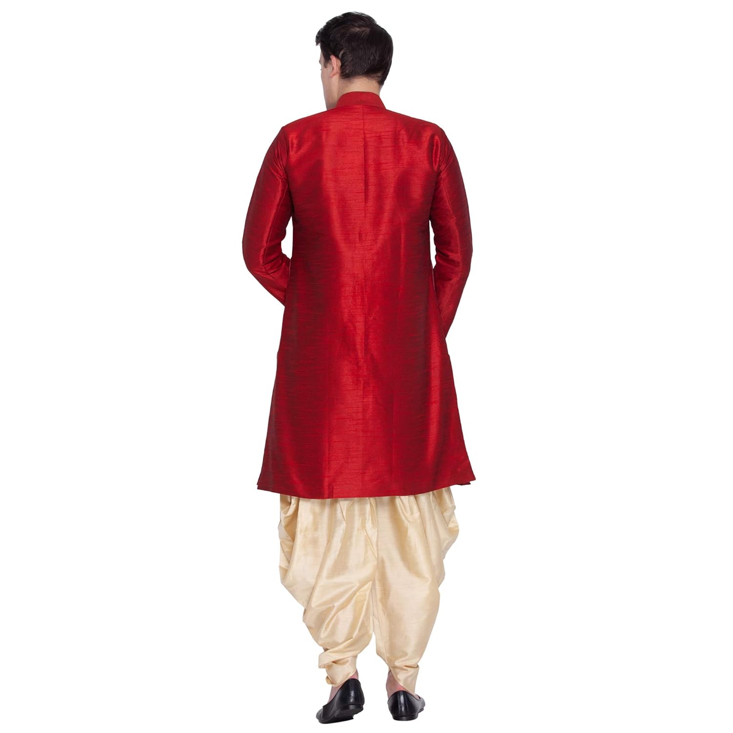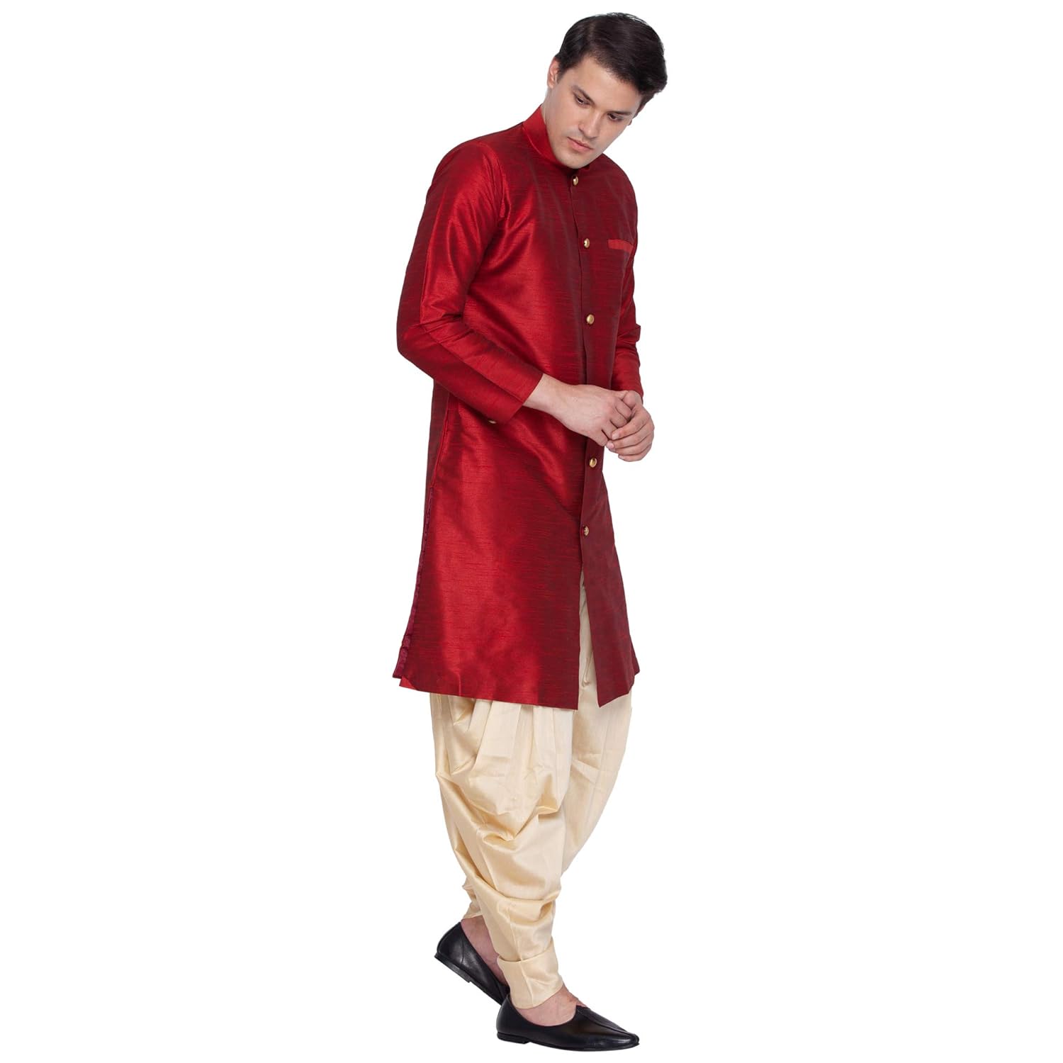 Vastramay brings to you this Stylish yet Comfortable Men Maroon and Gold Men Indowestern Style Sherwani With Cowl Style Patiala Dhoti Pant Set. Adorn it for a perfect Classy & Trendy look. Pair it with a juti or a mojari for the Royal feel. |