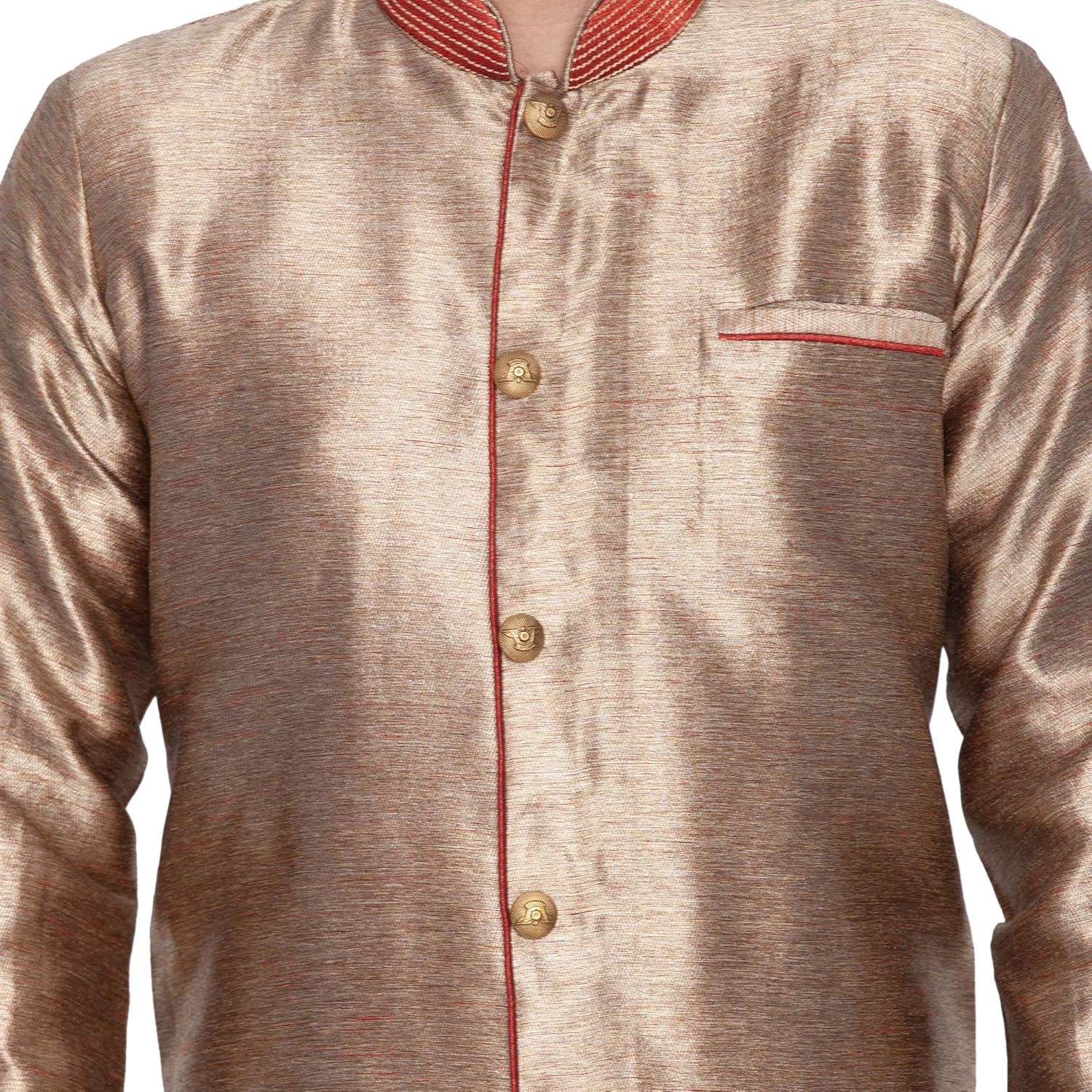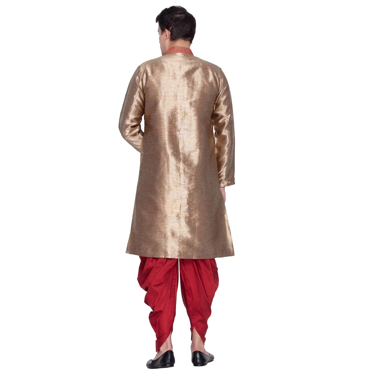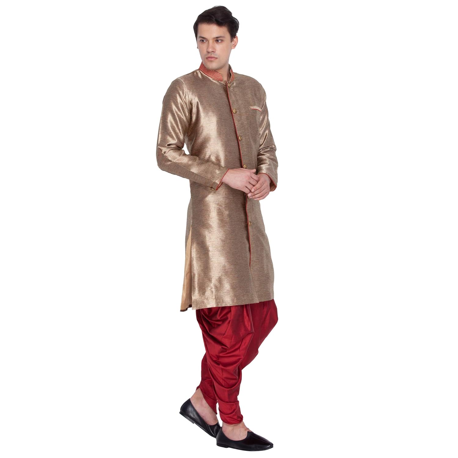 Vastramay brings to you this Stylish yet Comfortable Men Antique Gold and Marron Men Cotton Silk Banarasi Brocade Indowestern Sherwani With Cowl Style Patiala Dhoti Pant Set. Adorn it for a perfect Classy & Trendy look. Pair it with a juti or a mojari for the Royal feel. |