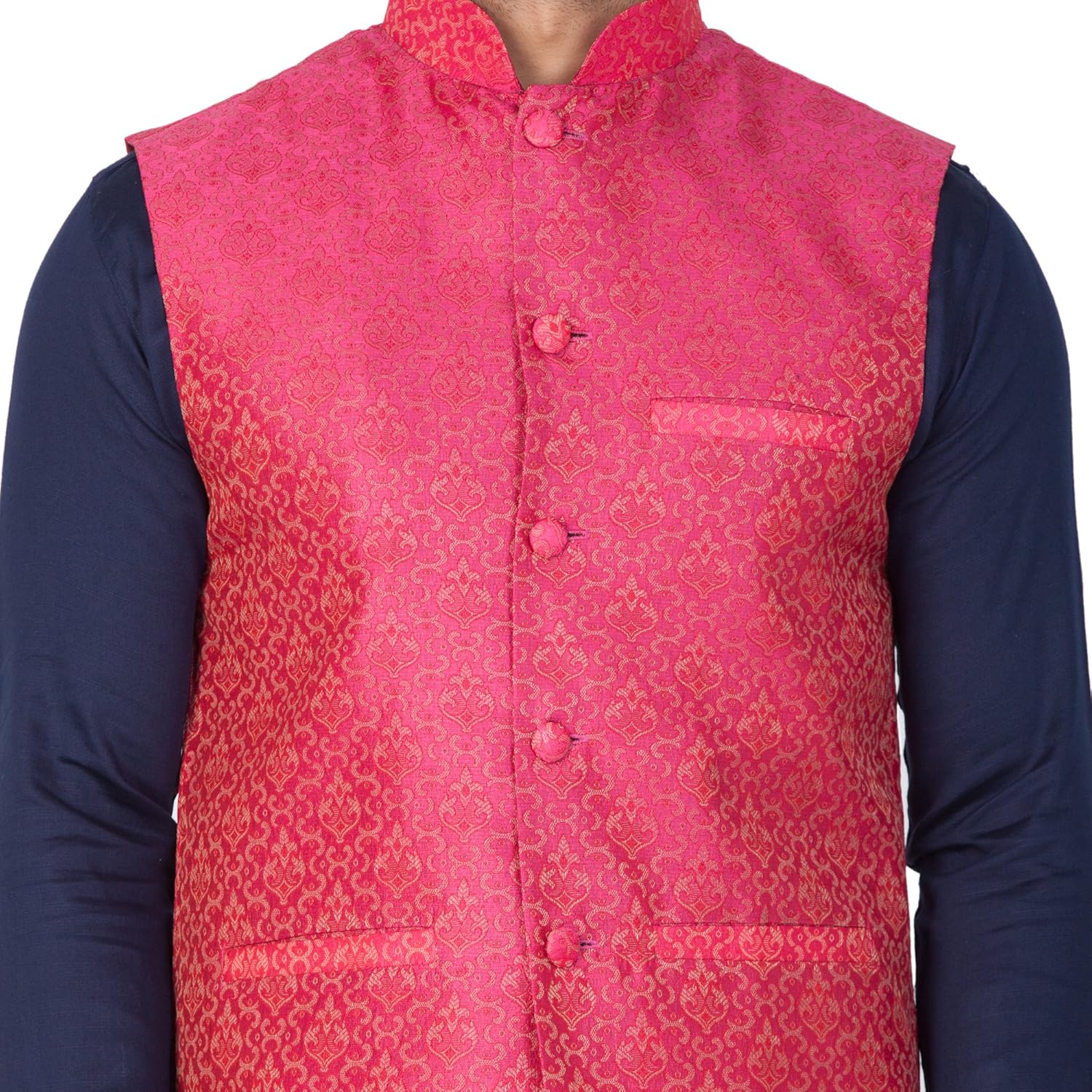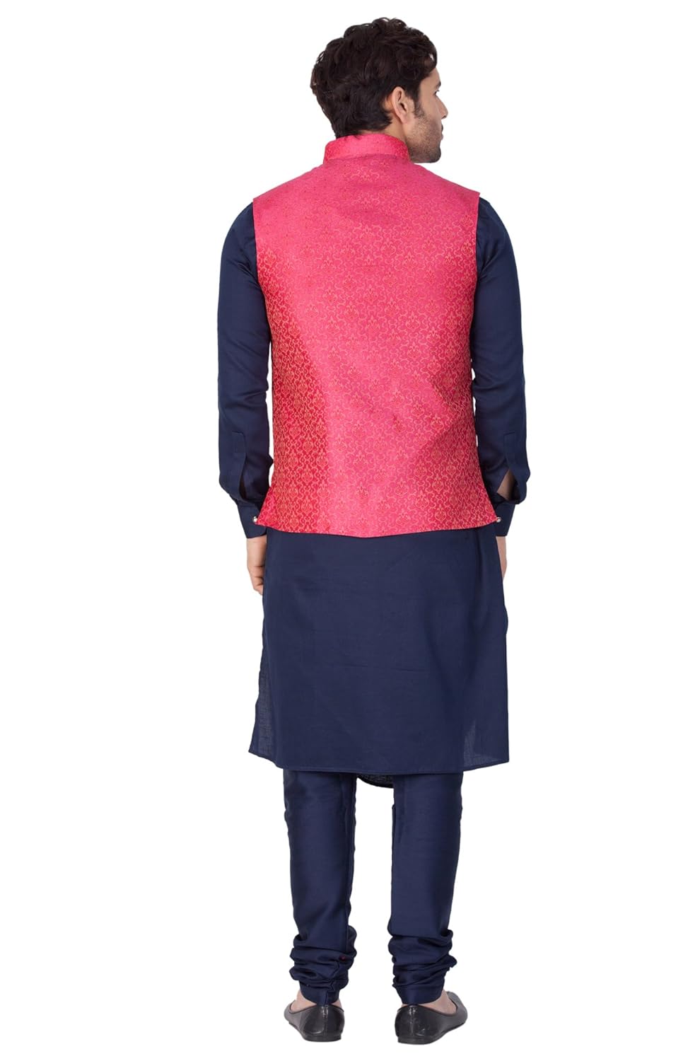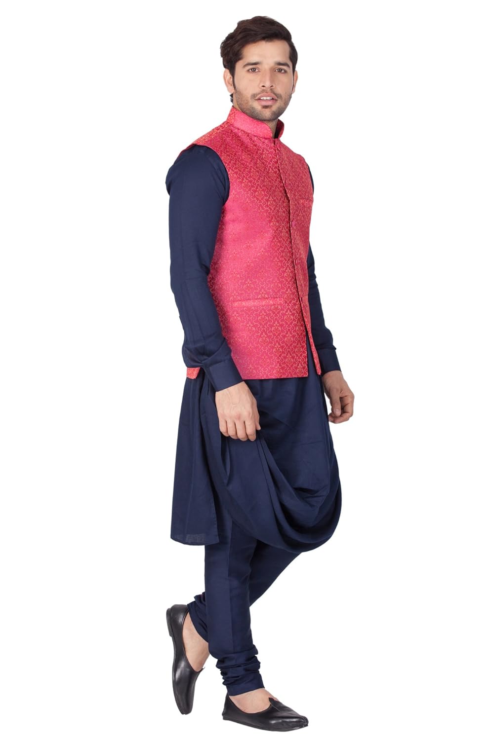 Vastramay brings to you this Stylish yet Comfortable Men Navy Blue Men Soft Cotton Asymmetrical Cowl Drape Style Kurta with Banarasi Jacquard Jacket and Churidar Pyjama Set. Adorn it for a perfect Classy & Trendy look. Pair it with a juti or a mojari for the Royal feel. |