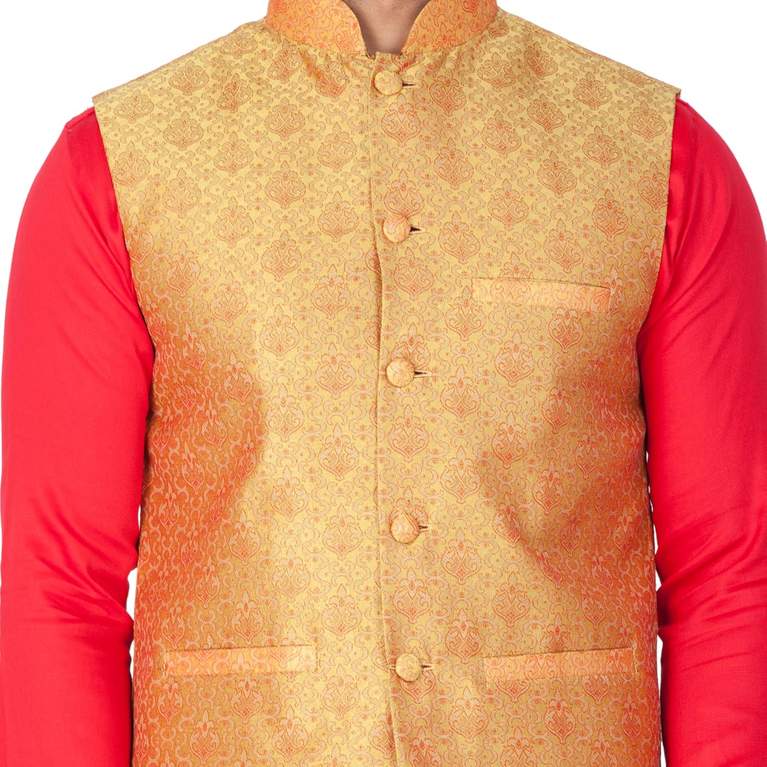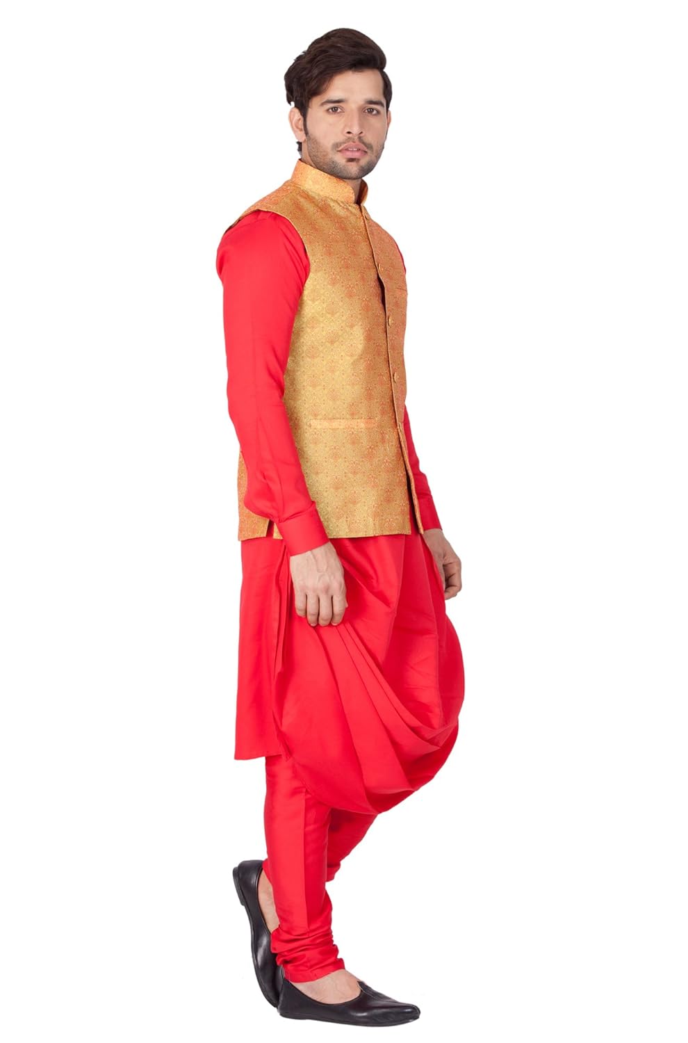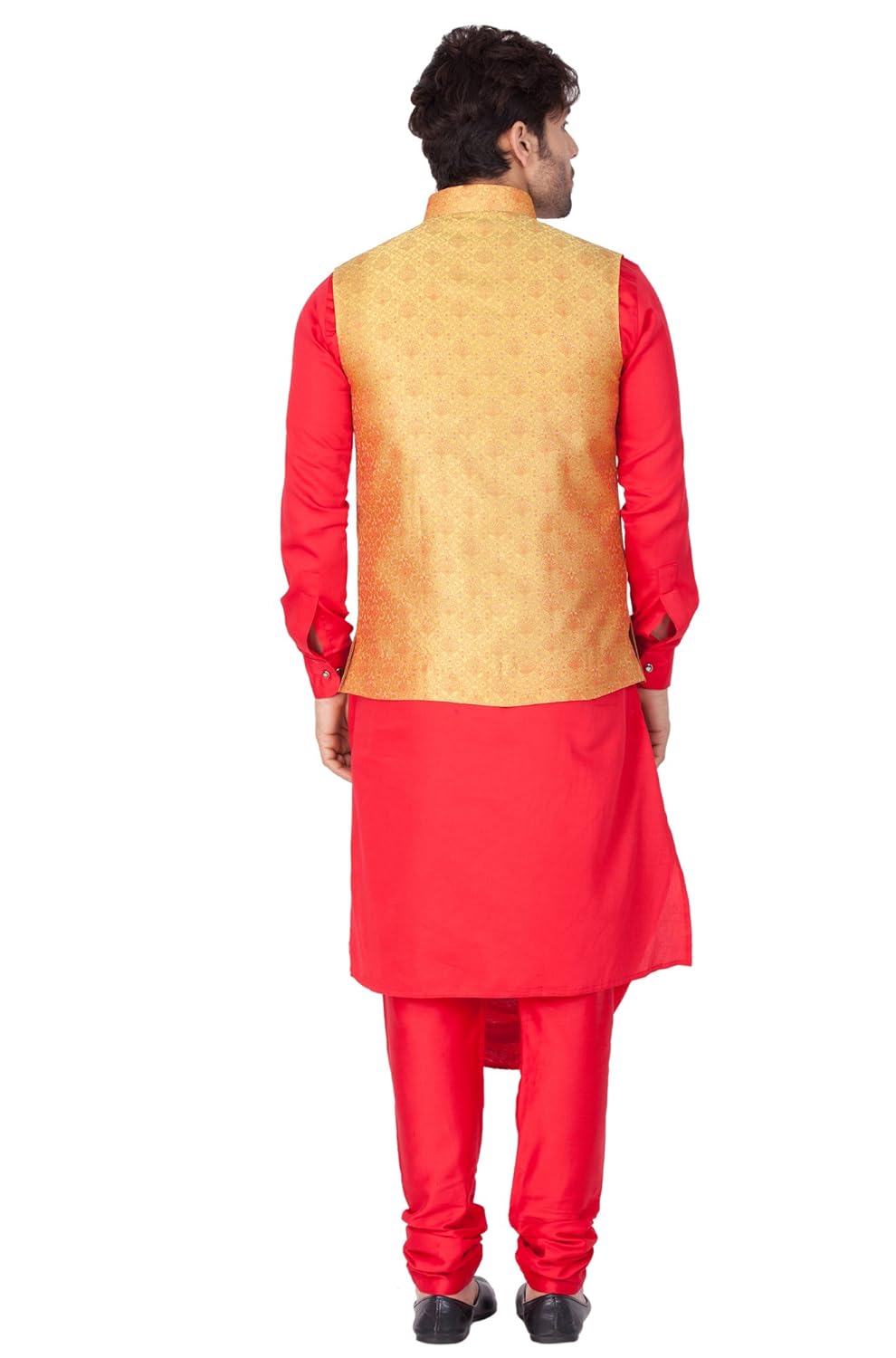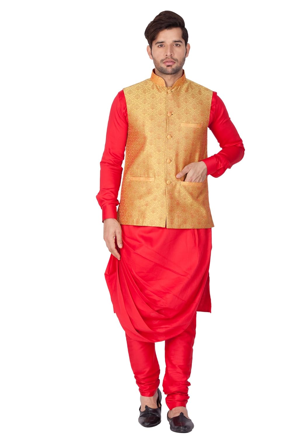 Vastramay brings to you this Stylish yet Comfortable Men Red Men Soft Cotton Asymmetrical Cowl Drape Style Kurta with Banarasi Jacquard Jacket and Churidar Pyjama Set. Adorn it for a perfect Classy & Trendy look. Pair it with a juti or a mojari for the Royal feel. |