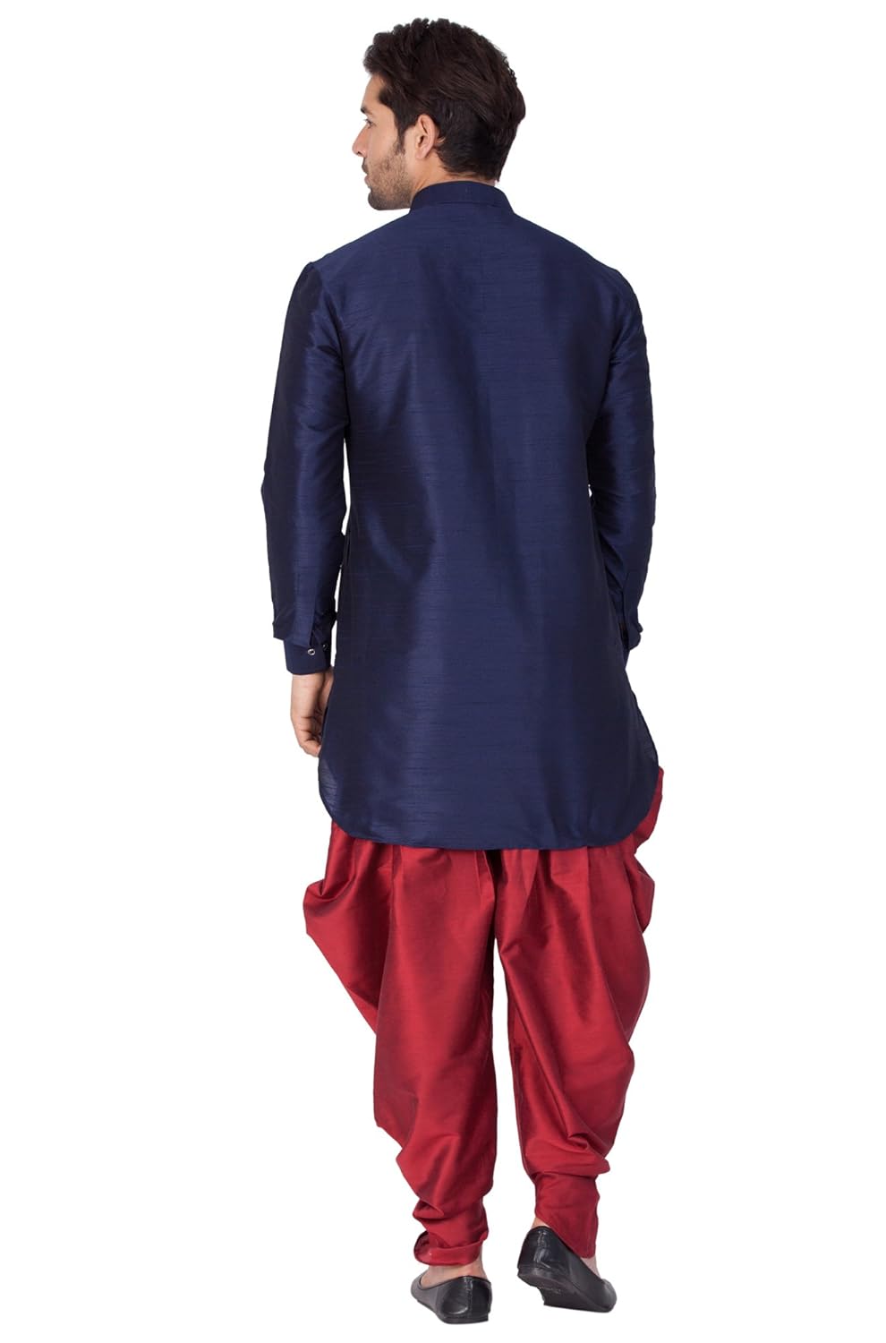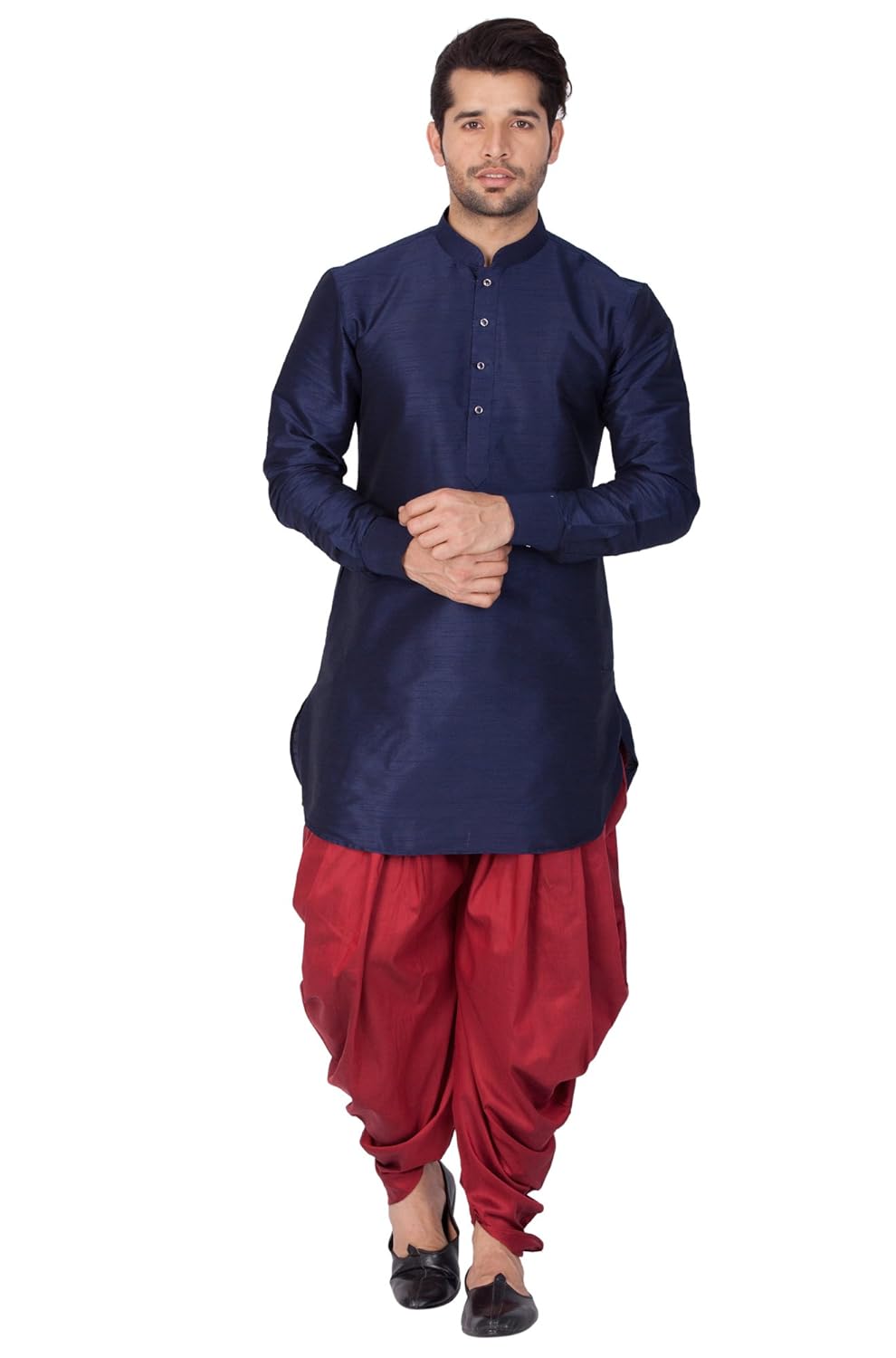 Vastramay brings to you this Stylish yet Comfortable Men Navy Blue Curved Shape Men Cotton Silk Mid Length Kurta With Buttoned Calf with Cowl Style Patiala Dhoti Pant Set. Adorn it for a perfect Classy & Trendy look. Pair it with a juti or a mojari for the Royal feel. |
