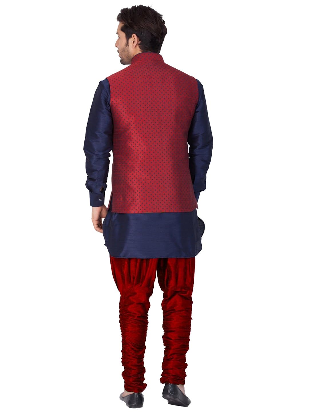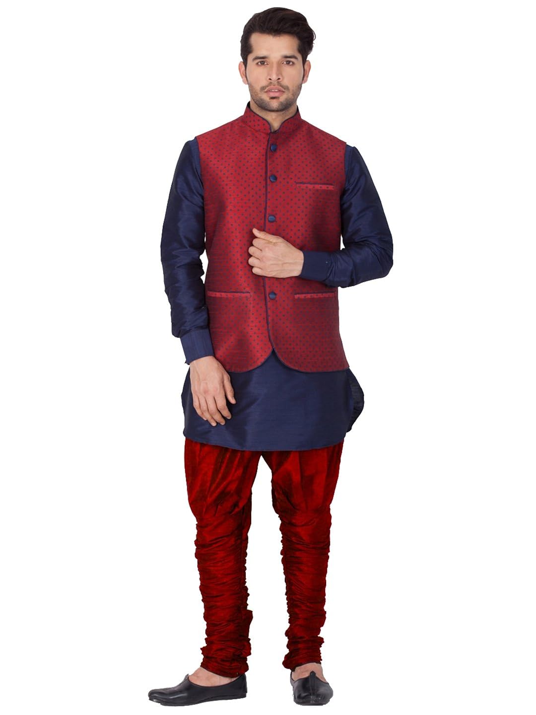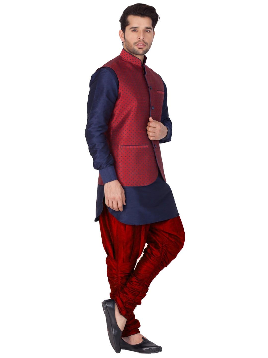 Vastramay brings to you this Stylish yet Comfortable Men Navy Blue Men Cotton Silk Printed Curved Hem Modi Jacket, a Curved Shape Men Cotton Silk Mid Length Kurta With Buttoned Calf paired with a Breedges. Adorn it for a perfect Classy & Trendy look. Pair it with a juti or a mojari for the Royal feel. |