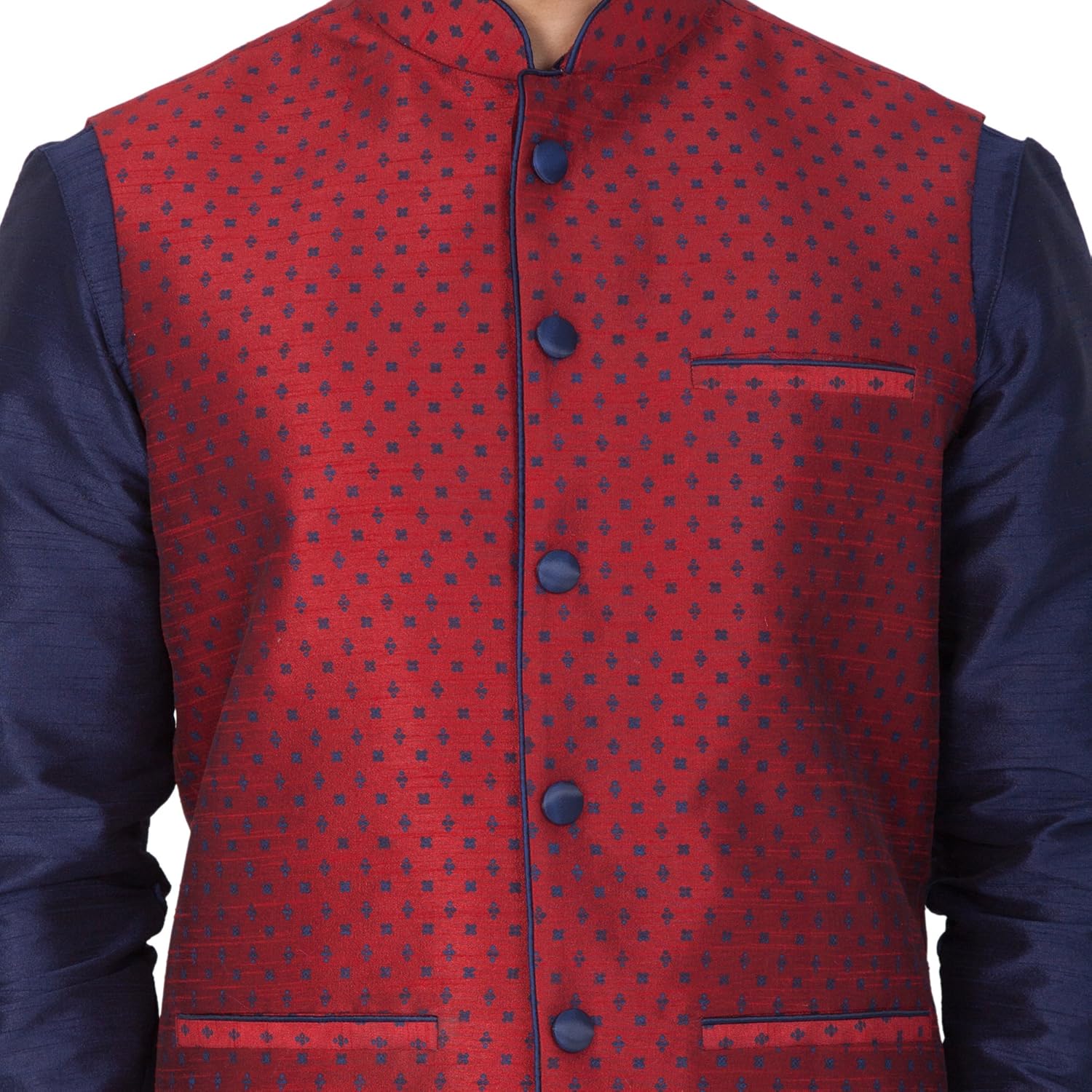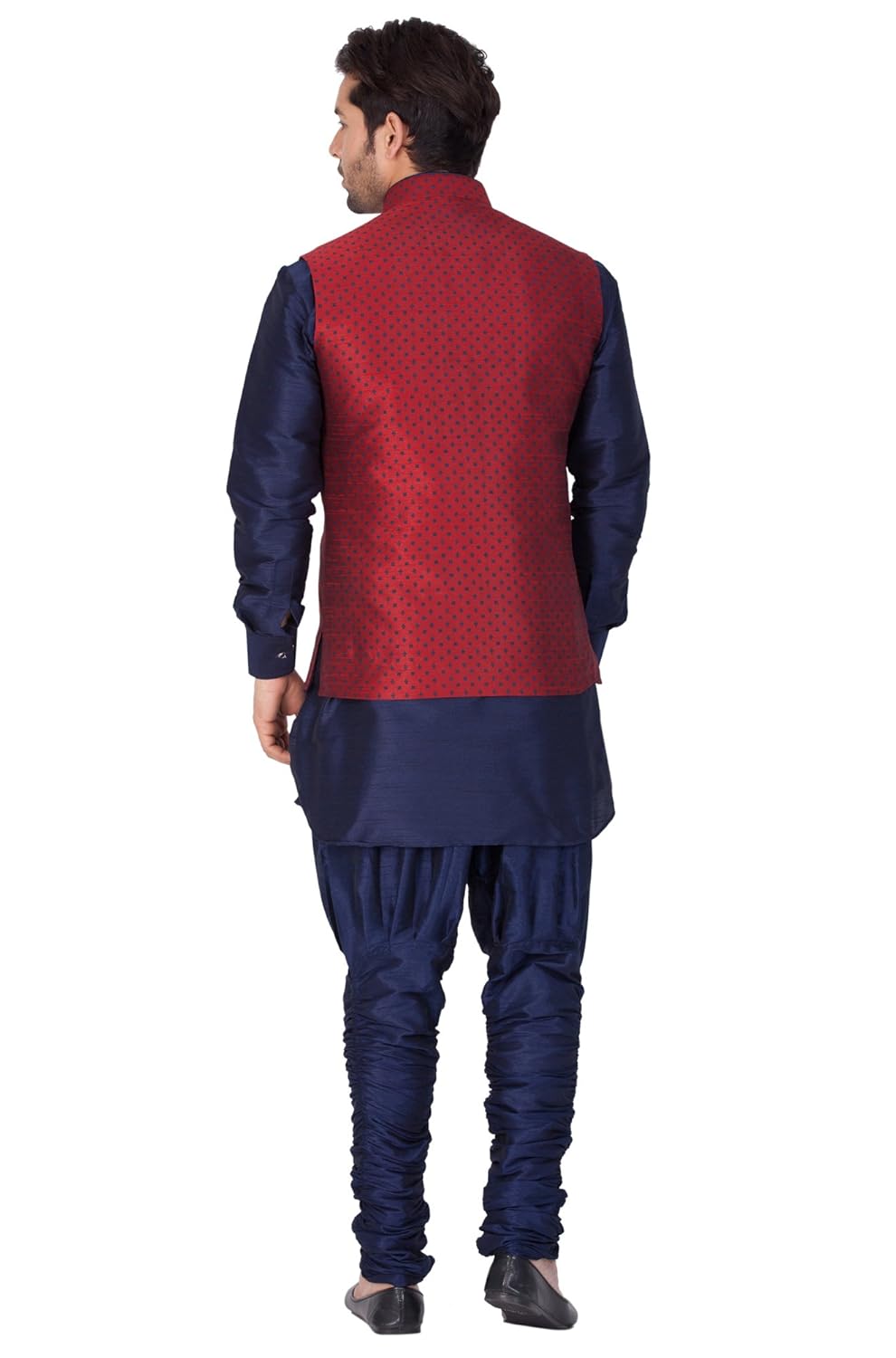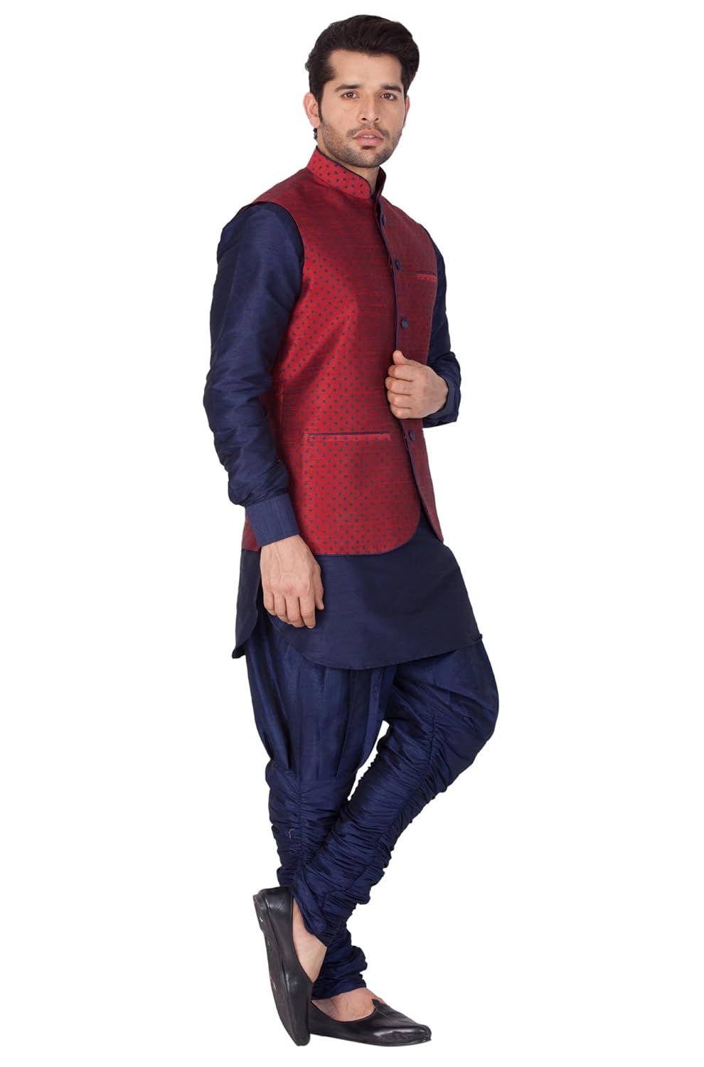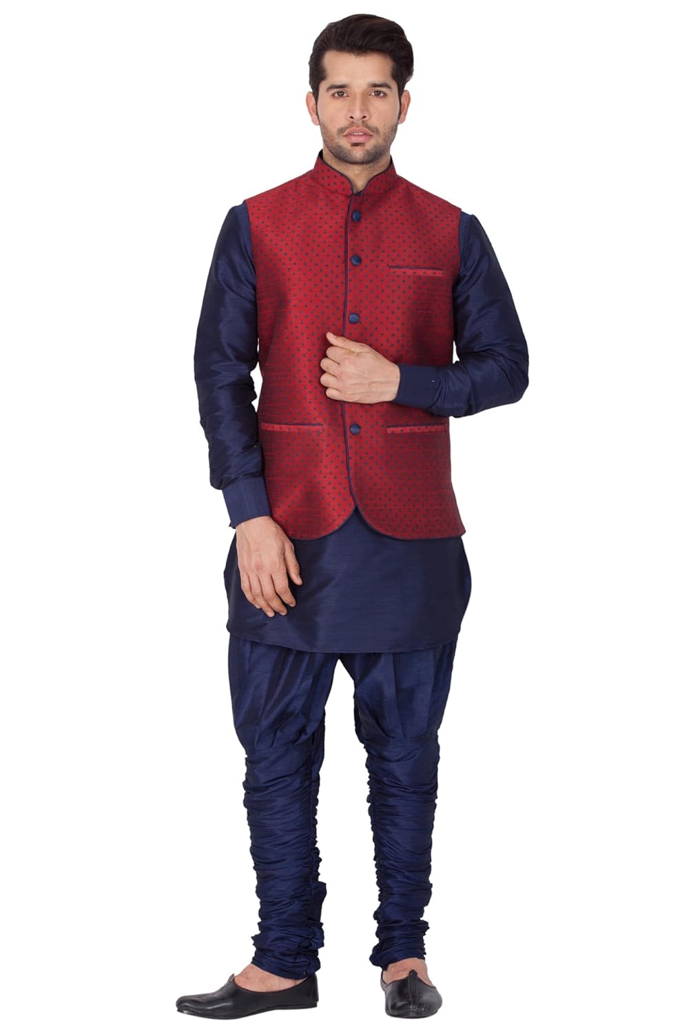 Vastramay brings to you this Stylish yet Comfortable Men Navy Blue Men Cotton Silk Printed Curved Hem Modi Jacket, a Curved Shape Men Cotton Silk Mid Length Kurta With Buttoned Calf paired with a Breedges. Adorn it for a perfect Classy & Trendy look. Pair it with a juti or a mojari for the Royal feel. |