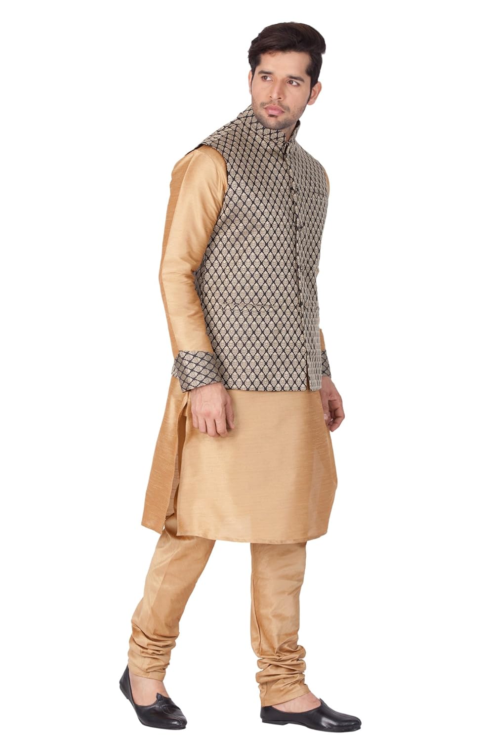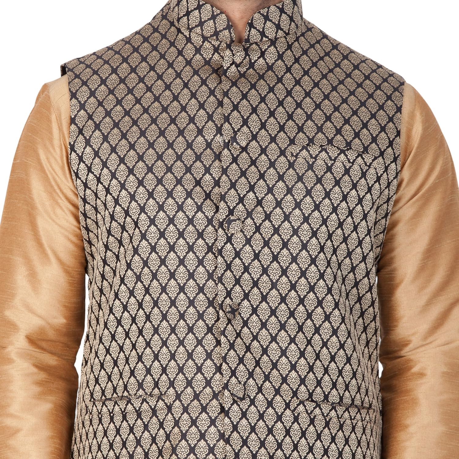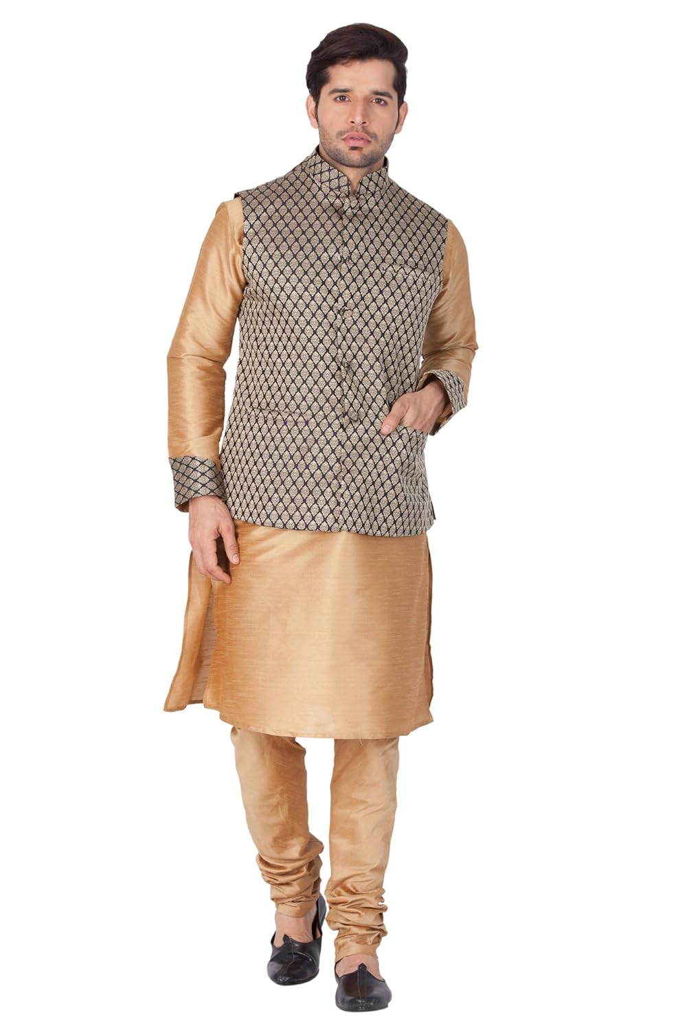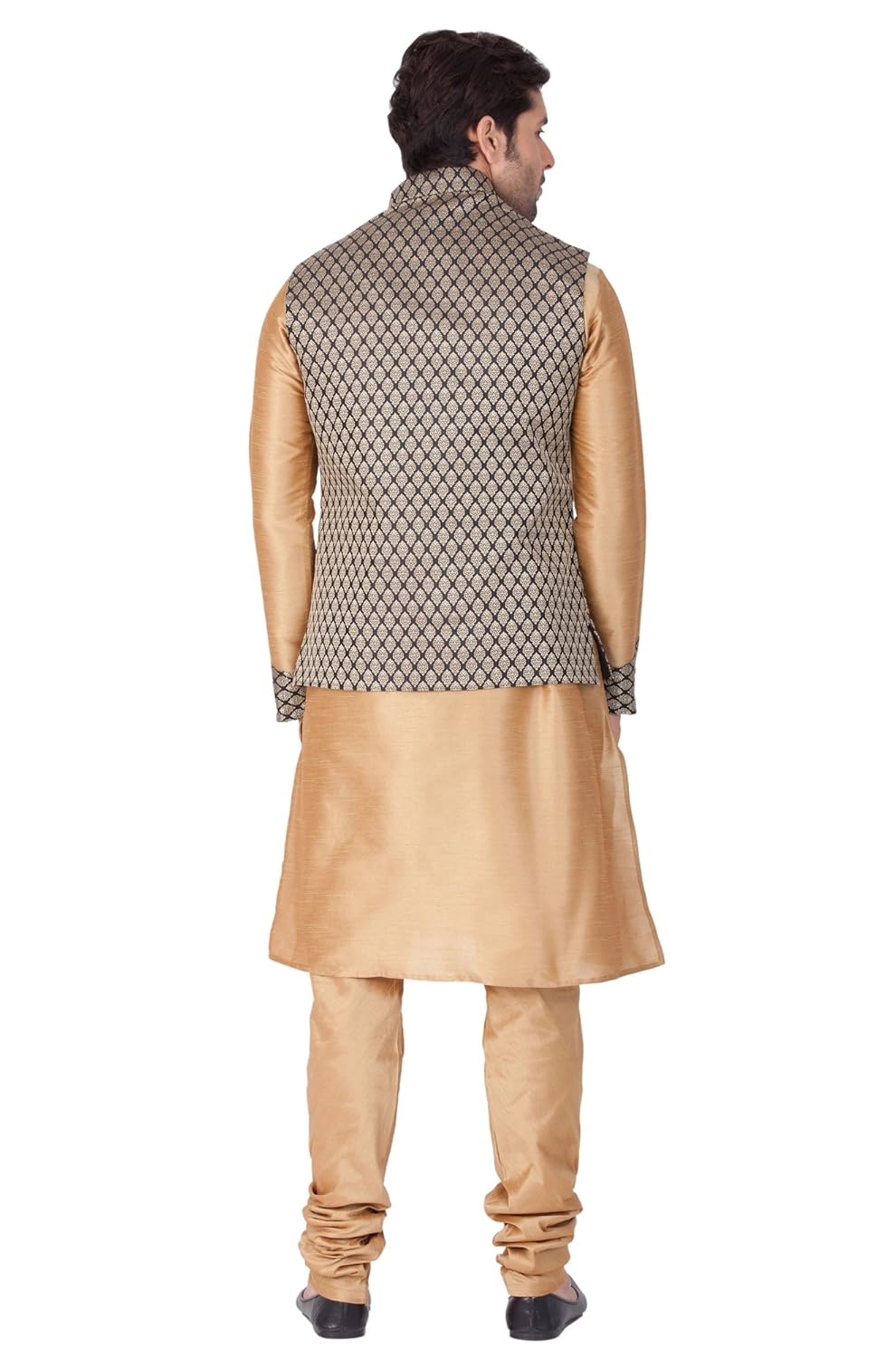 Vastramay brings to you this Stylish yet Comfortable Men Rose Gold Men Banarasi Brocade Woven Jaquard Modi Jacket, a Kurta With Banarasi Brocade Collar, Placket and Cuff paired with a Churidar Pyjama Set. Adorn it for a perfect Classy & Trendy look. Pair it with a juti or a mojari for the Royal feel. |