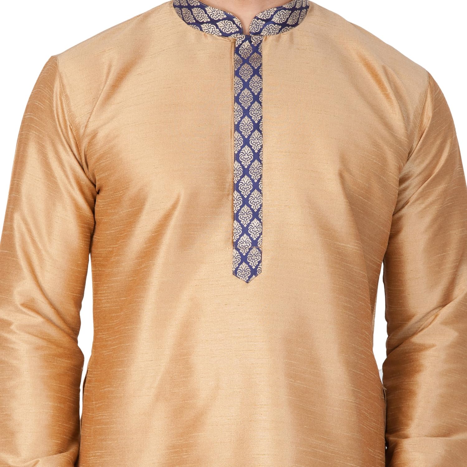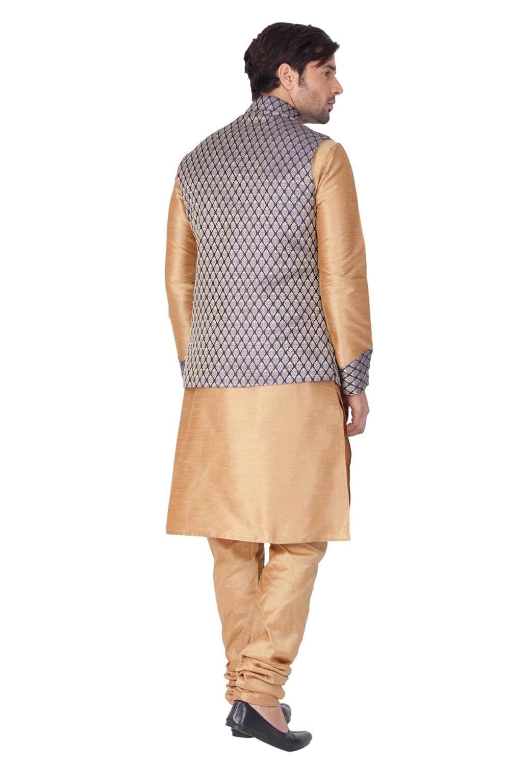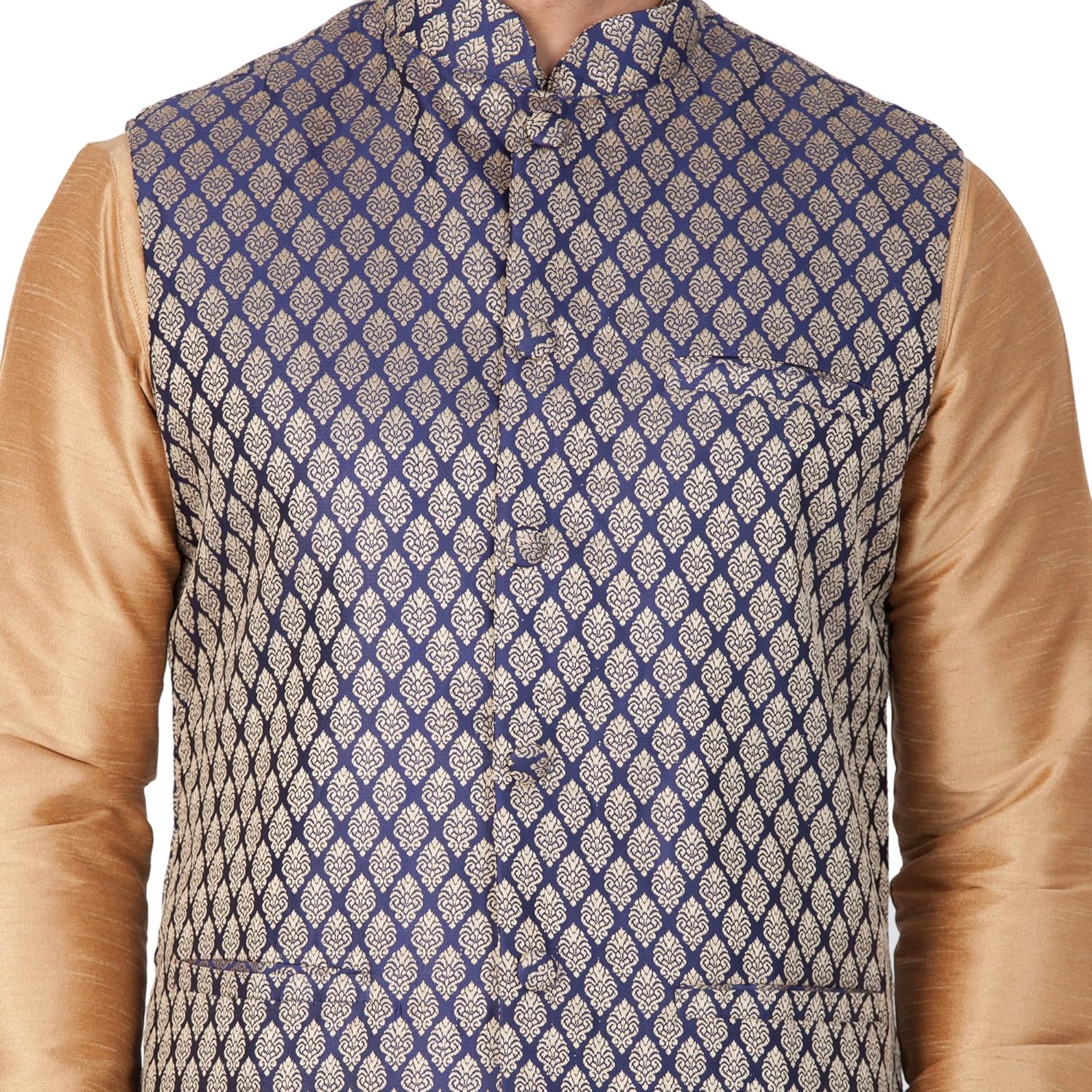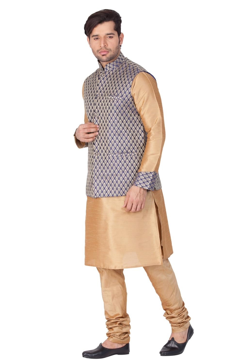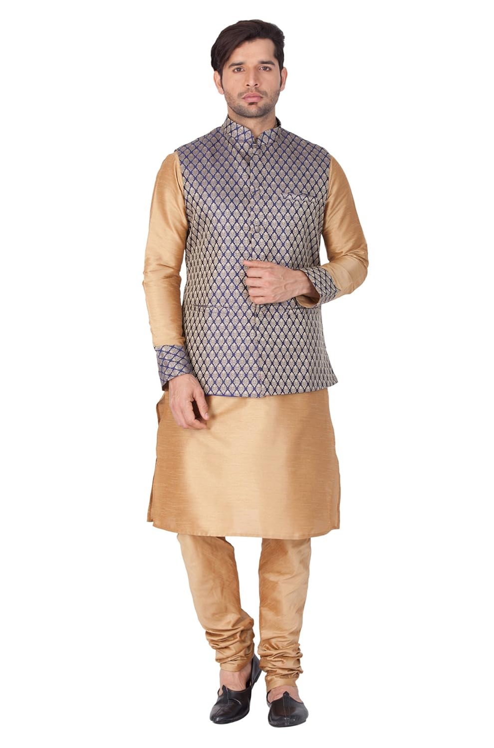 Vastramay brings to you this Stylish yet Comfortable Men Rose Gold Men Banarasi Brocade Woven Jaquard Modi Jacket, Kurta With Banarasi Brocade Collar, Placket and Cuff paired with a Churidar Pyjama Set. Adorn it for a perfect Classy & Trendy look. Pair it with a juti or a mojari for the Royal feel. |