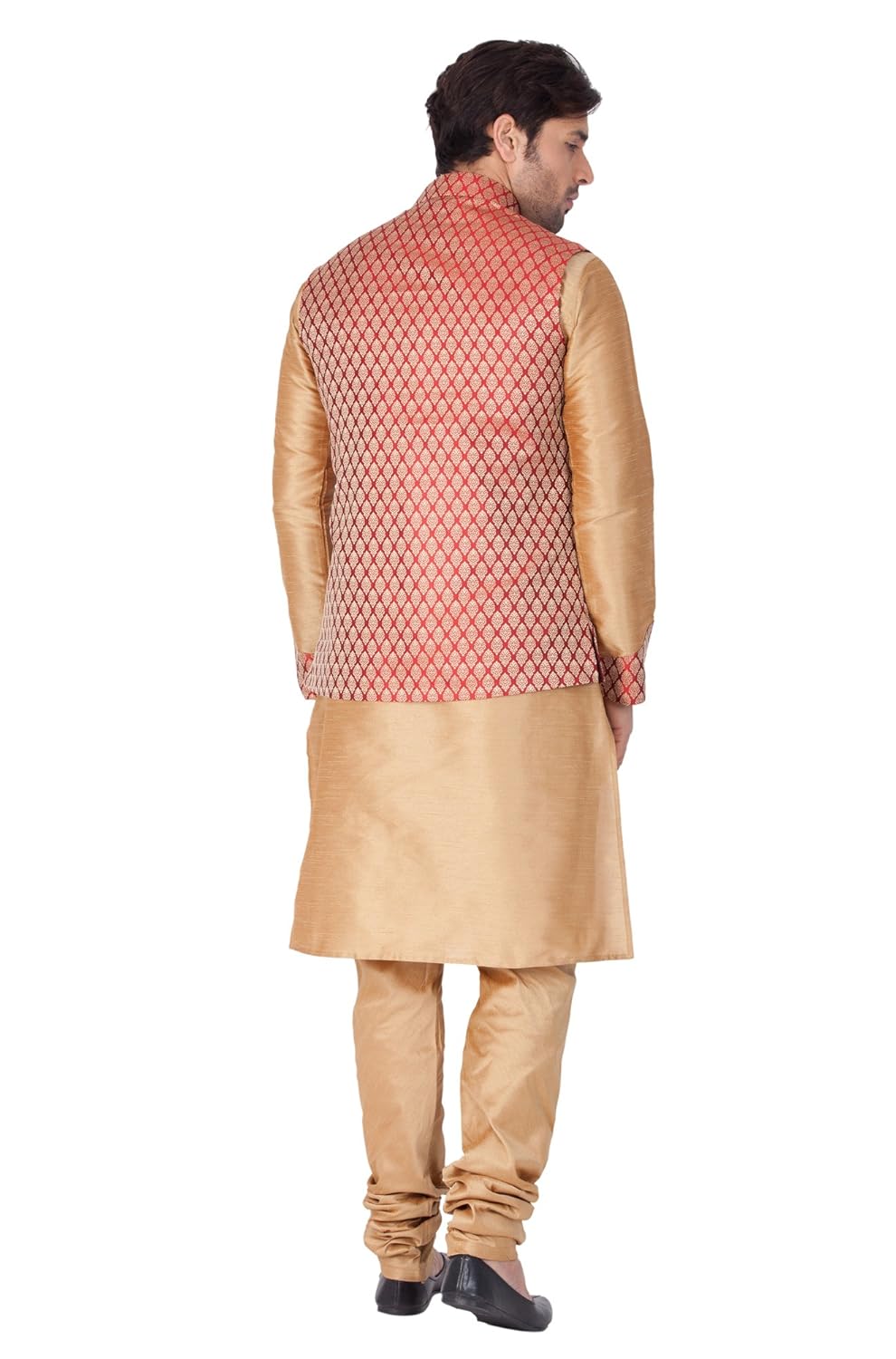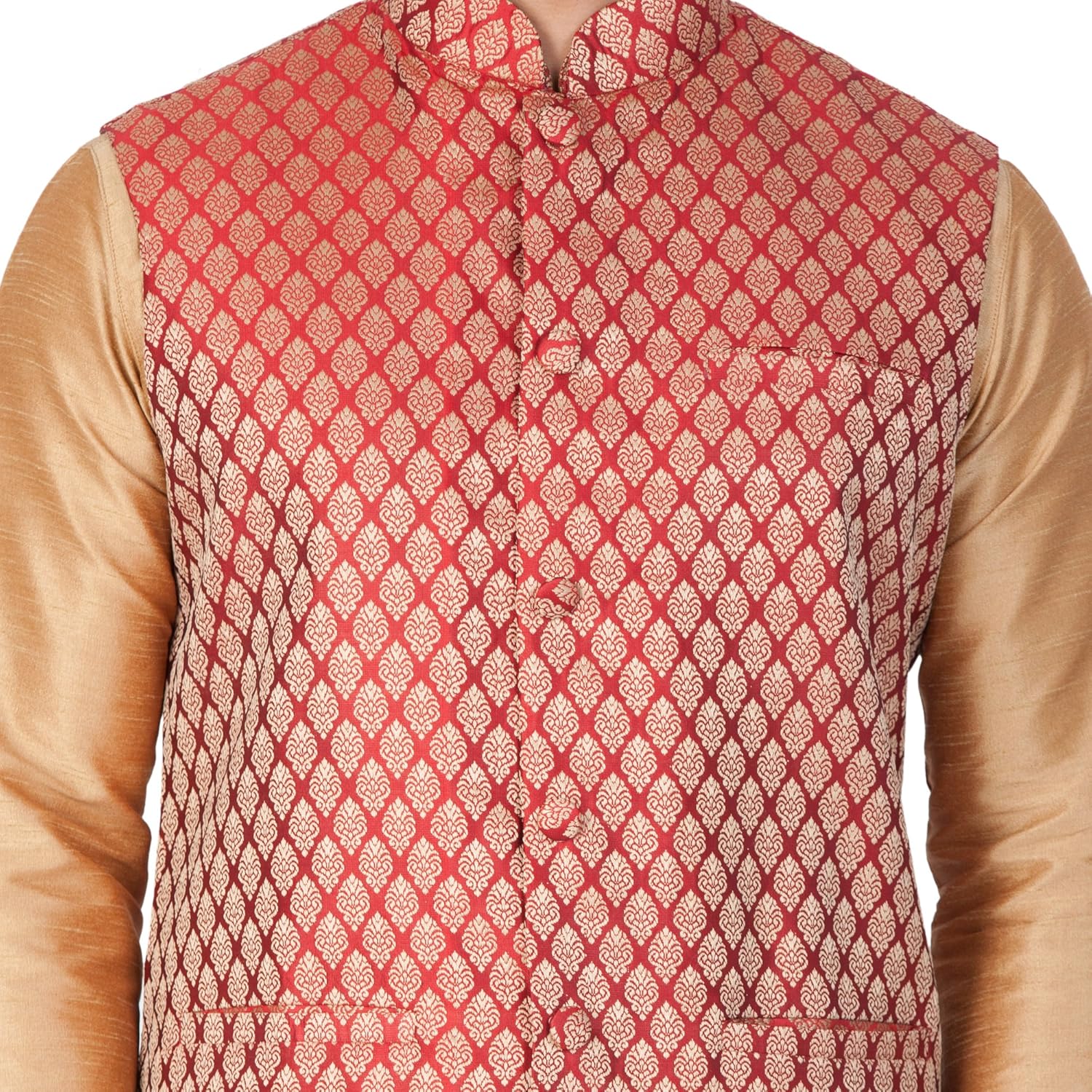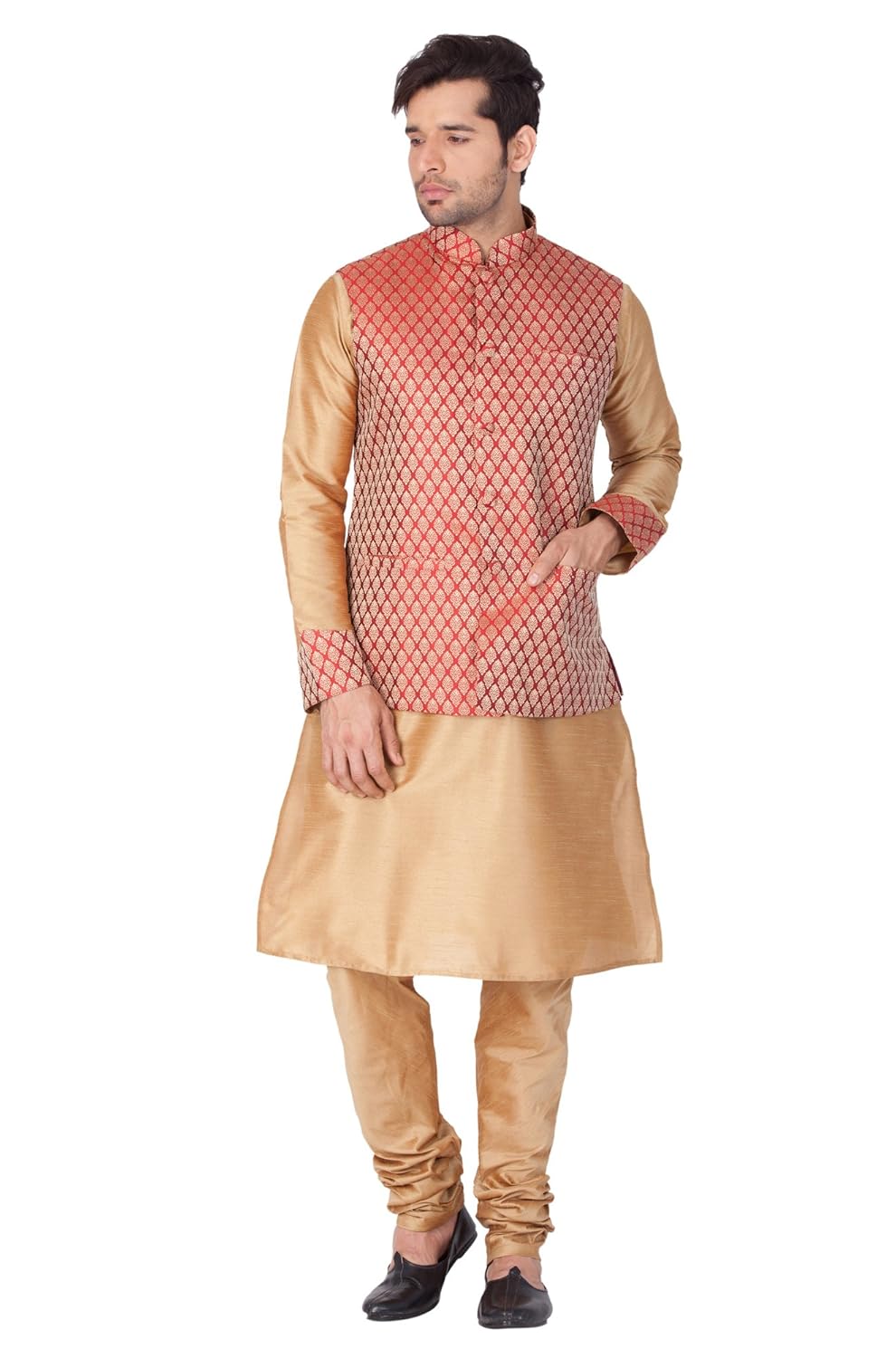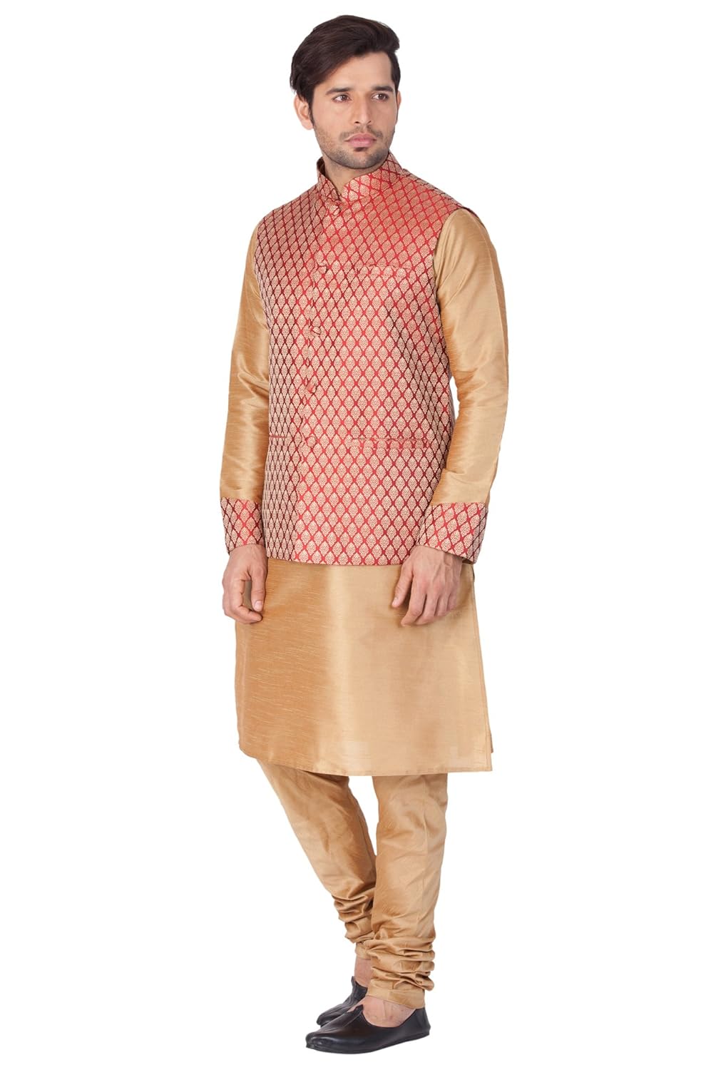 Vastramay brings to you this Stylish yet Comfortable Men Rose Gold Men Banarasi Brocade Woven Jaquard Modi Jacket, a Kurta With Banarasi Brocade Collar, Placket and Cuff paired with a Churidar Pyjama Set. Adorn it for a perfect Classy & Trendy look. Pair it with a juti or a mojari for the Royal feel. |