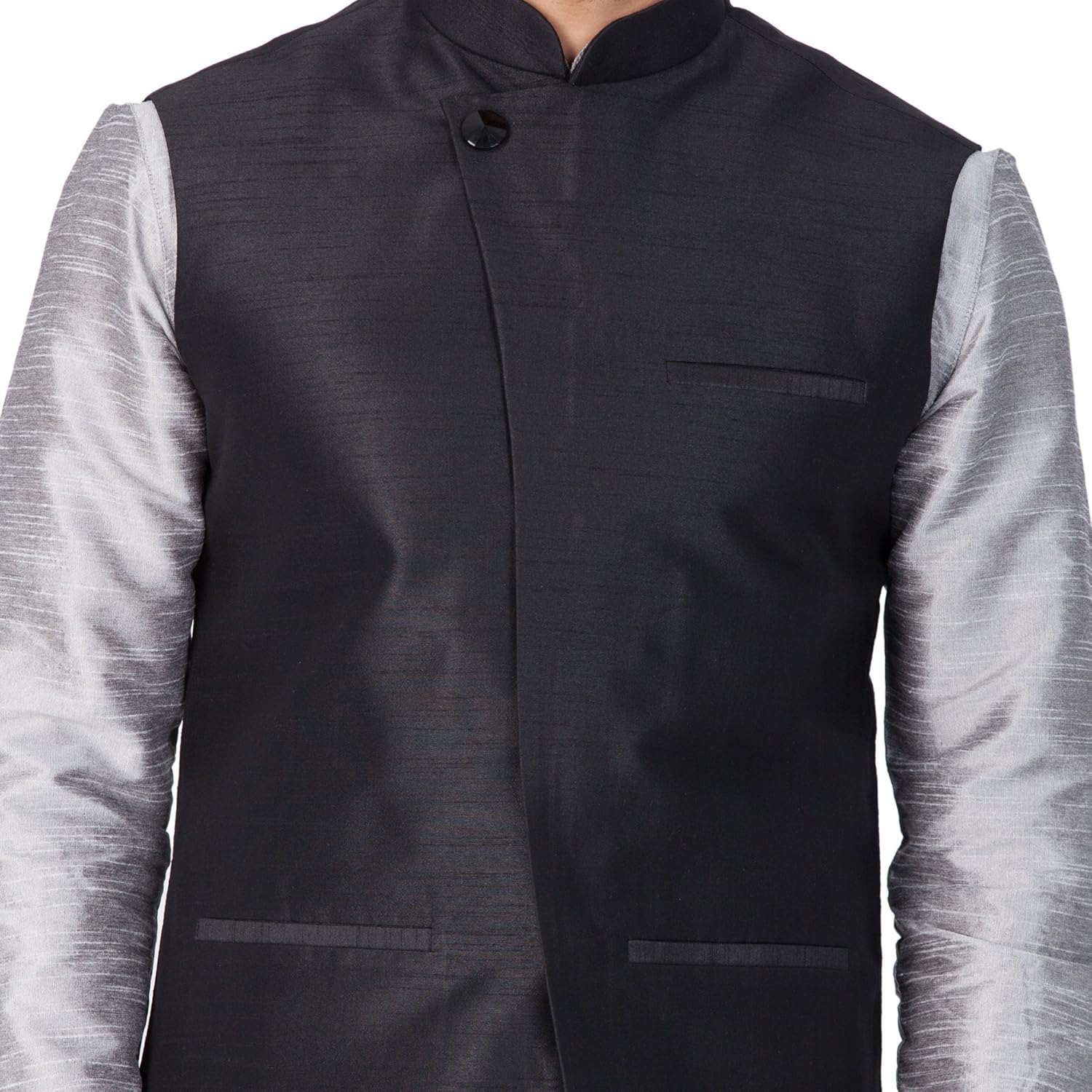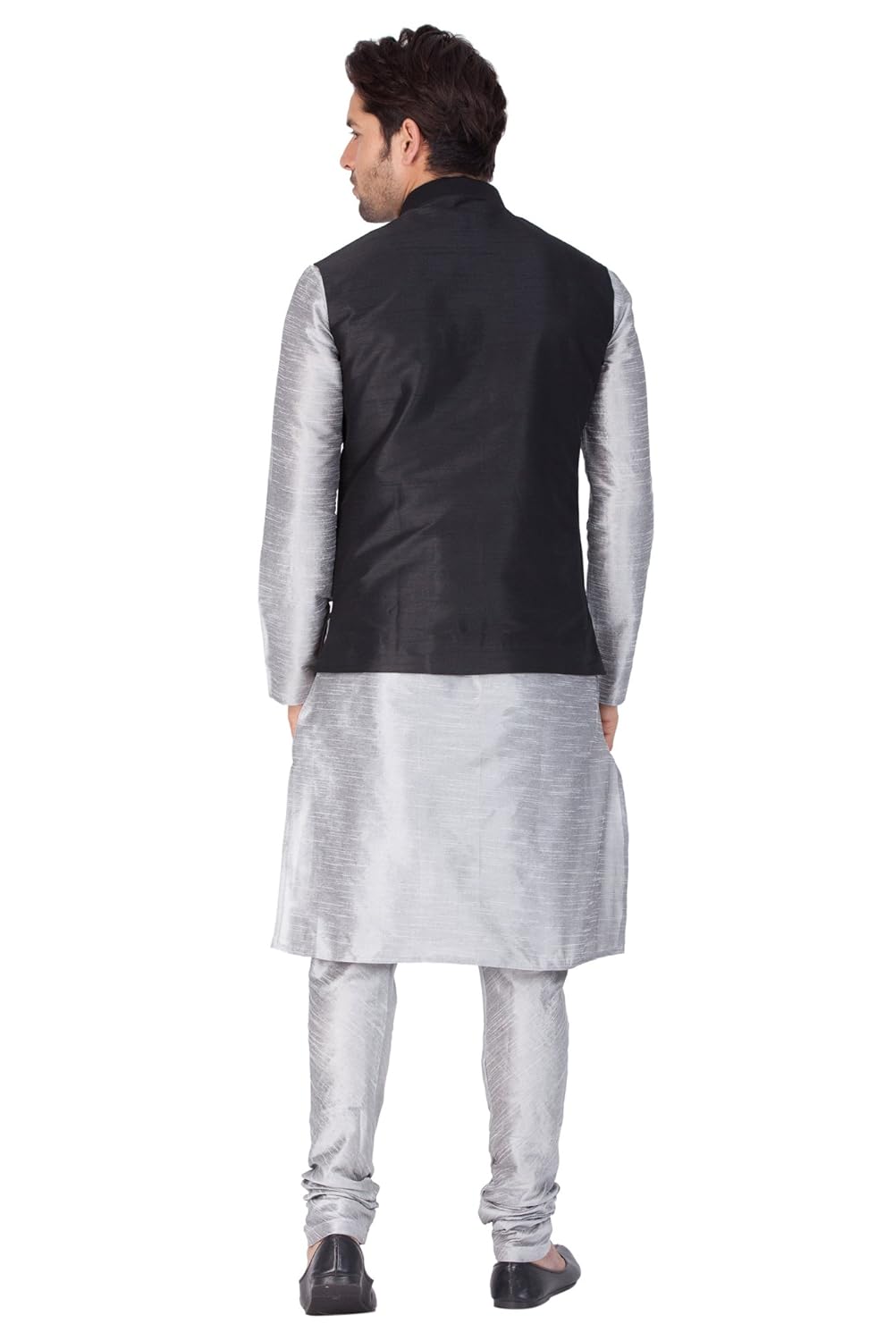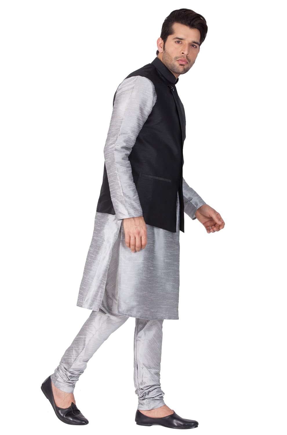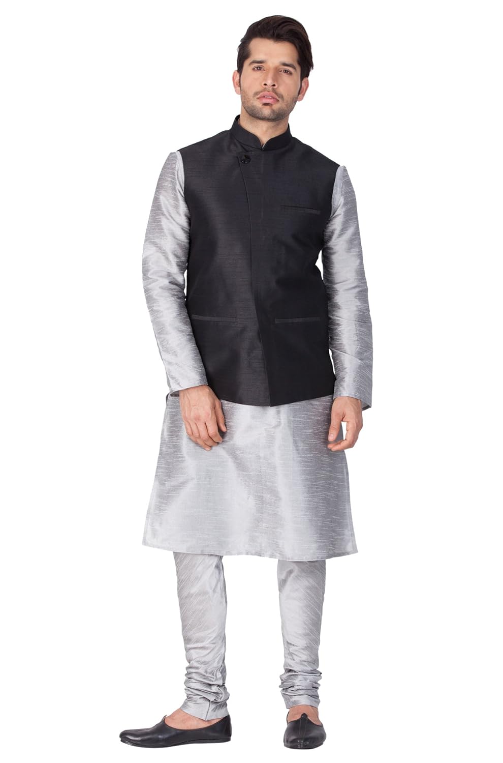 Vastramay brings to you this Stylish yet Comfortable Men Grey Men Cotton Silk Angrakha Style Modi Jacket with a Broche Button, a Cotton Silk Solid Kurta and Churidar Pyjama Set. Adorn it for a perfect Classy & Trendy look. Pair it with a juti or a mojari for the Royal feel. |