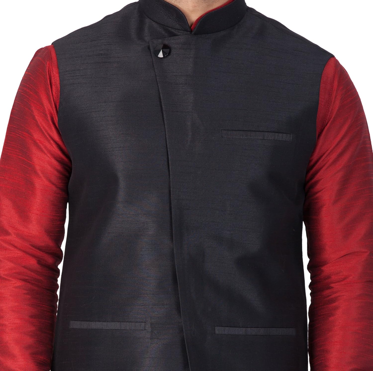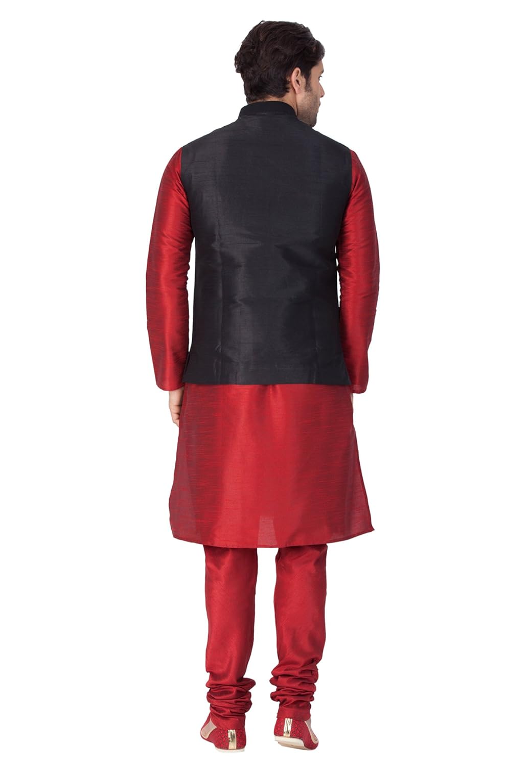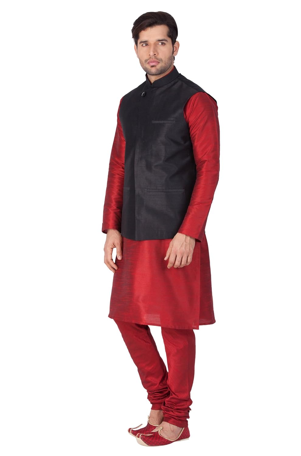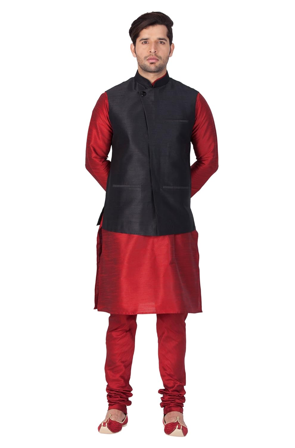 Vastramay brings to you this Stylish yet Comfortable Men Maroon Men Cotton Silk Angrakha Style Modi Jacket with a Broche Button, a Cotton Silk Solid Kurta and Churidar Pyjama Set. Adorn it for a perfect Classy & Trendy look. Pair it with a juti or a mojari for the Royal feel. |