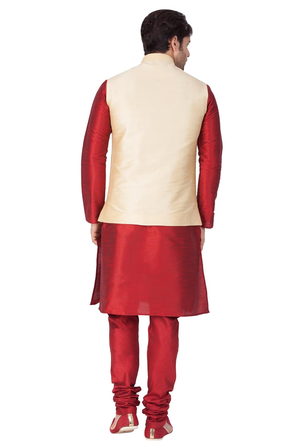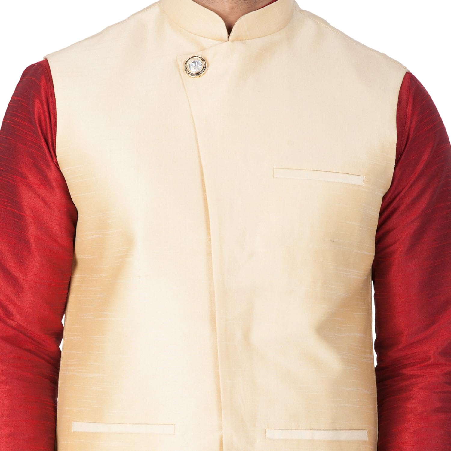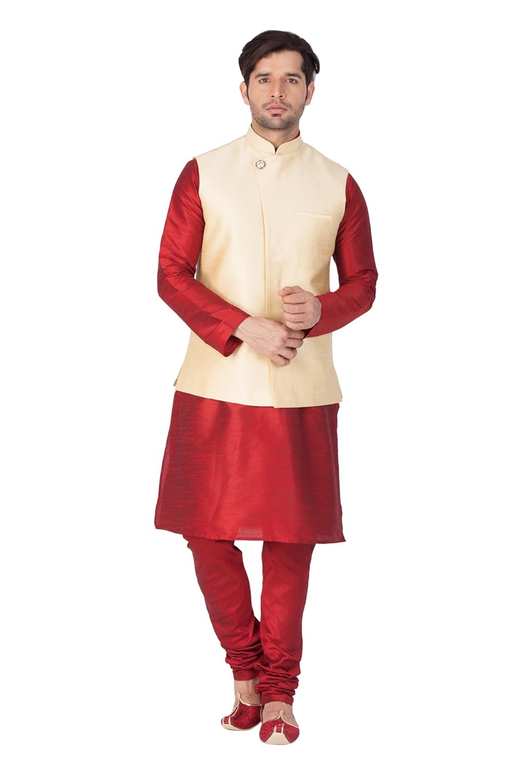 Vastramay brings to you this Stylish yet Comfortable Men Maroon Men Cotton Silk Angrakha Style Modi Jacket with a Broche Button, a Cotton Silk Solid Kurta and Churidar Pyjama Set. Adorn it for a perfect Classy & Trendy look. Pair it with a juti or a mojari for the Royal feel. |