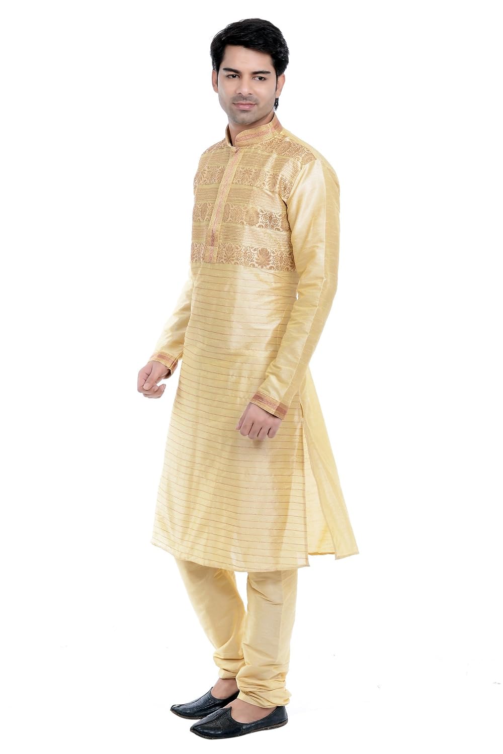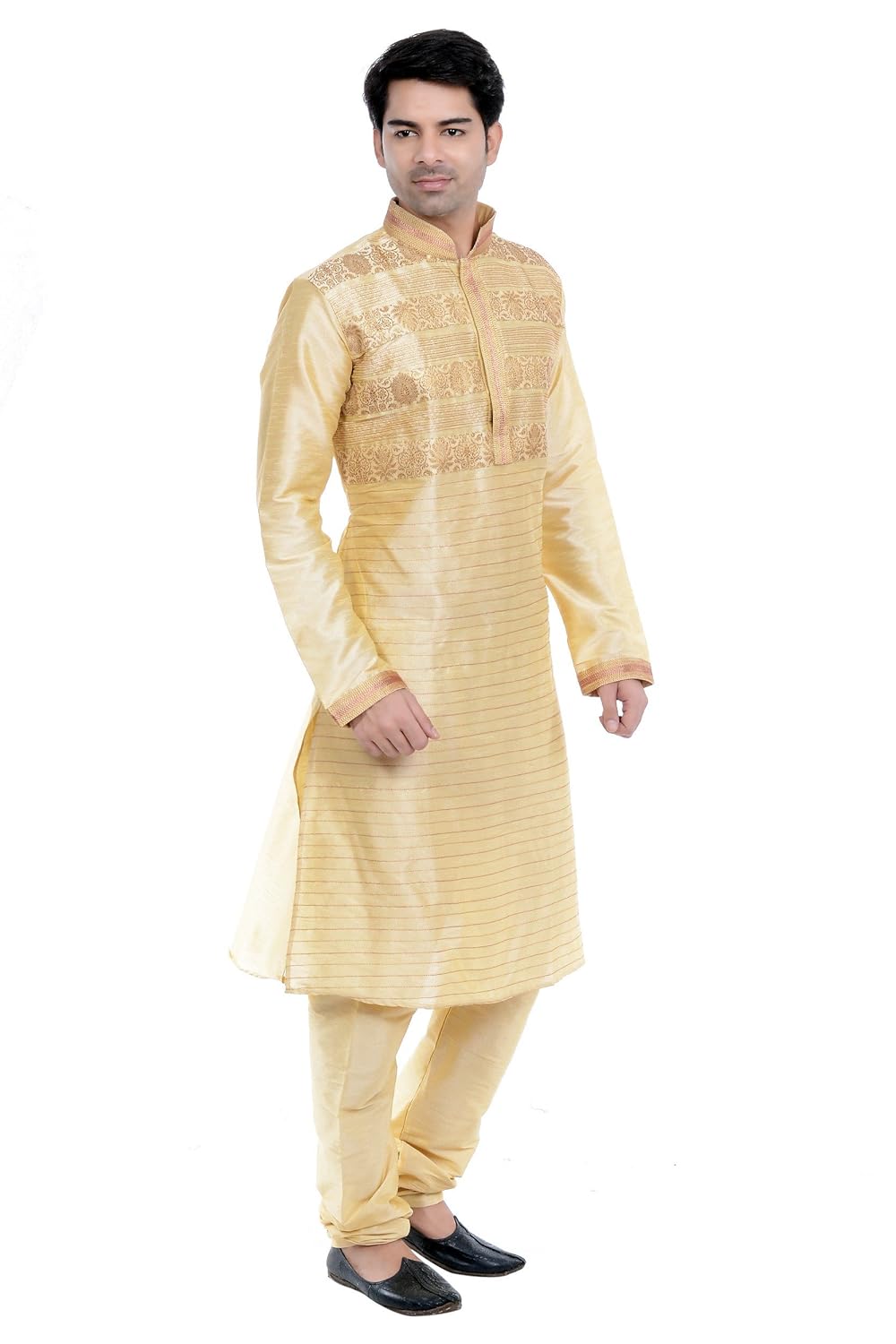 Vastramay presents to you this designer kurta pyjama set. The kurta is designed with inspiration from tradional bengali men outfits. It is a typical jamai babu look kurta. It has Banarasi brocade detailing on the yoke and has chorded stripes all over. Overall the set gives you a relatively heavy look but thankfully it is not heavy to carry! If you pair a dupatta or a dhoti with the set then also it will standout among the crowd and we are sure will attract the envy of your friends and cousins. |